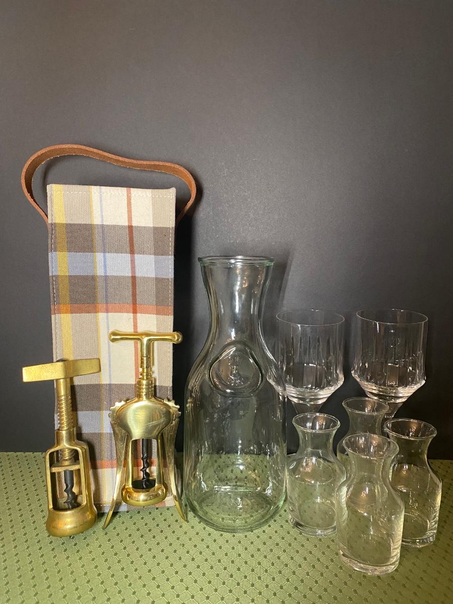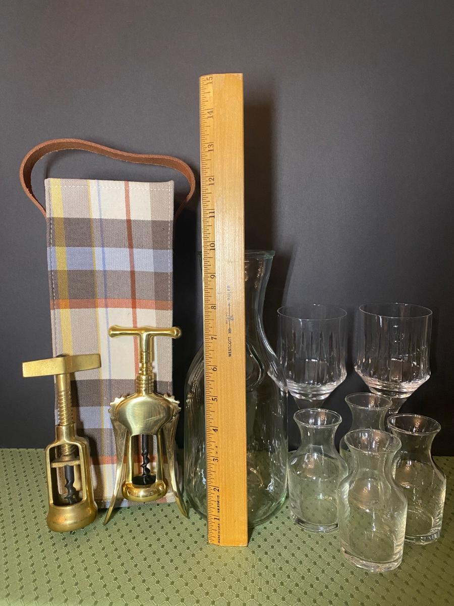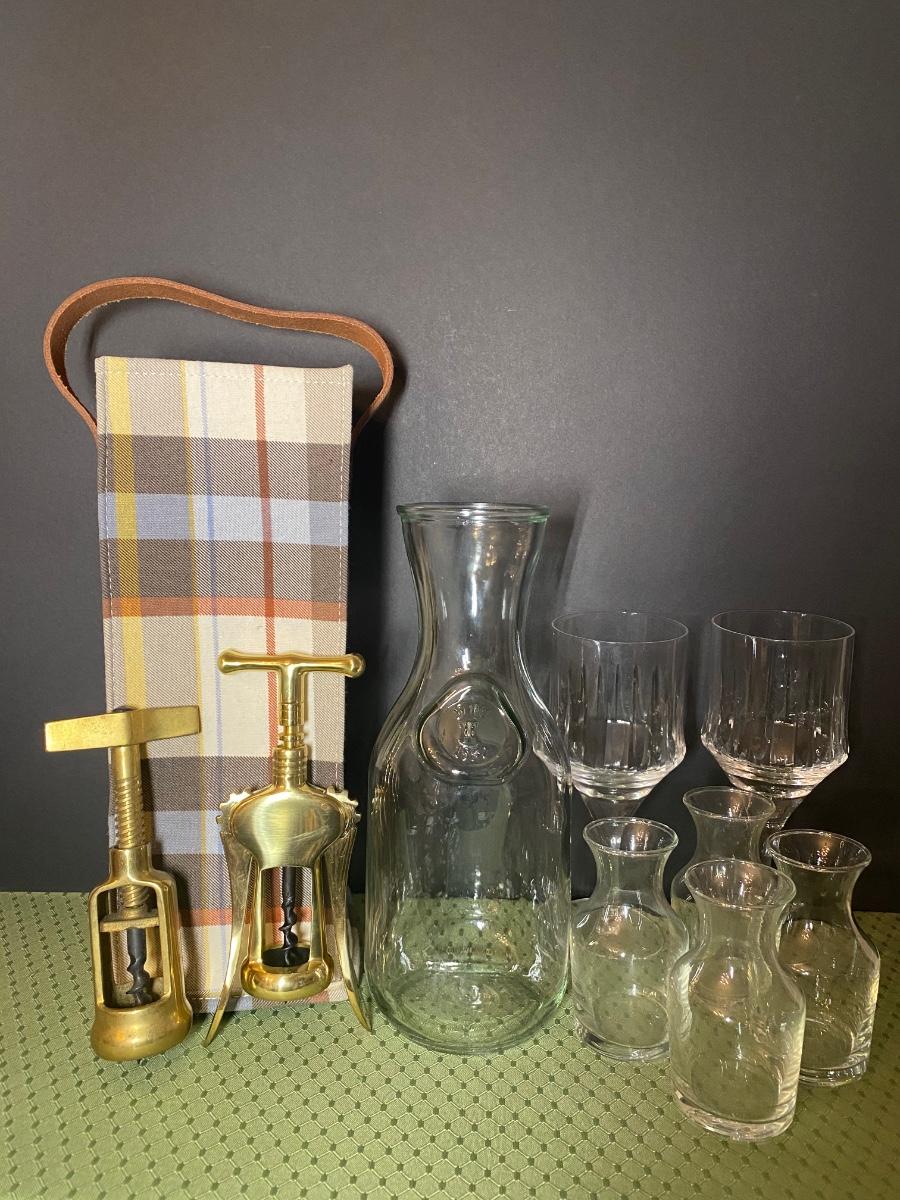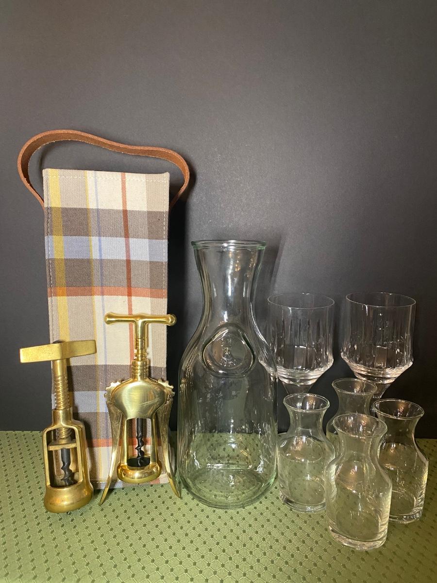 LOT 78C: Wine Bottle Holder, Glass Carafe, Brass Bottle Openers and More