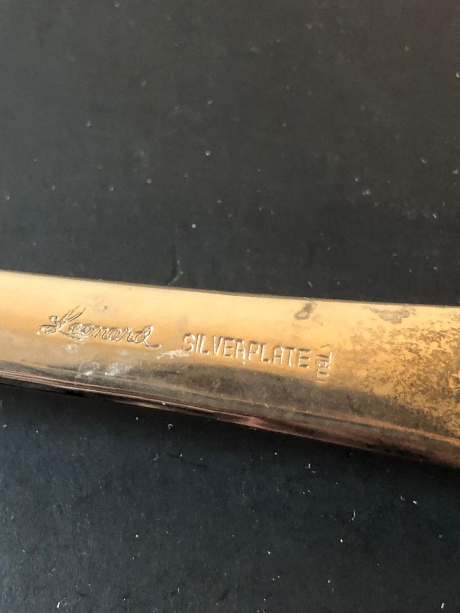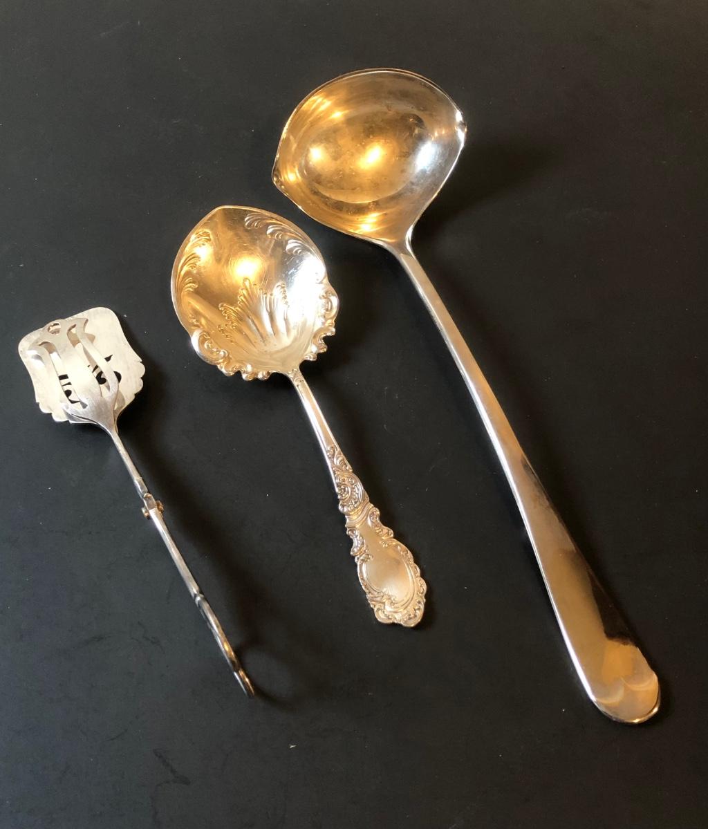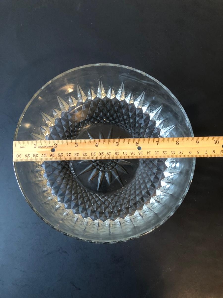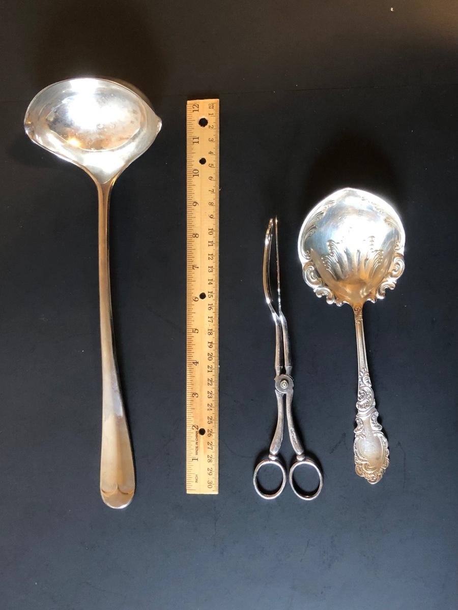 Two cut glass punch bowls and a meat service platter. Includes a detailed antique Roger SS Hamilton serving spoon, a Leonard silver plate ladle, and Sheffield silver plate tongs.