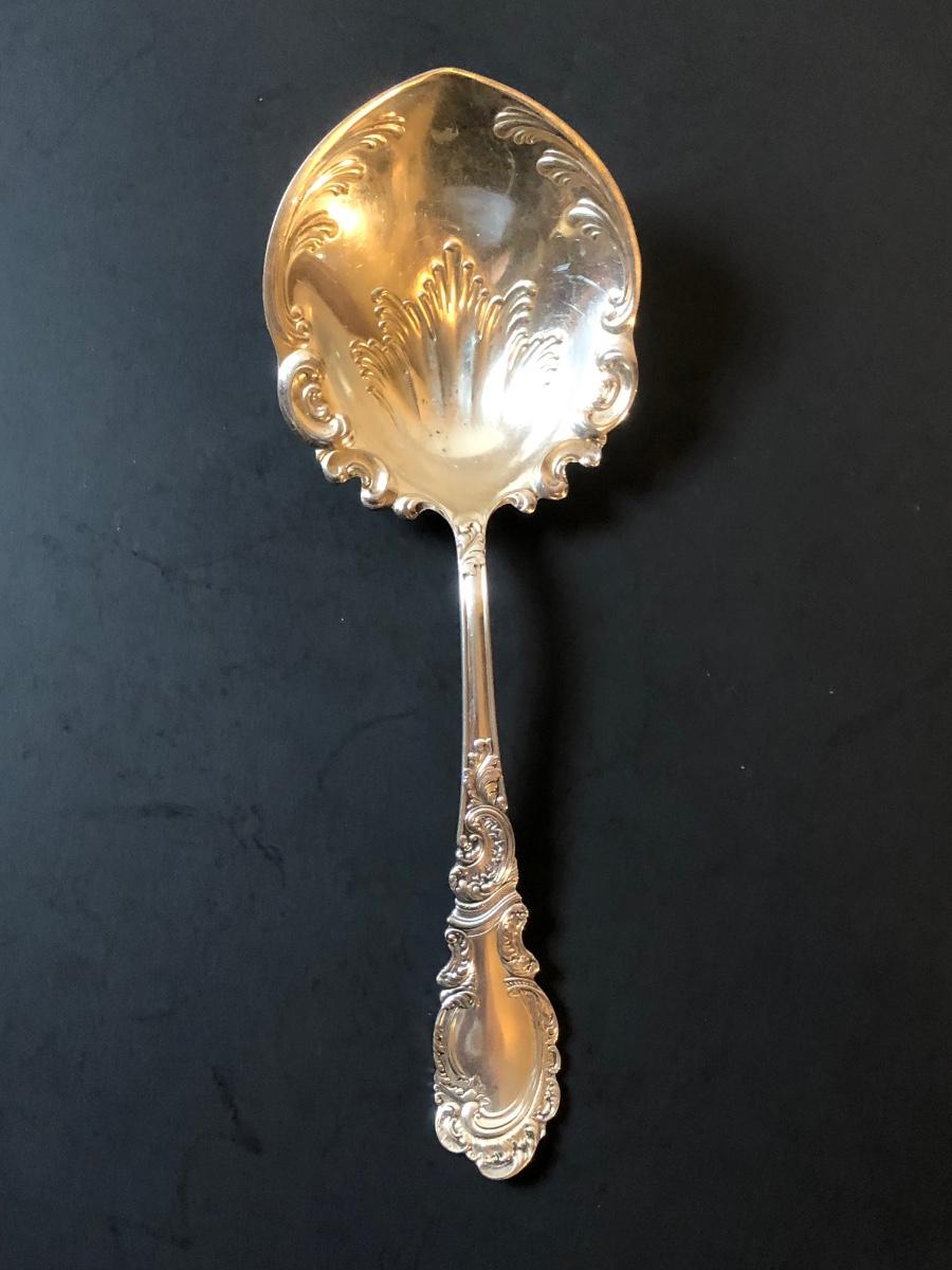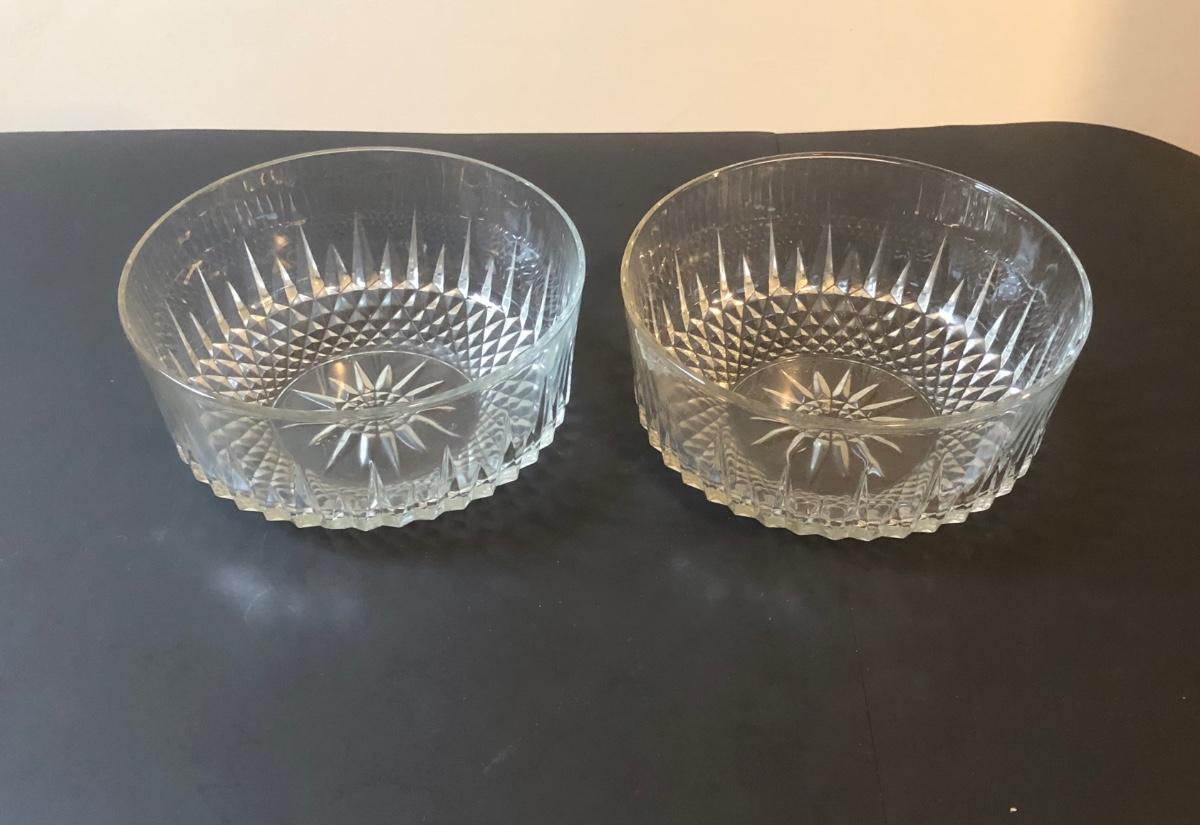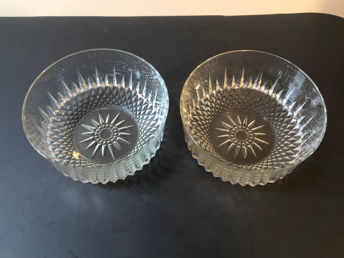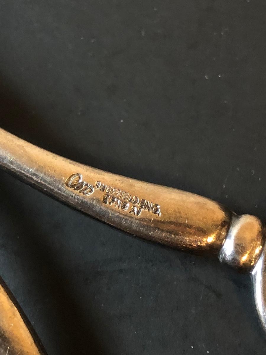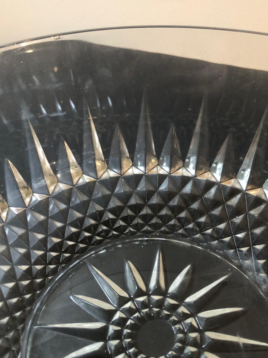 Two cut glass punch bowls and a meat service platter. Includes a detailed antique Roger SS Hamilton serving spoon, a Leonard silver plate ladle, and Sheffield silver plate tongs.