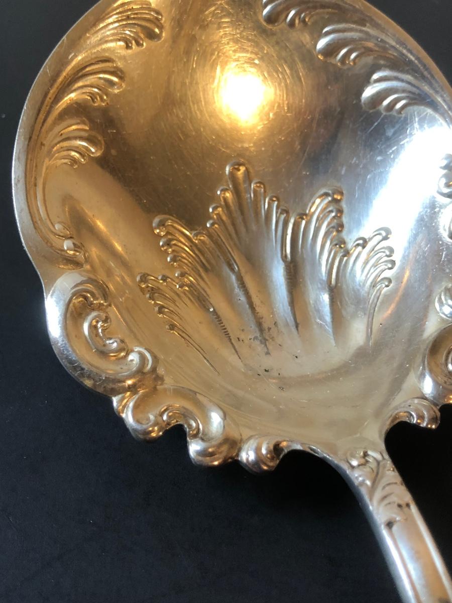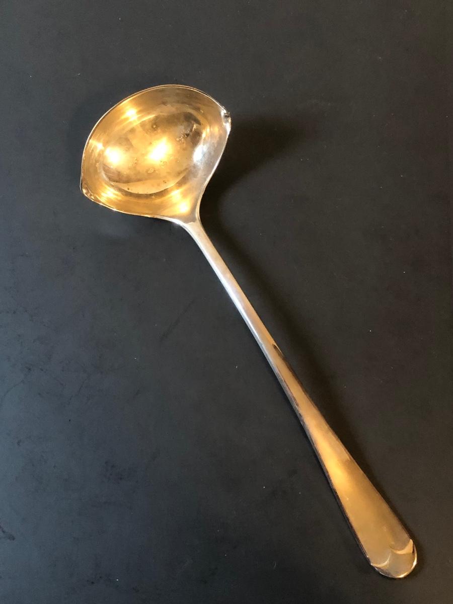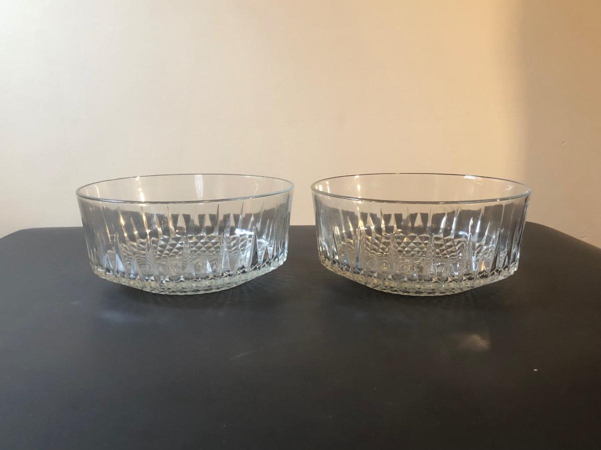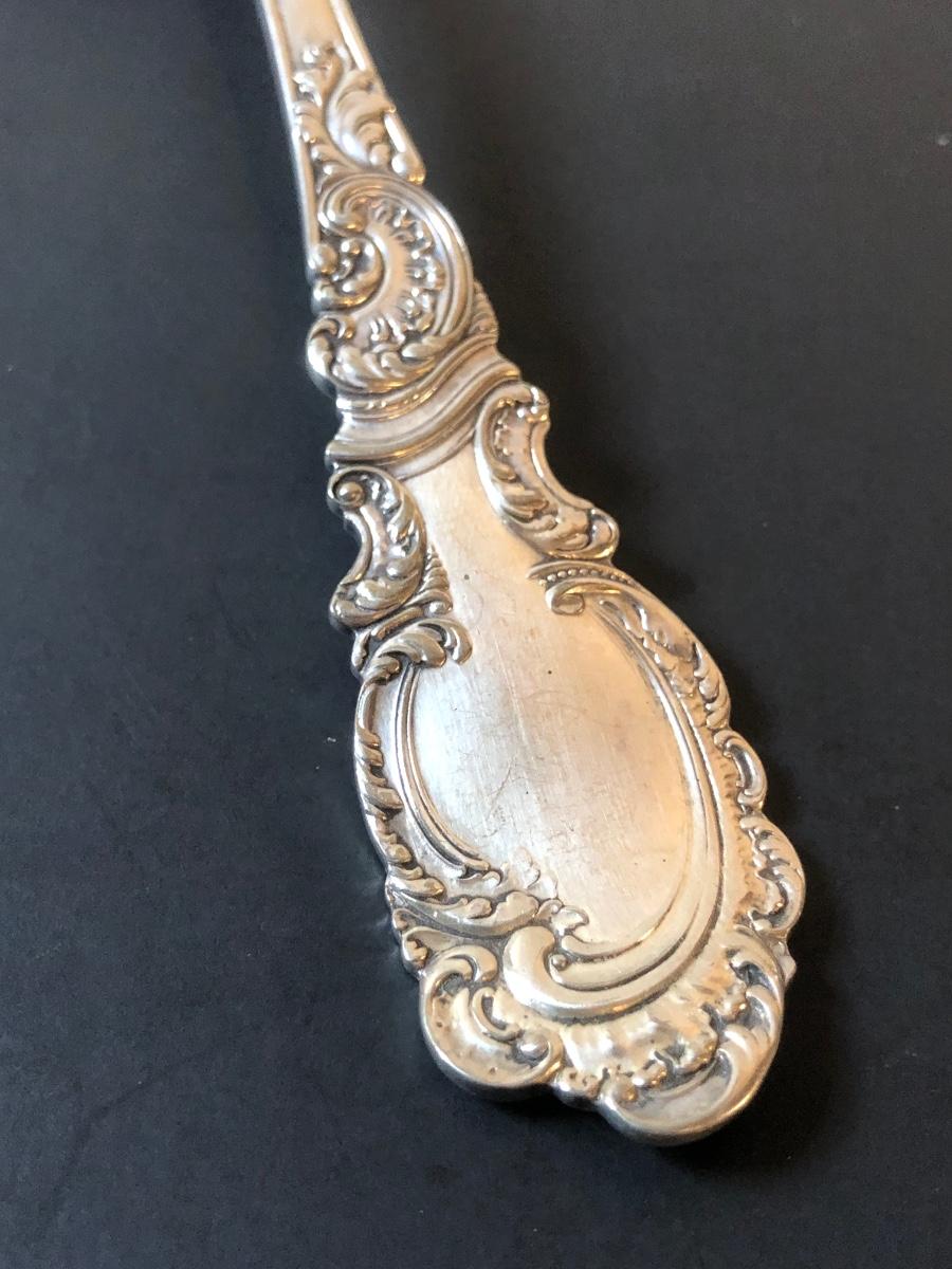 Two cut glass punch bowls and a meat service platter. Includes a detailed antique Roger SS Hamilton serving spoon, a Leonard silver plate ladle, and Sheffield silver plate tongs.