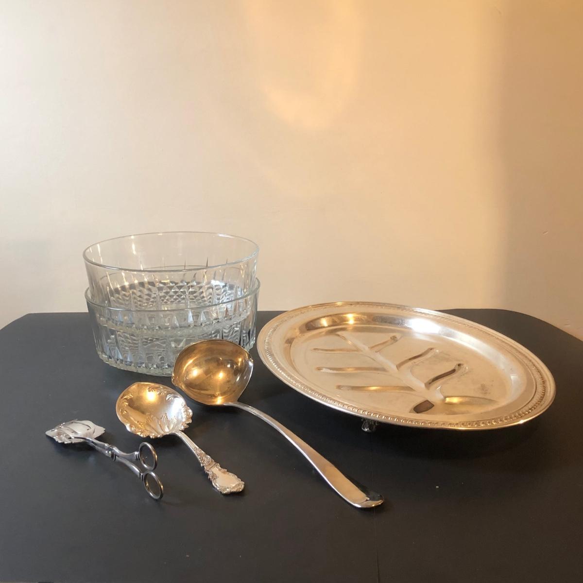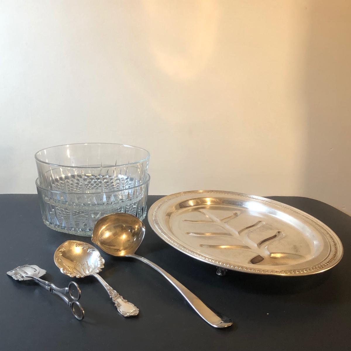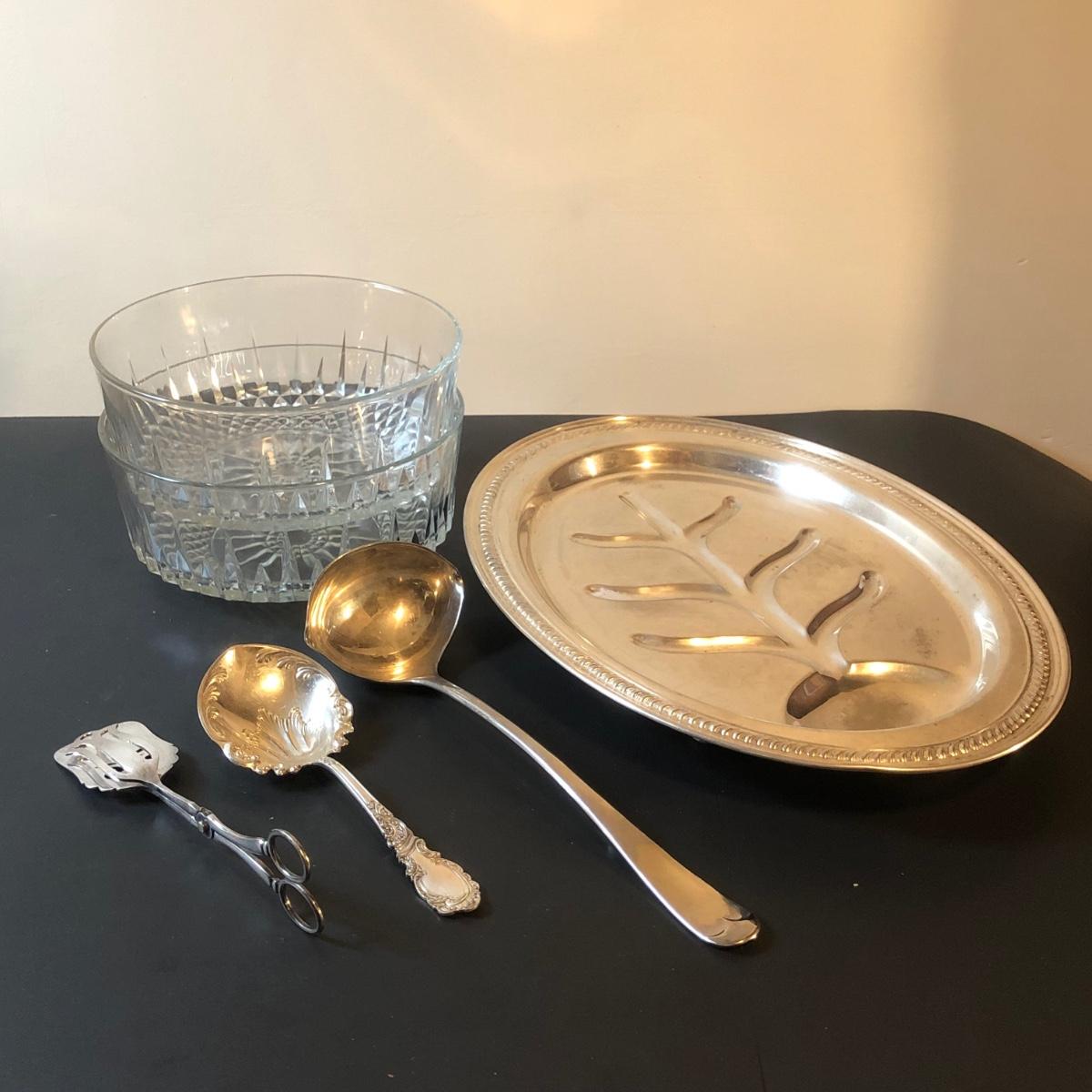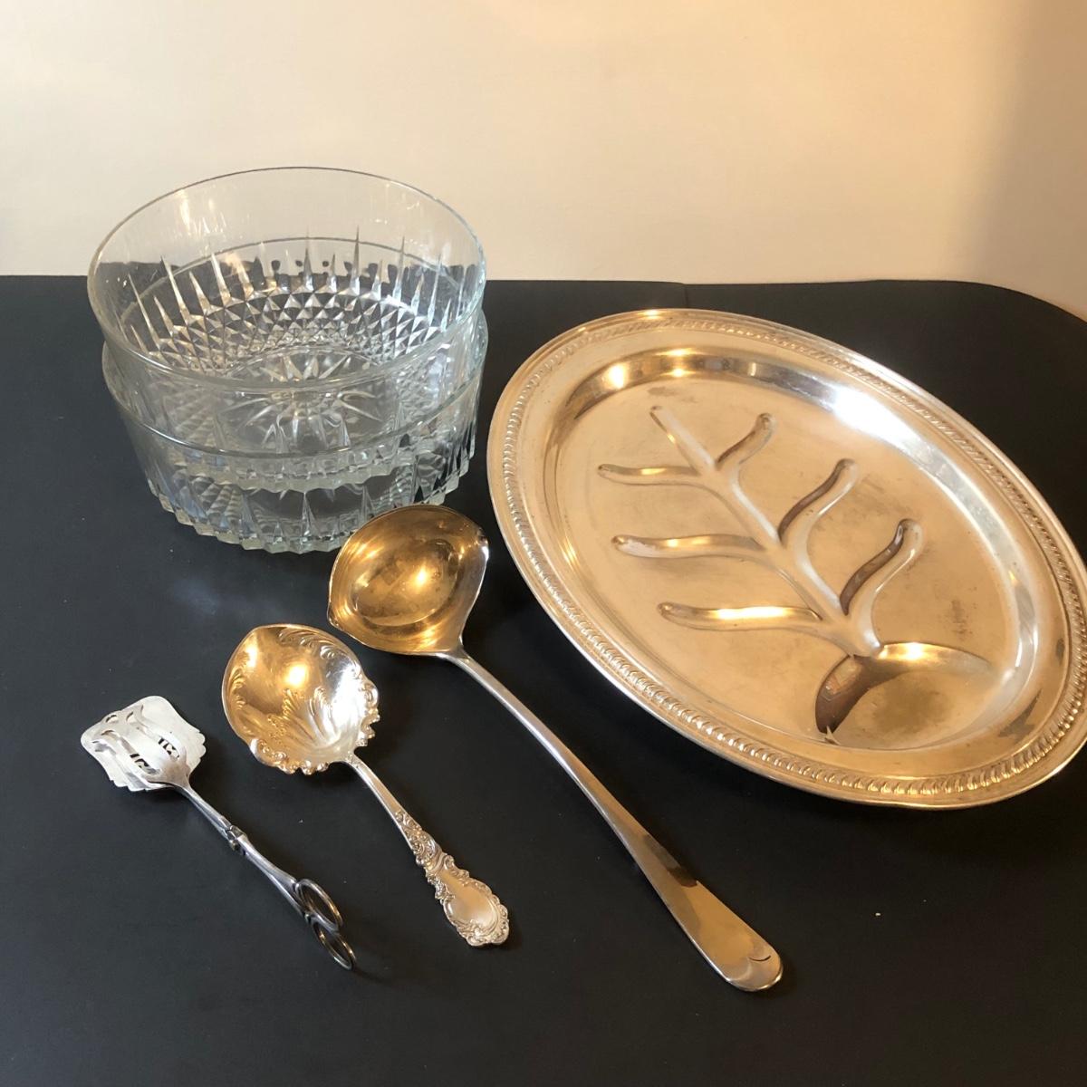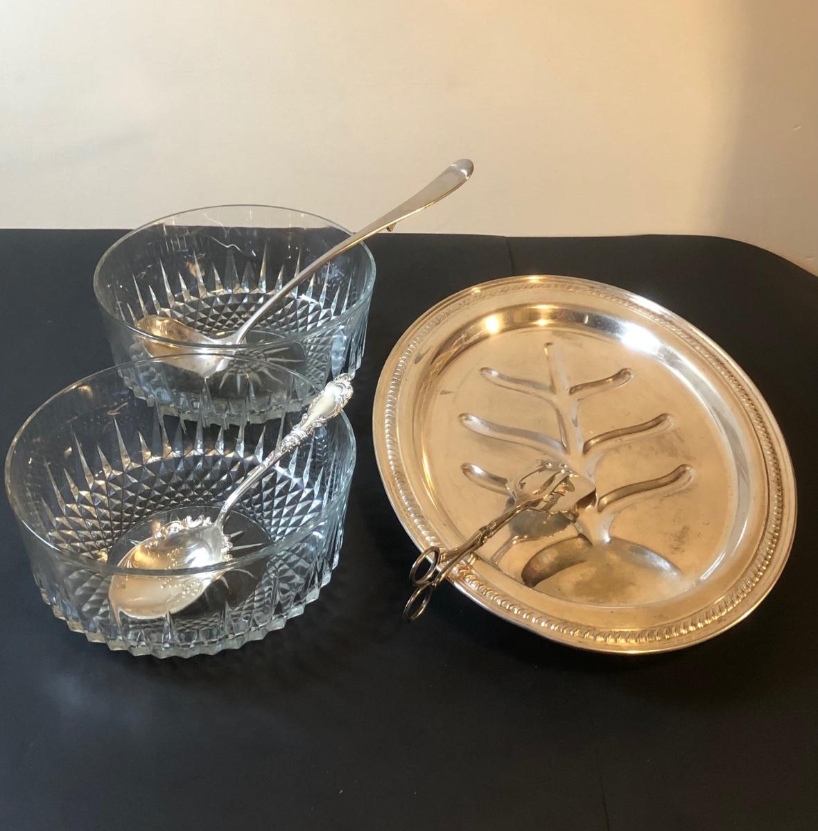 LOT92M: Cut Glass Punch Bowls, Silver Plate Serving Utensils & Meat Service Platter