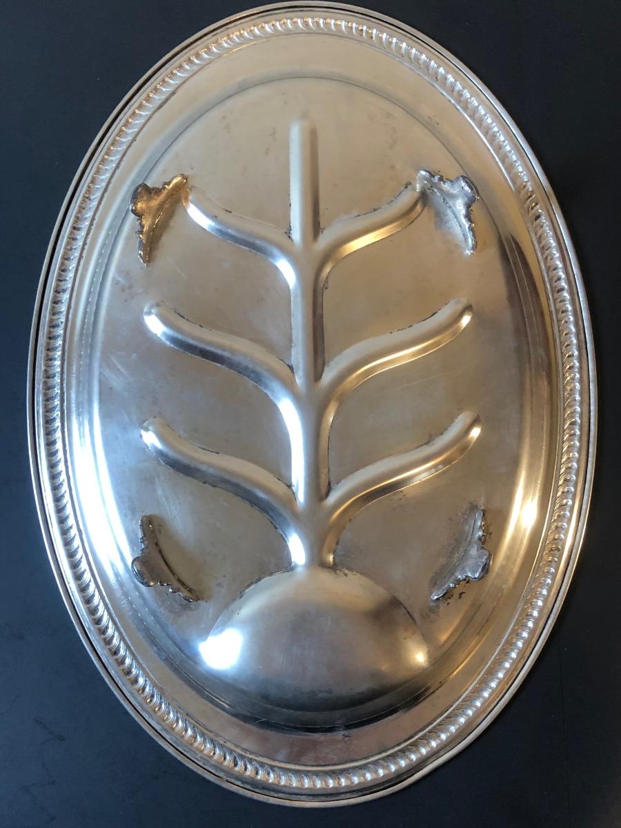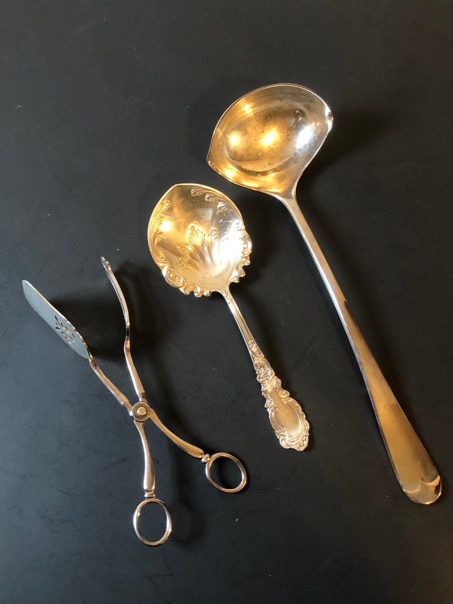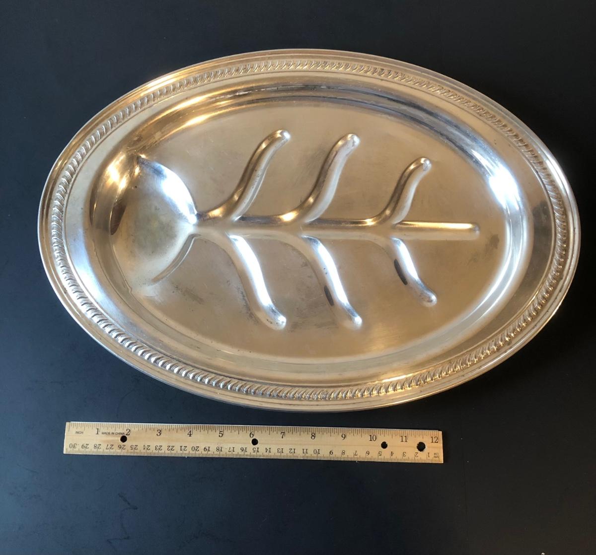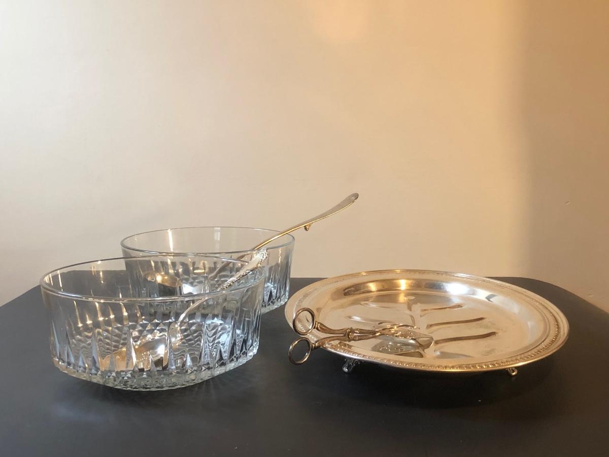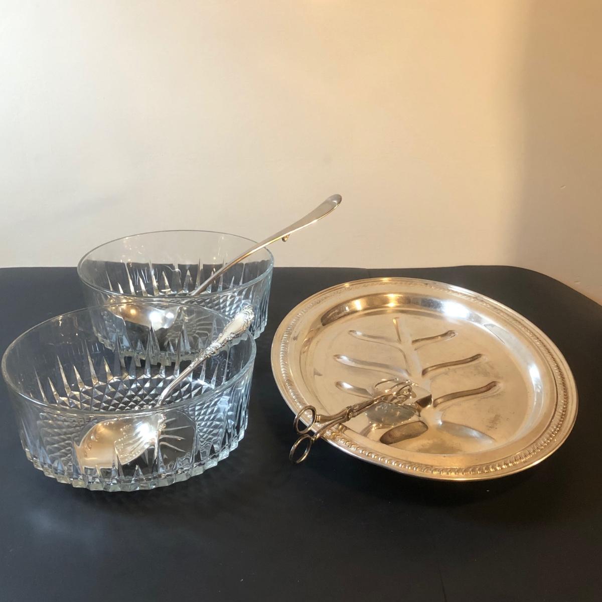 LOT92M: Cut Glass Punch Bowls, Silver Plate Serving Utensils & Meat Service Platter