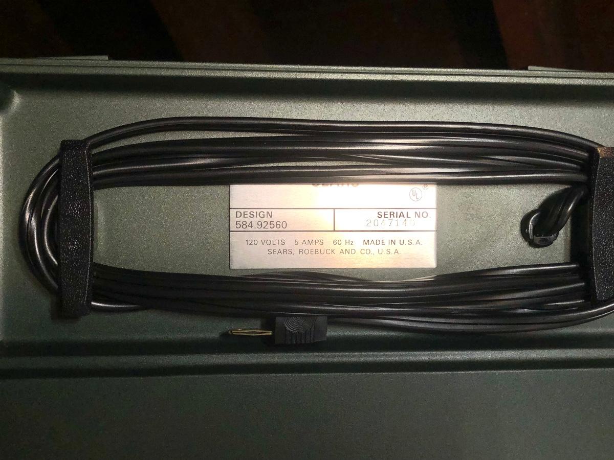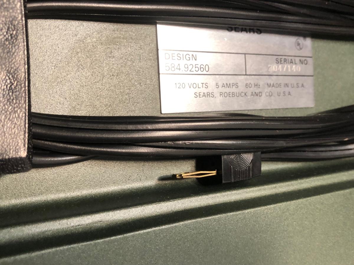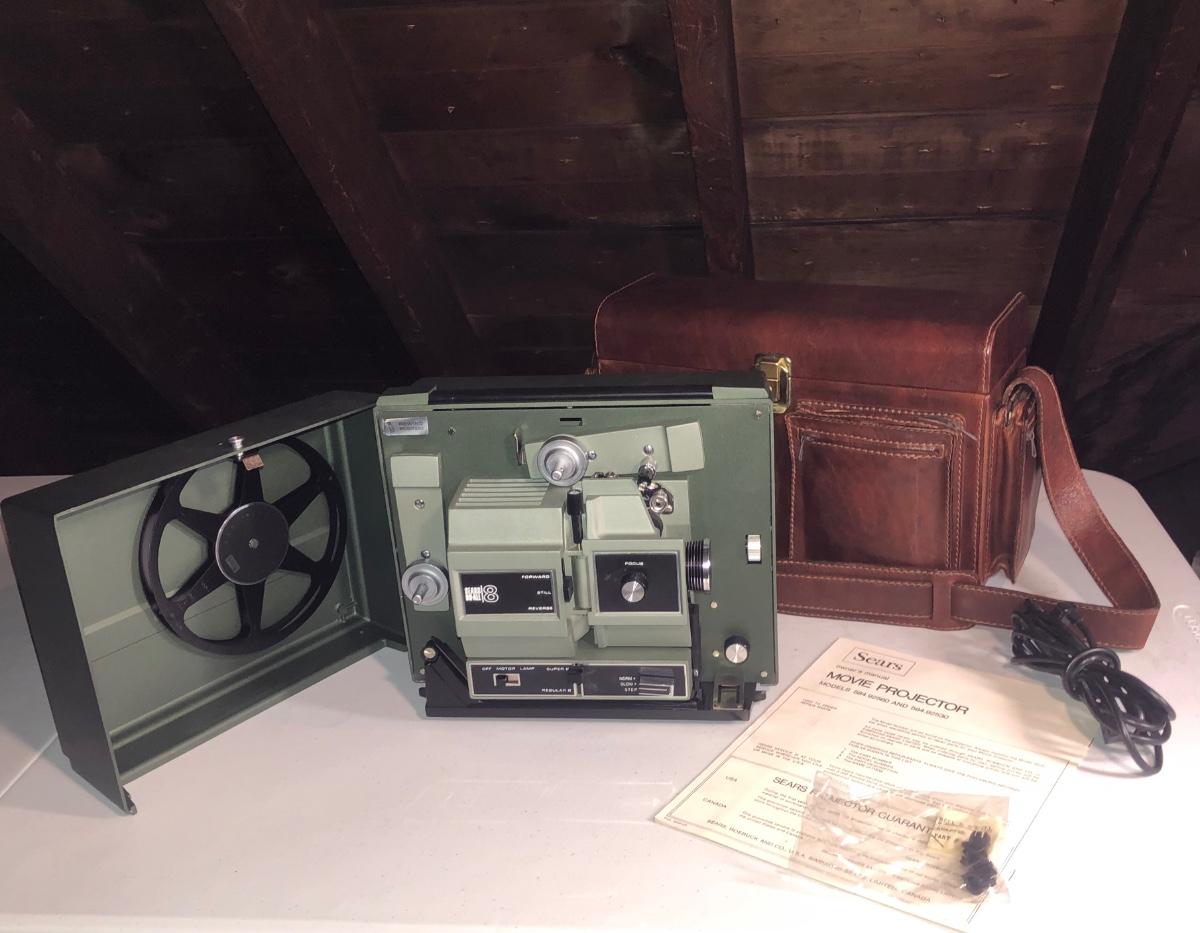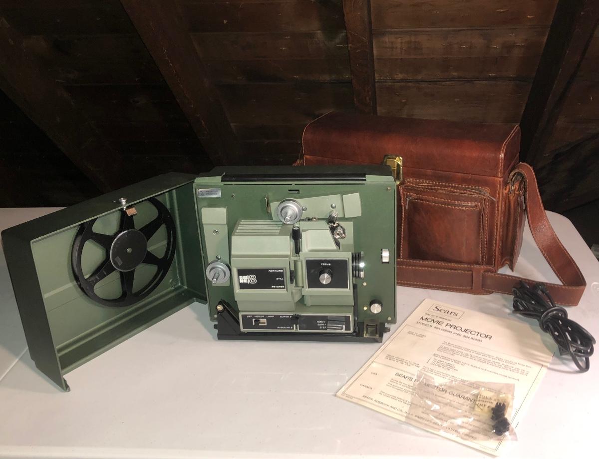Vintage movie projector made by Sears, the attached US plug with an adapter cord and Bell & Howell part #013098. Includes brown square case with multiple pockets and strap. Good condition, untested.