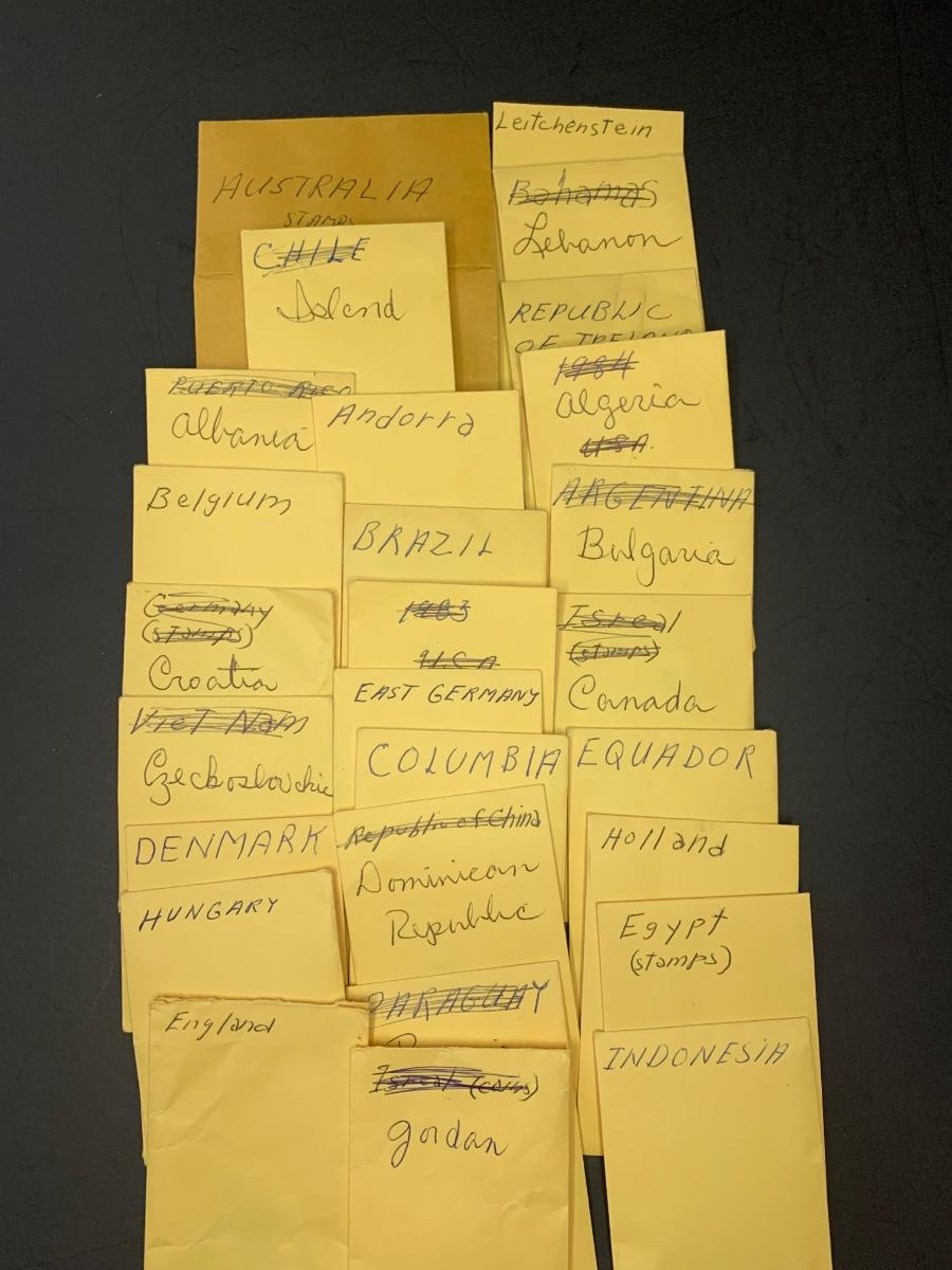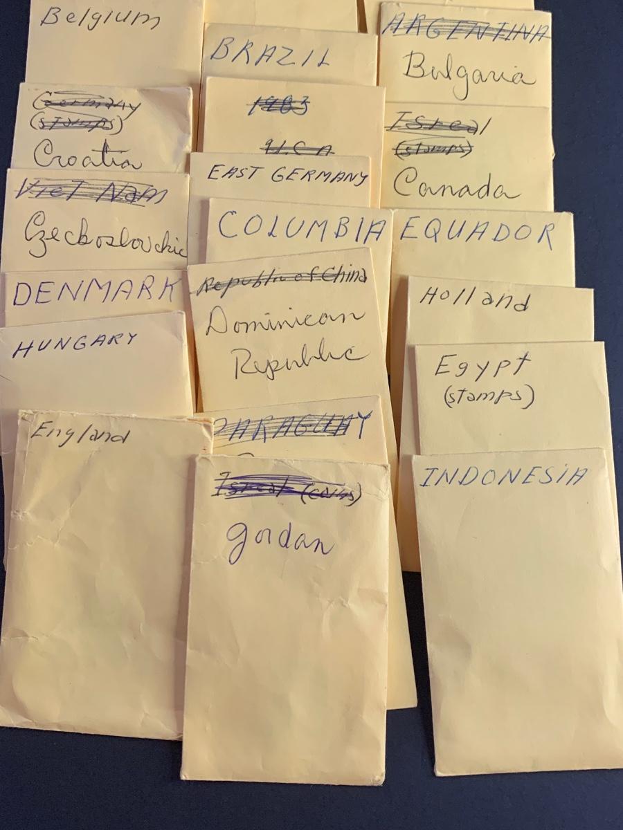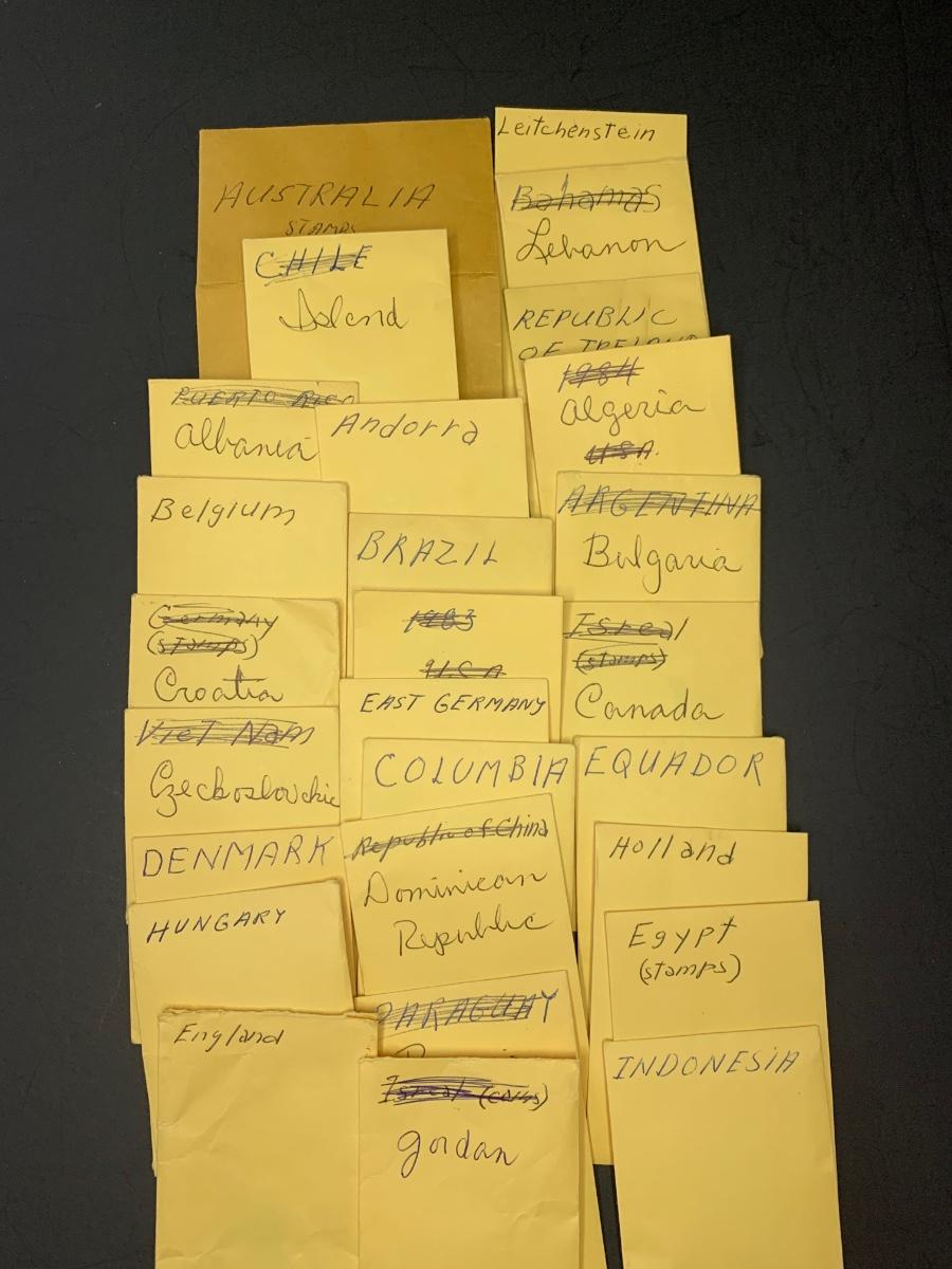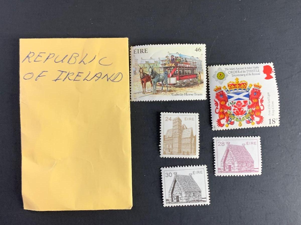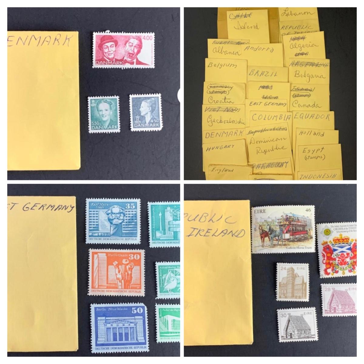 Each envelope picture contains unused foreign stamps. The country of origin is noted on each envelope and the number of stamps in the envelope in unknown.