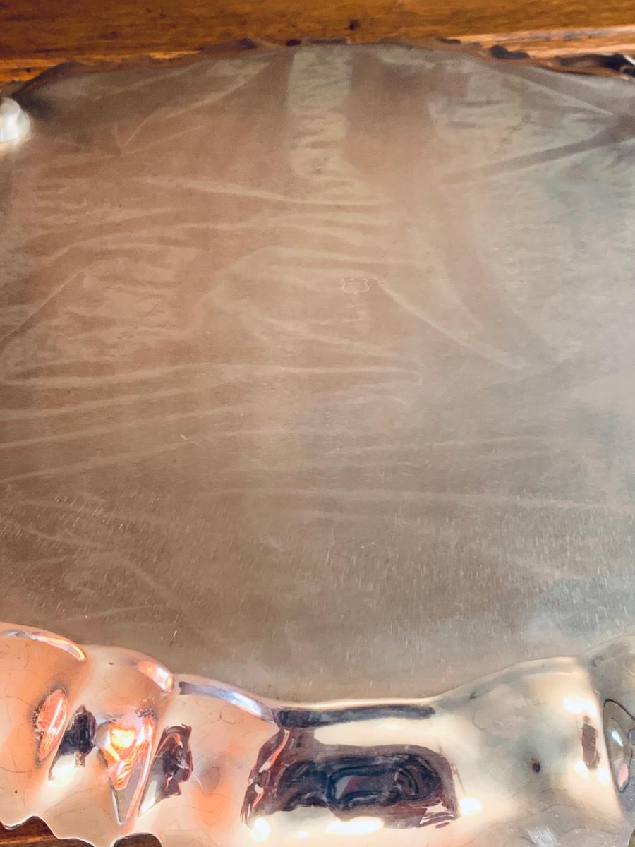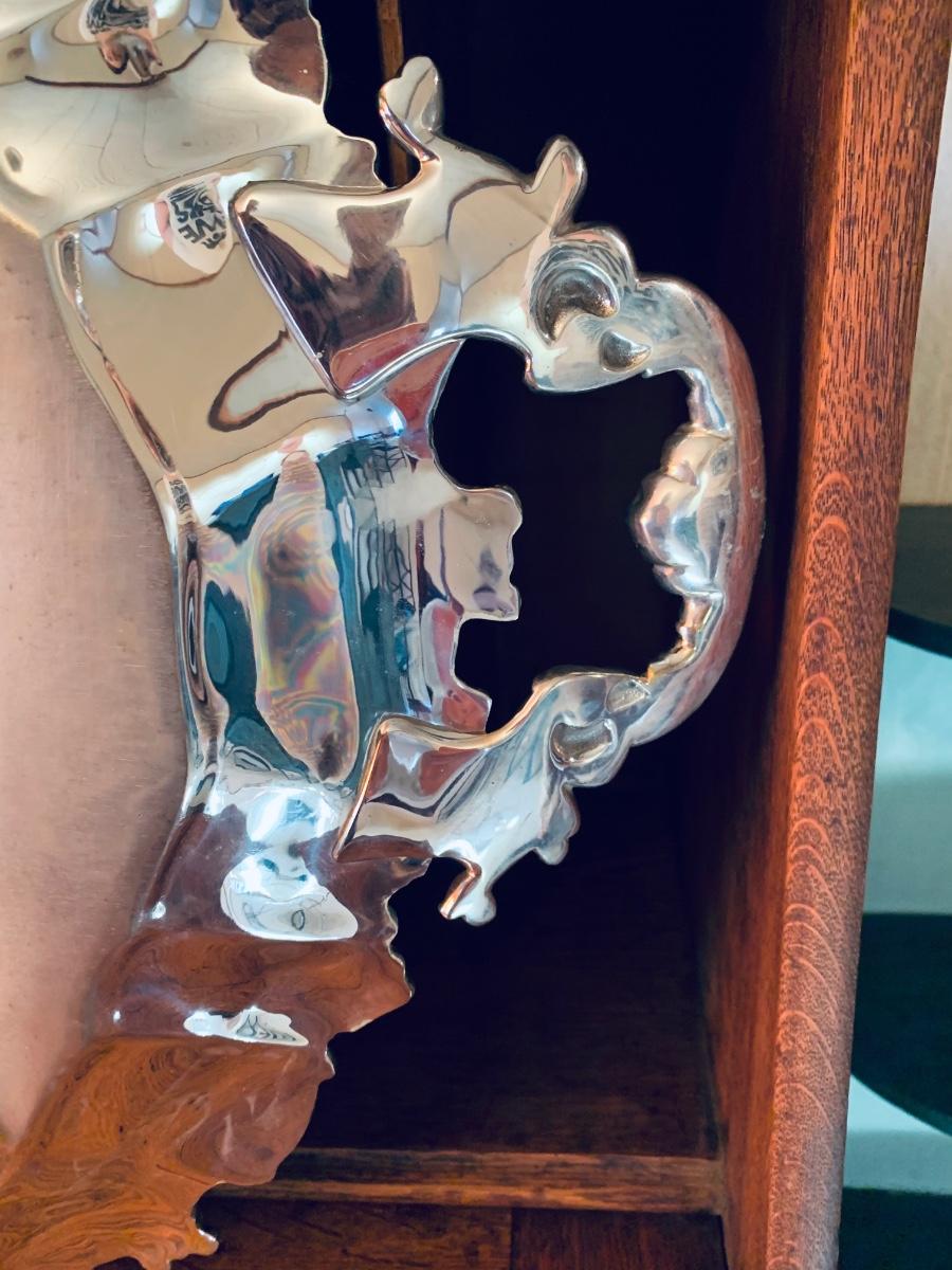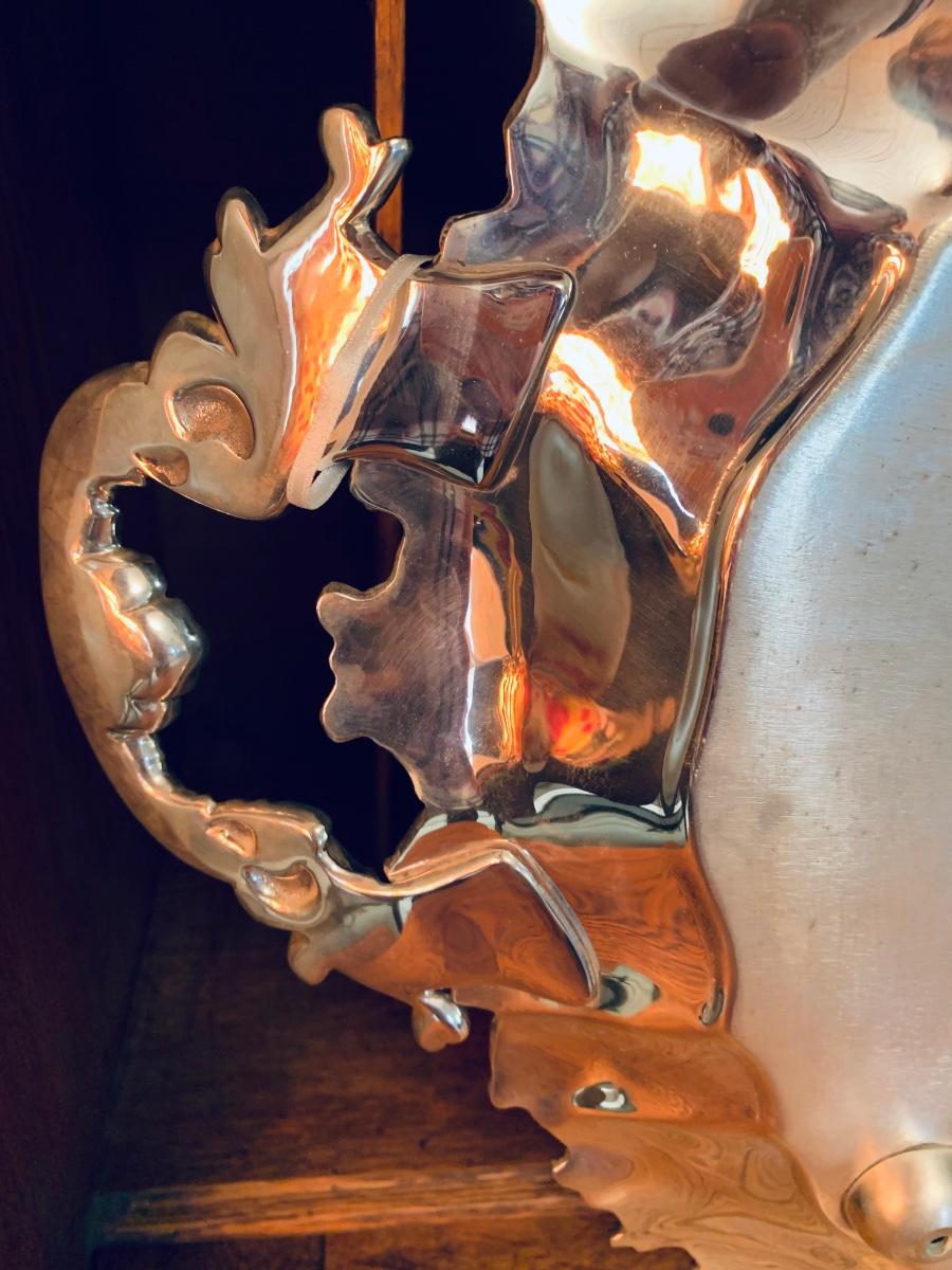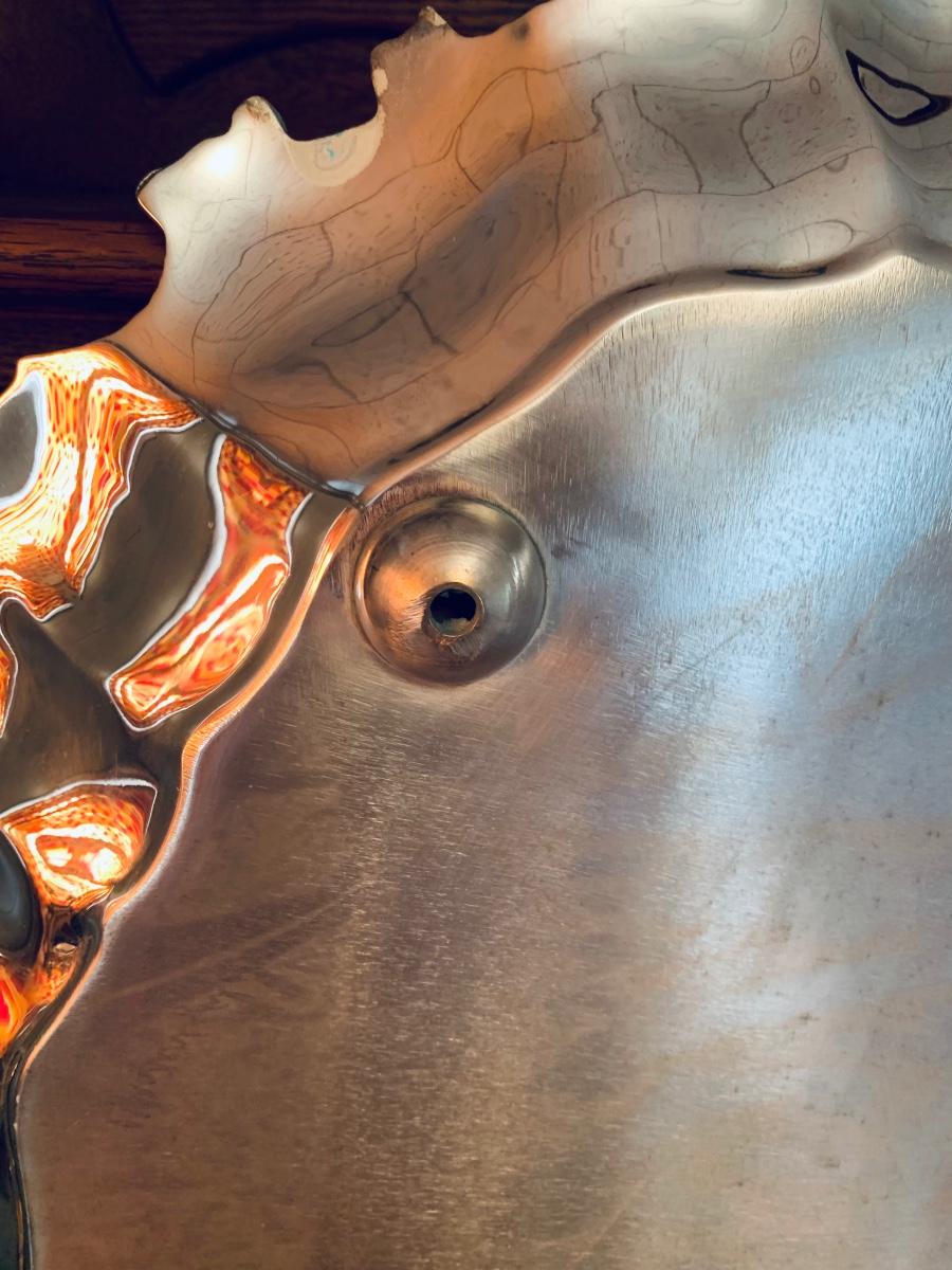 Eye-catching unfortunately the pictures do not do justice to the size and brilliance of this piece. It measures 21 inches across and 29 inches long. I fyou notice it covers the desks it sits on.