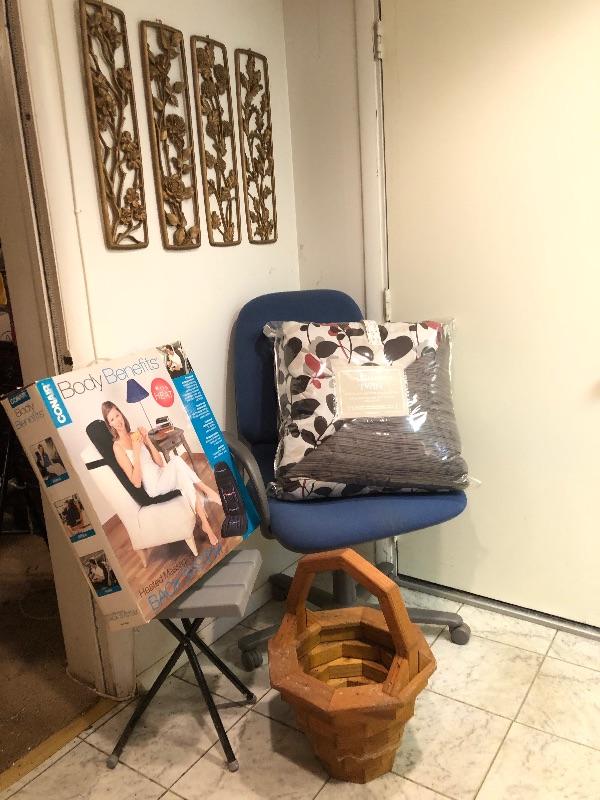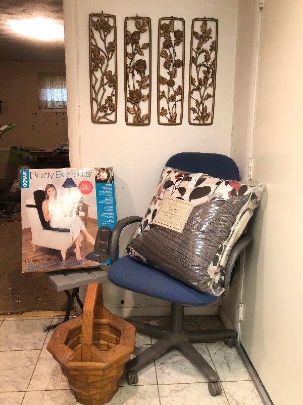 Lot 89 - Office Chair, New Twin Comforter, Folding Travel Chair, Chair Massager, Wooden Planter, Wall Art
