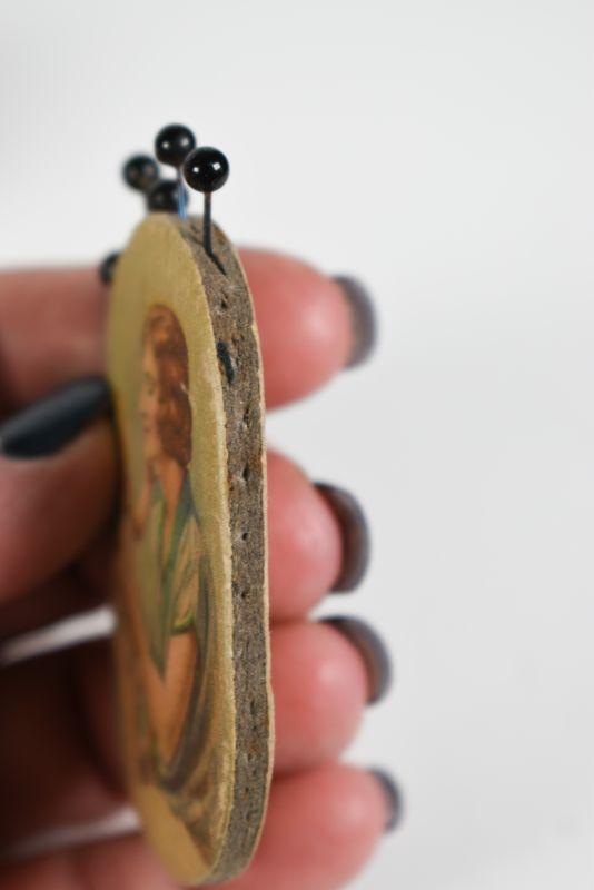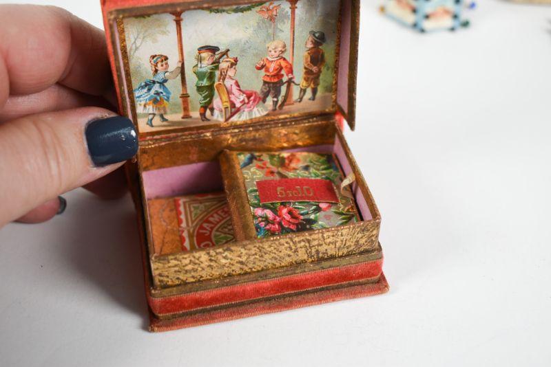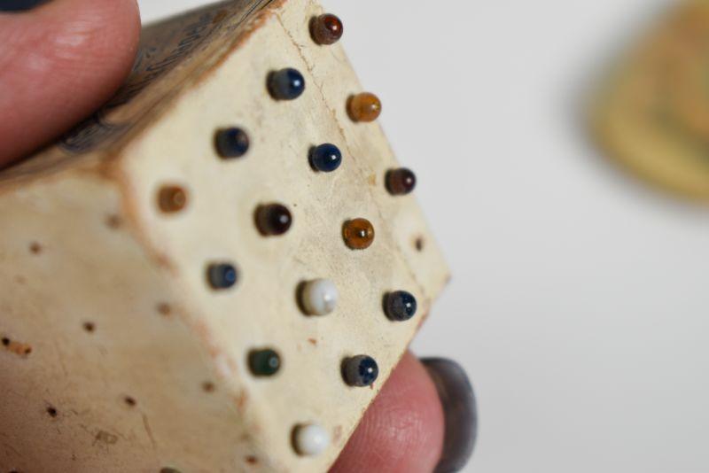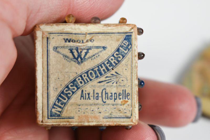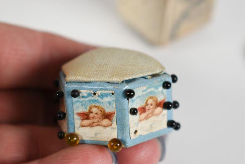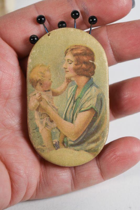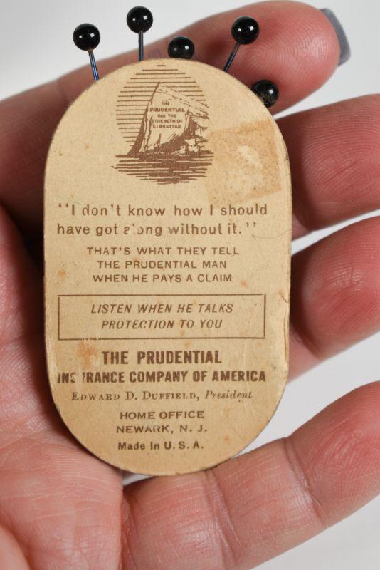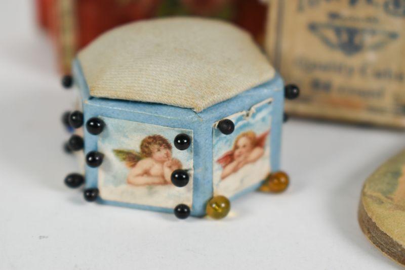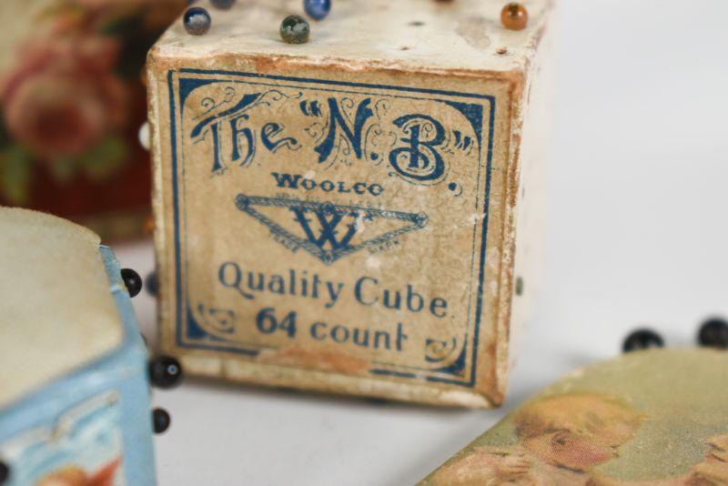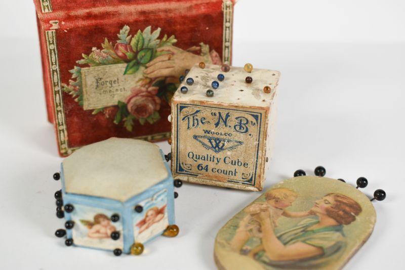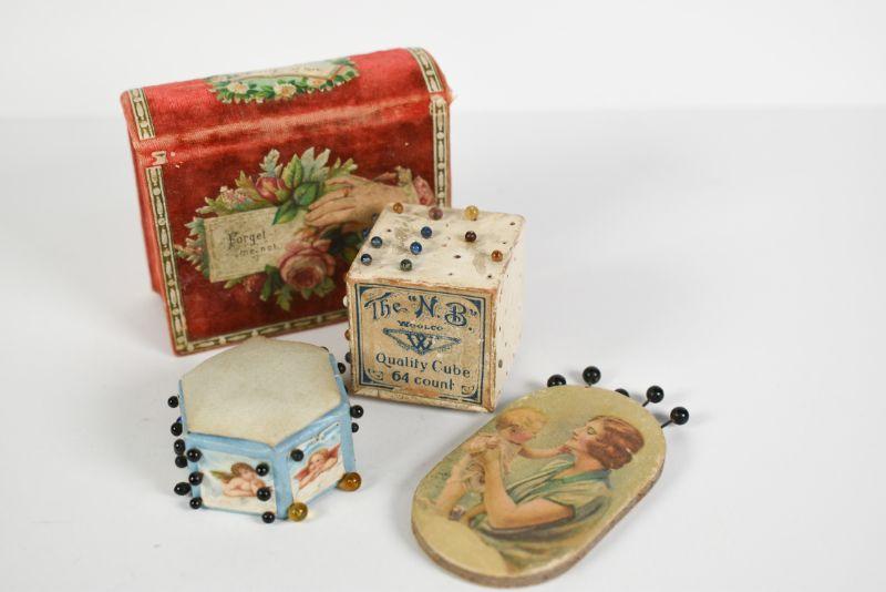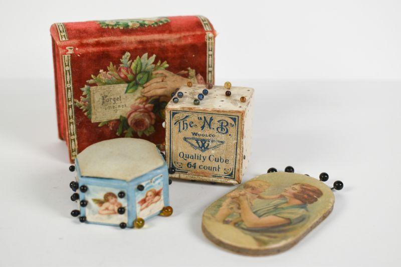 Pin holders with advertising and beautiful needle box. **Please read Terms and Conditions before placing a bid. Pick up is Sunday, December 22 from 11am to 3pm or Monday, December 23 from 4pm-7pm in Mantua, NJ. All sales are final. All sales are as is, where is. Please review all photos. Props are not included. Measurements are approximate.