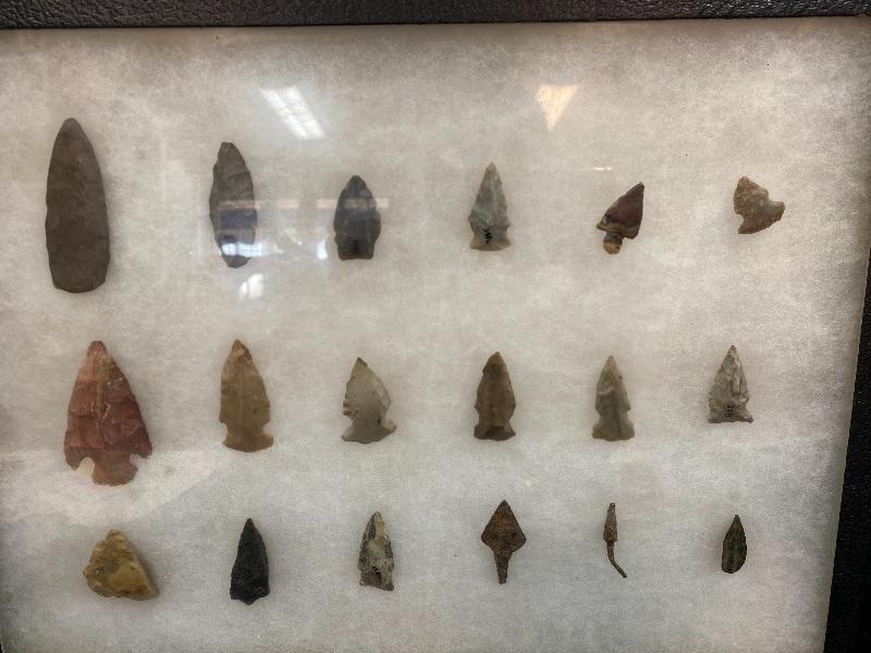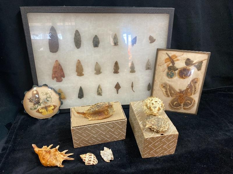 Framed Arrowheads, fossilized fish (fragile), and butterflies. Please see all pictures for condition of the items listed and what is included in the lot. Pictures will also show any measurements if taken and is the best representation of the items. Thank you for looking and have fun bidding! We appreciate Treasure Hunters!
