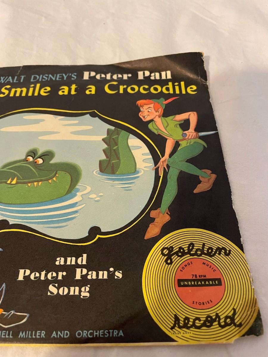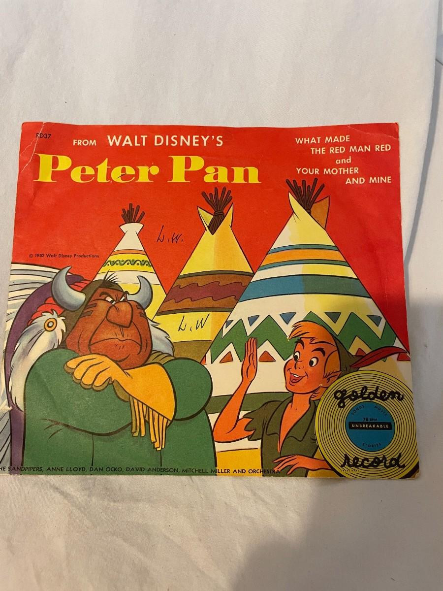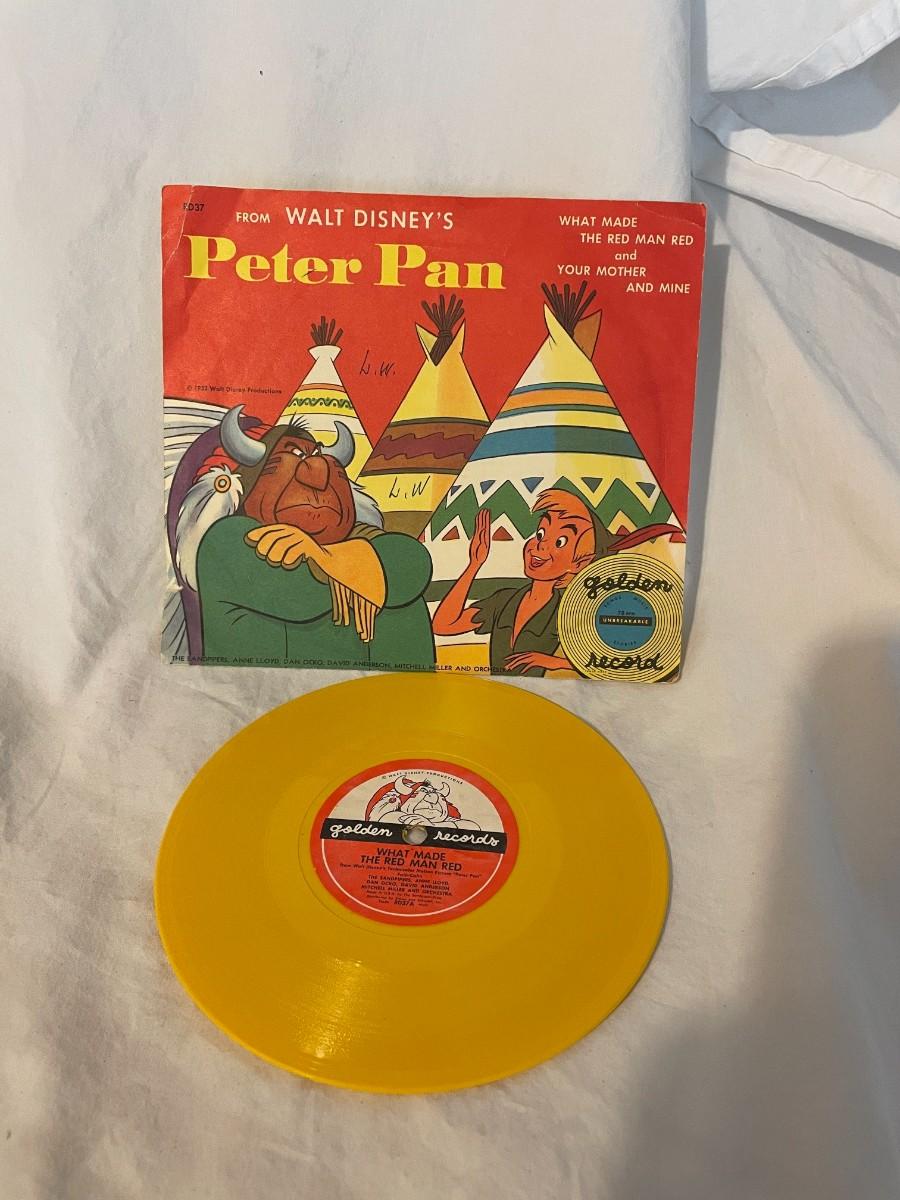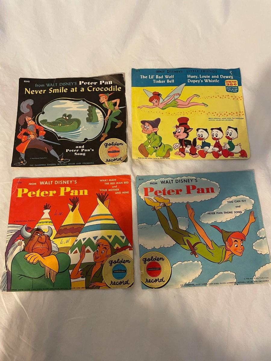 LITTLE GOLDEN RECORDS AND WALT DISNEY PRESENT PETER PAN! FOUR RECORDS ALL FEATURING MUSIC FROM PETER PAN. WHAT MADE THE RED MAN RED, YOU CAN FLY, NEVER SMILE AT A CROCODILE AND MORE!