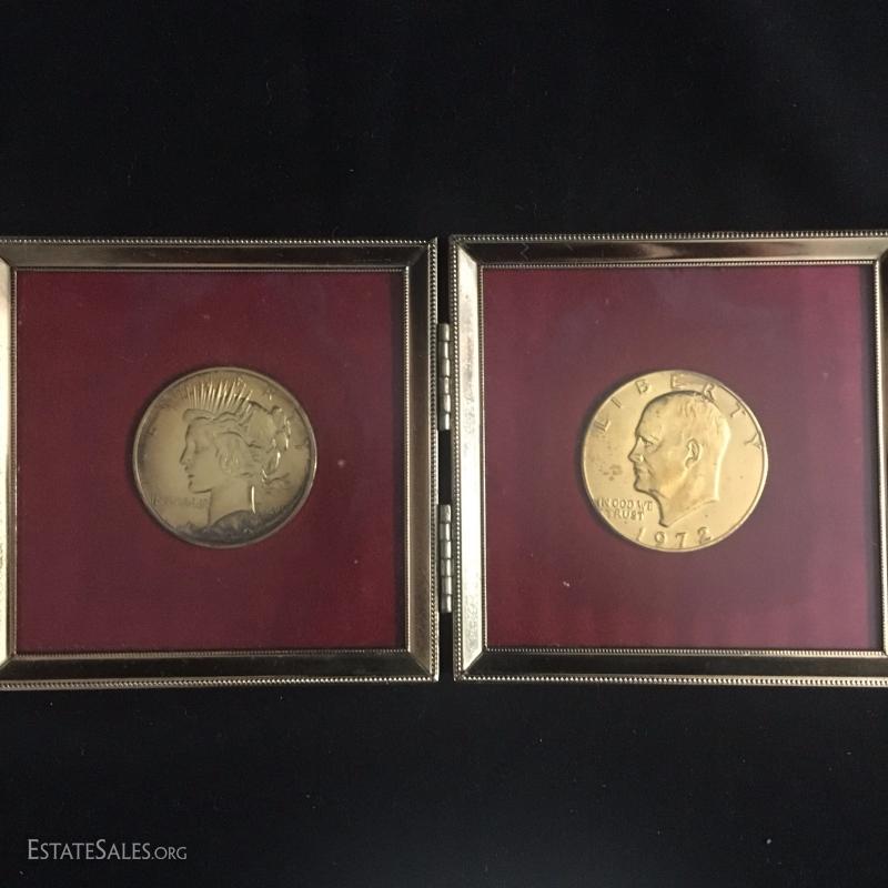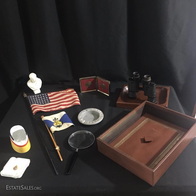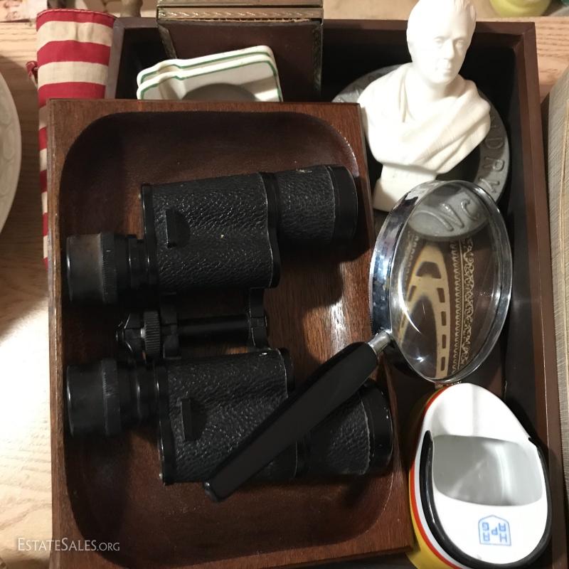 Lot of various items includes binoculars by Stellar. Magnifying glass. Wooden bowl. Ash trays. Framed collectible coins. And more. See photos.