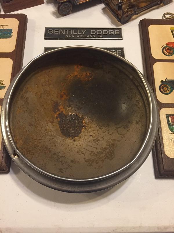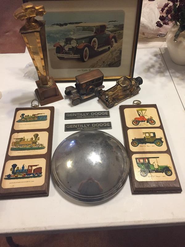 LOT #82. “Automotive” Lot. Vintage car trophy, framed 1930 Cadillac, 2 plaques of vintage vehicles & locomotives, antique hubcap (has rust on back), “Gentilly Dodge” nameplates, metal car, glass car cologne bottle