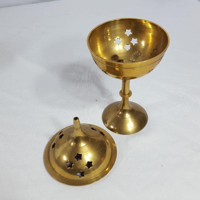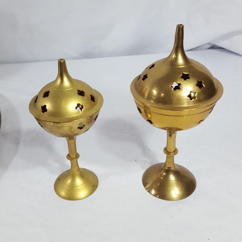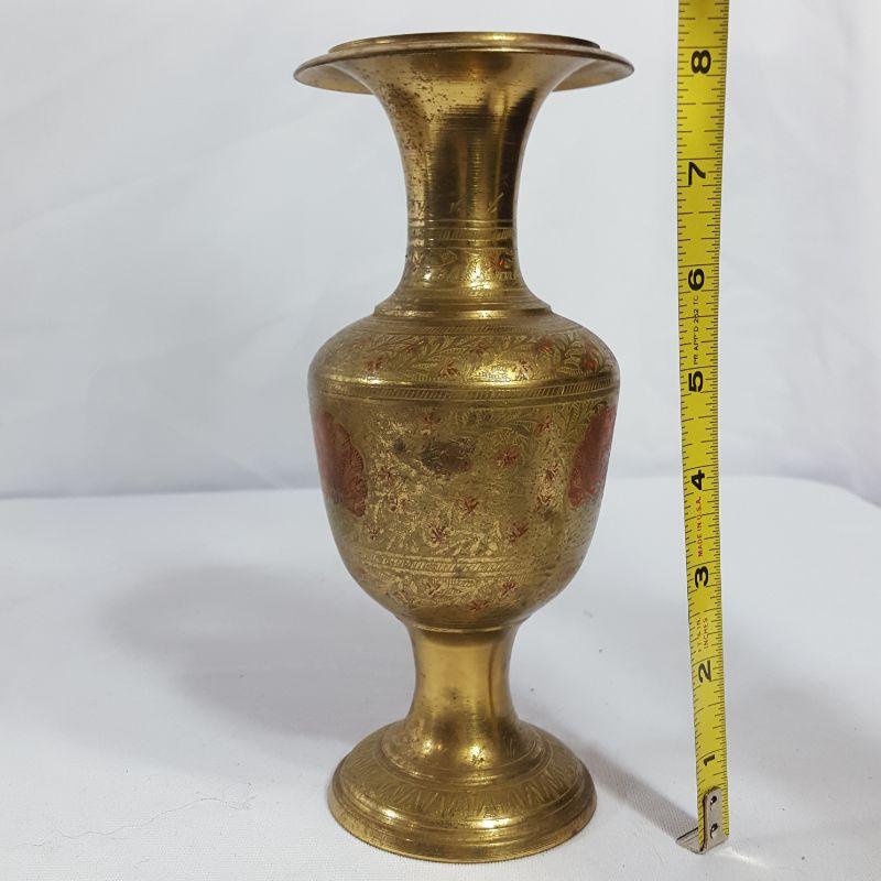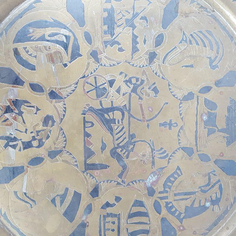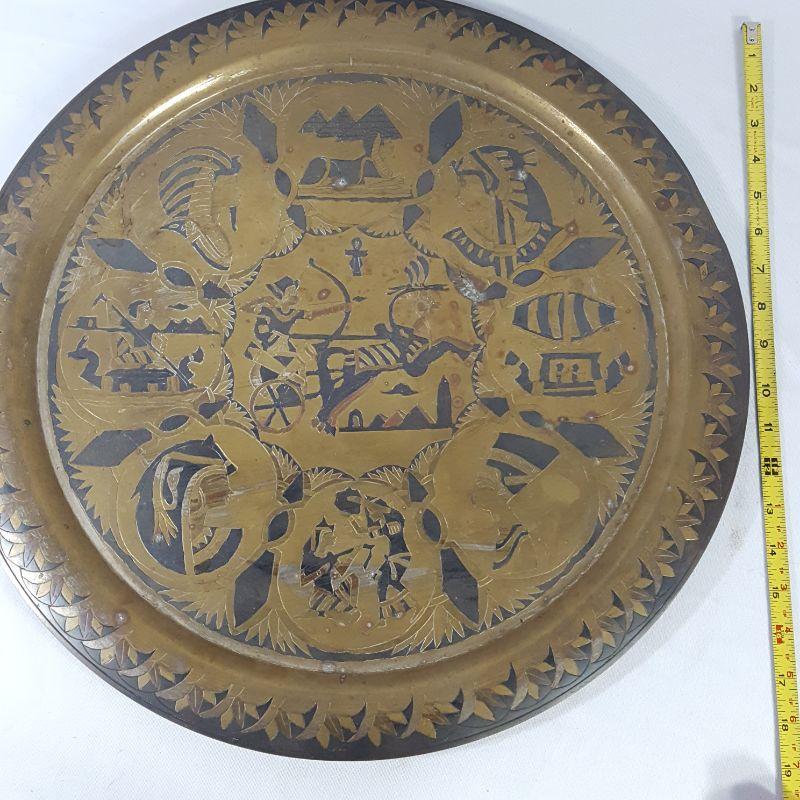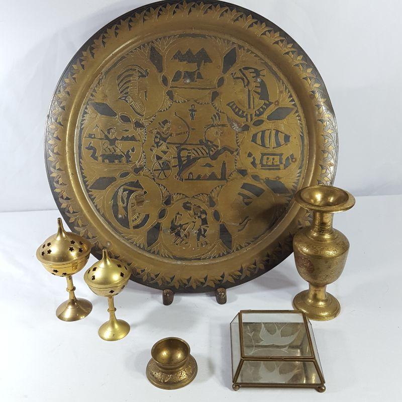 Six piece collection of brass treasures! Featuring a large brass platter with detailed Egyptian engravings. Platter is 19.5 in in diameter and will enhance your mantel, wall or dresser top. Included in this lot is an engraved vase with detailed red peacocks. Next, two insense burners, one 7 inches with star cut outs and the other one 6 inches with cross cut outs. Another treasure is a short insense burner with an intricate leaf design. Finally a brass and glass box featuring an etched swallow. See pictures for all the fine details! Shipping available.