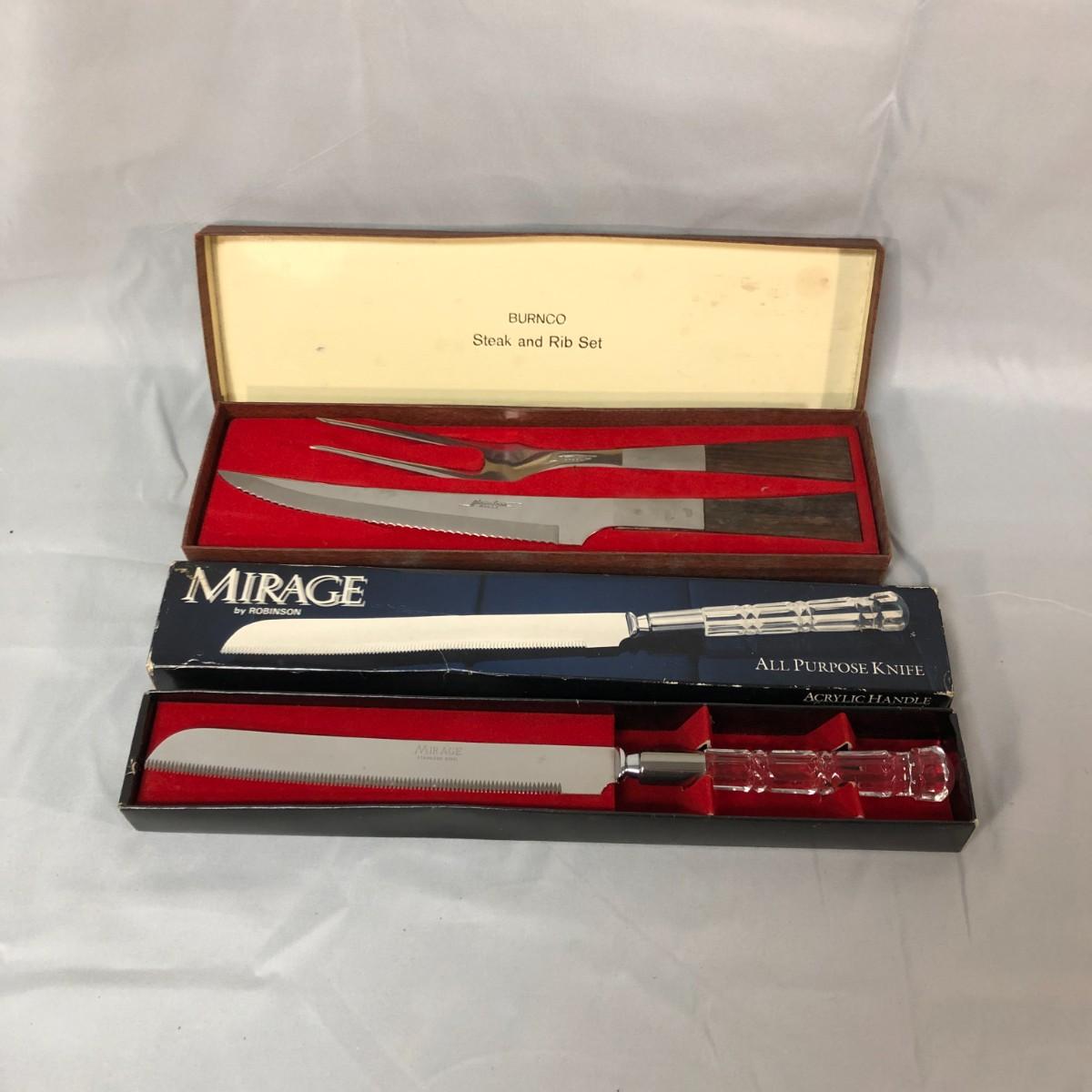 Both of these appear to be in great condition - either never used or it was very gently. The Burnco steak and rib set has a wood handle and stainless steel blades, while the all purpose knife by Mirage has an acrylic handle and stainless steel blade.