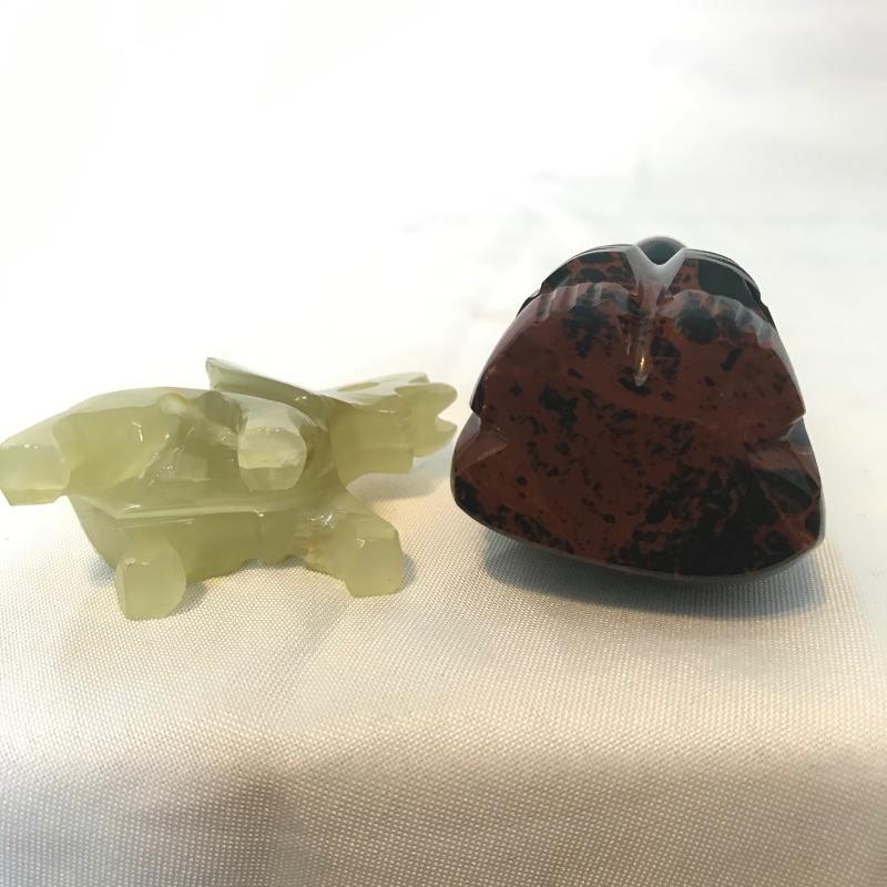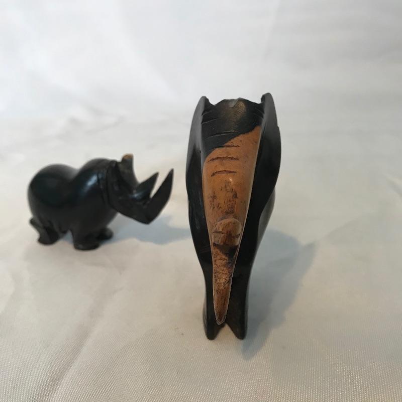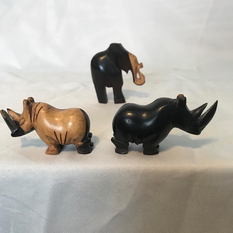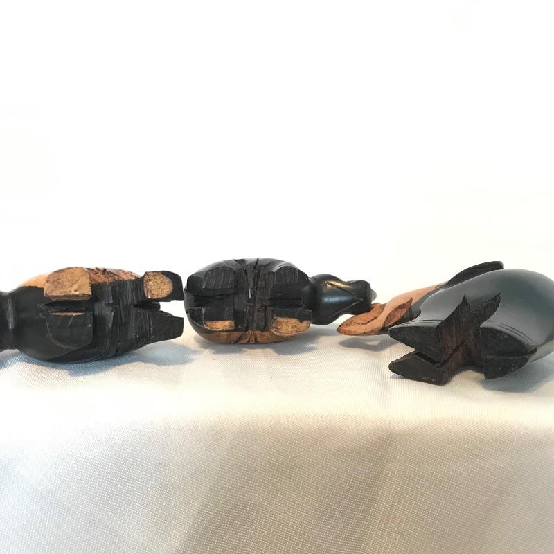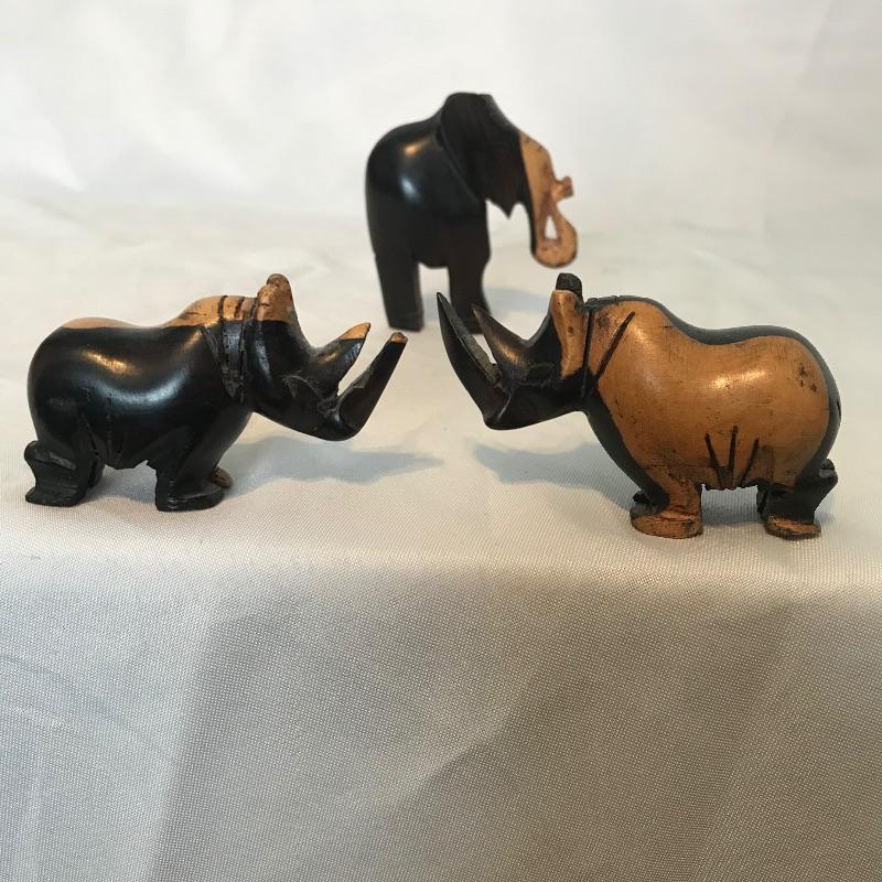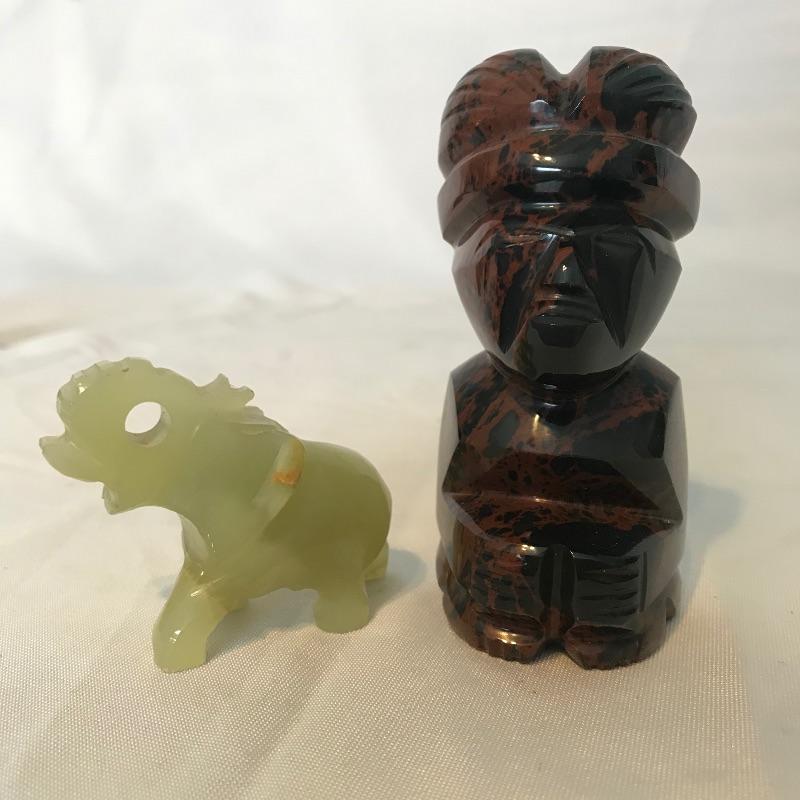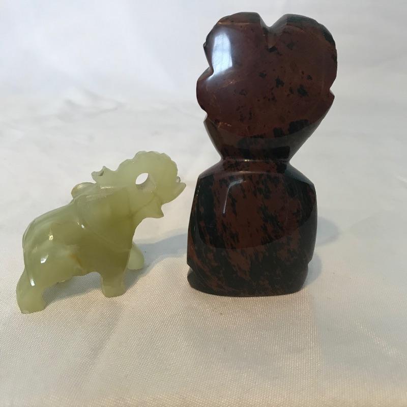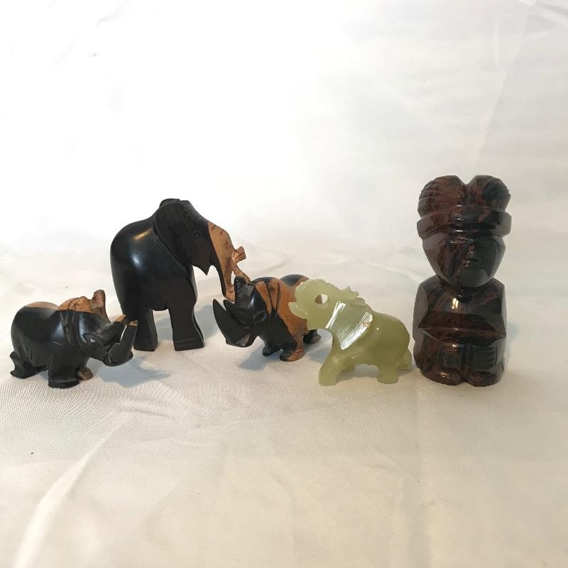 Two awesome carved stone figures including an elephant that appears to be jade and an indigenous style figure made from a black and brown marble like stone. We’ve added three carved wood pachyderms with bold contrasting colors. The tallest stone piece is about 3.75” high. See photos. Shipping available.