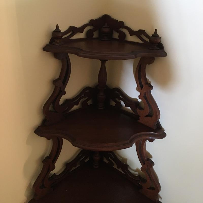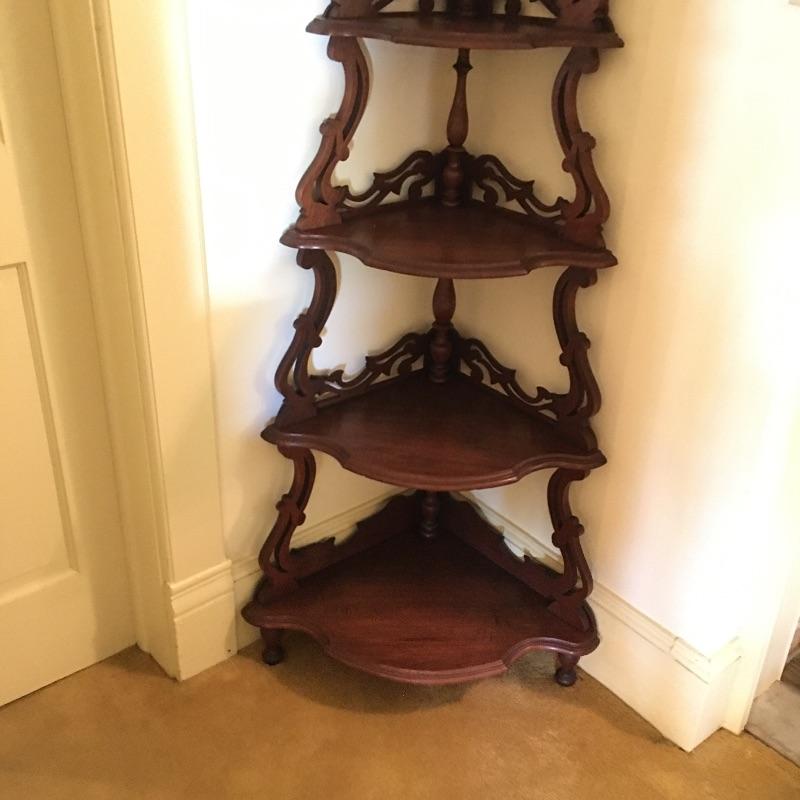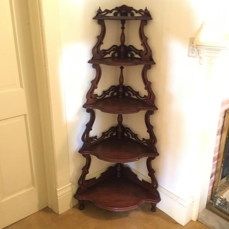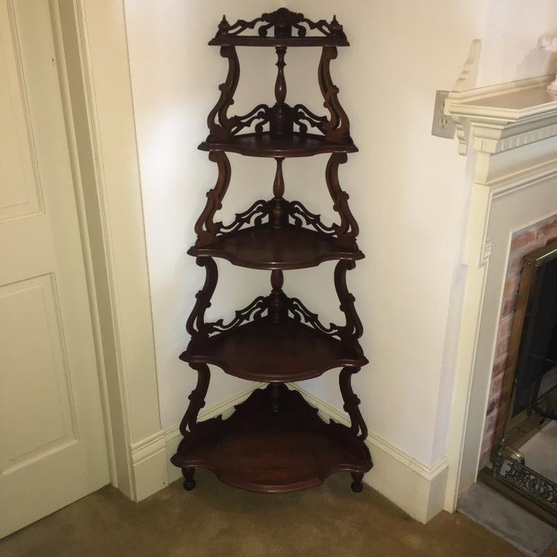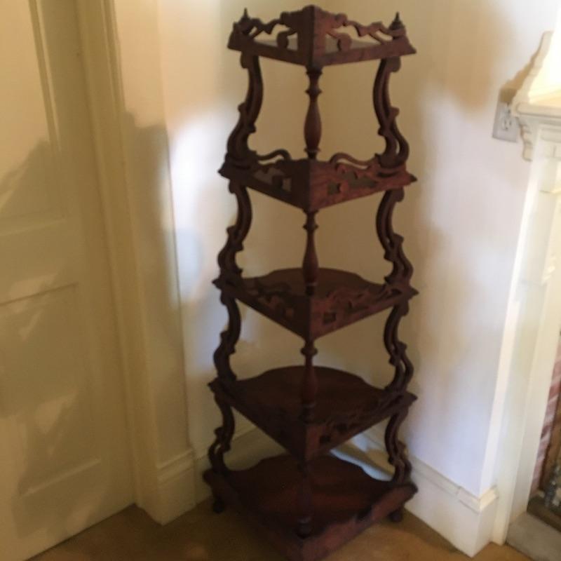 Classic wooden corner shelf with five shelves with intricate carved design. Shelf is in excellent shape with just a few nicks and dark lines on one shelf, see pictures. Corner shelf measures 11” x 11” 15.5” x 60.5”.
