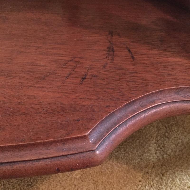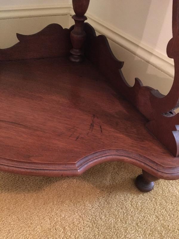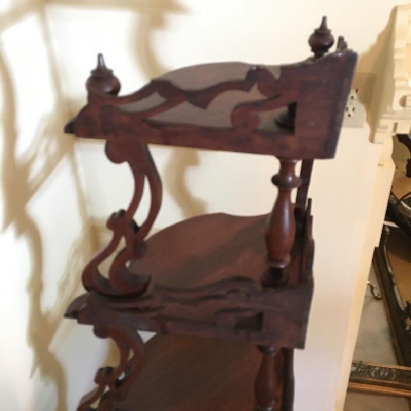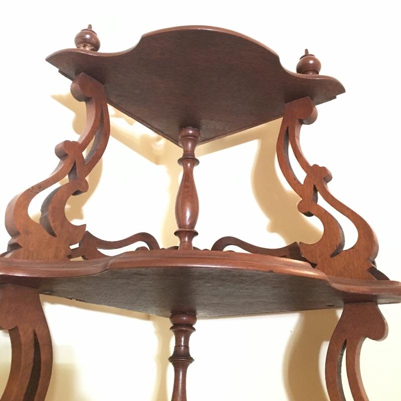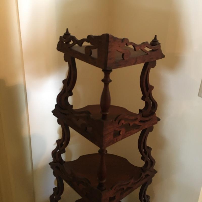 Classic wooden corner shelf with five shelves with intricate carved design. Shelf is in excellent shape with just a few nicks and dark lines on one shelf, see pictures. Corner shelf measures 11” x 11” 15.5” x 60.5”.