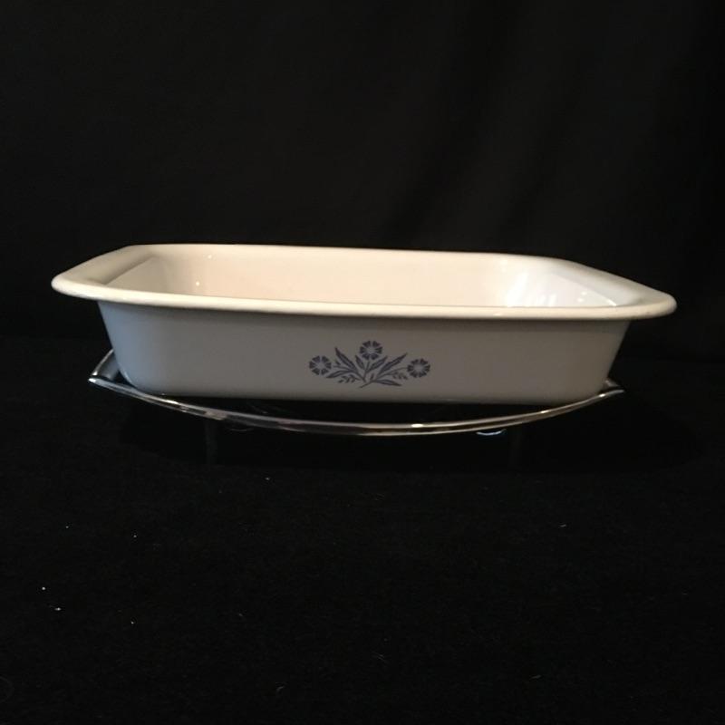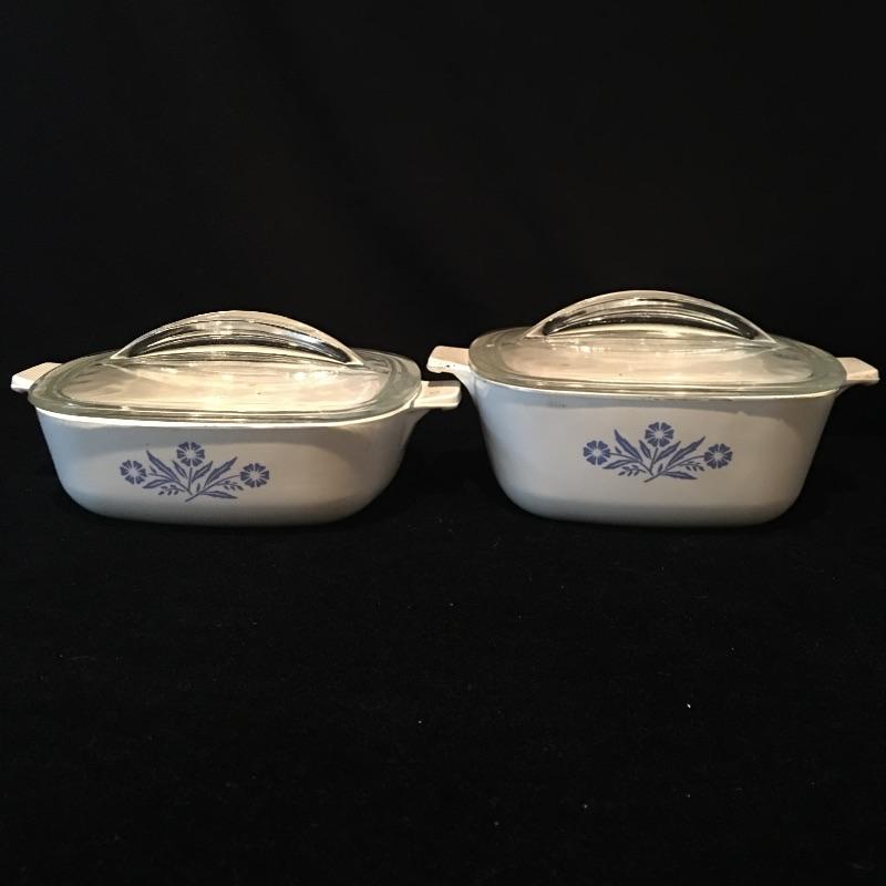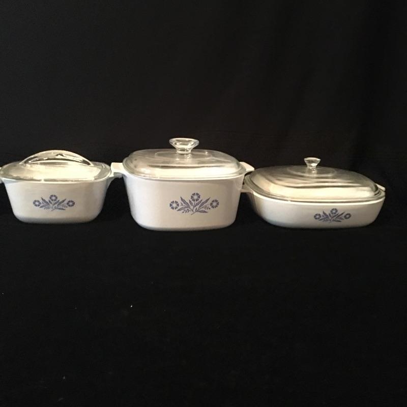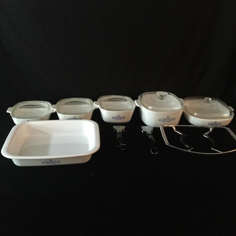 Array of Corning Ware in Cornflower pattern includes five casserole dishes with lids, one large dish and two handles. Classic Corning Ware, you can never have enough.