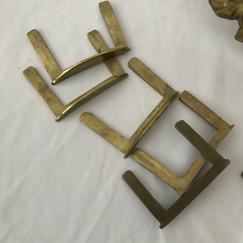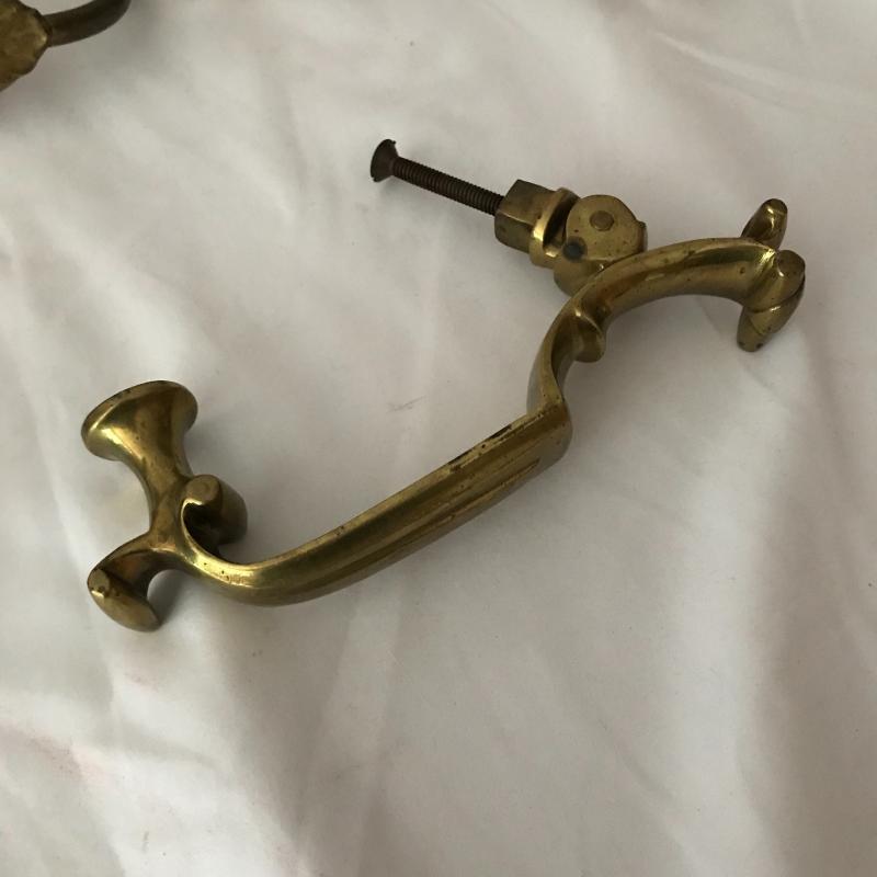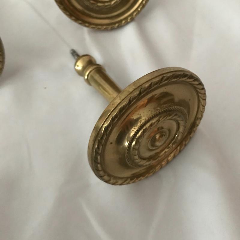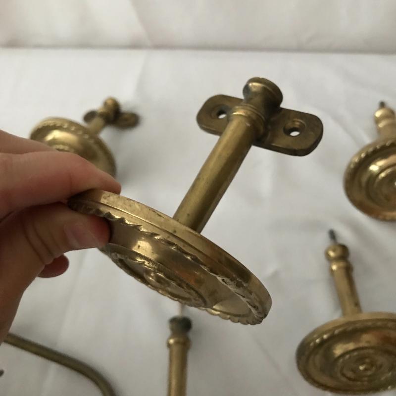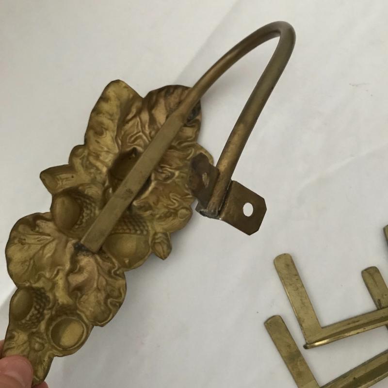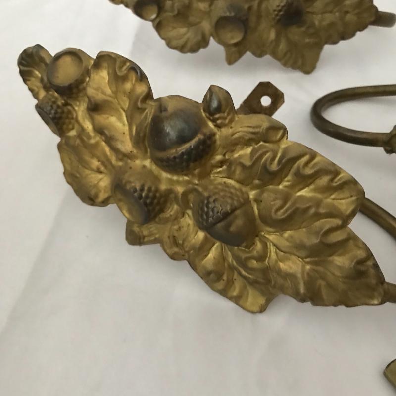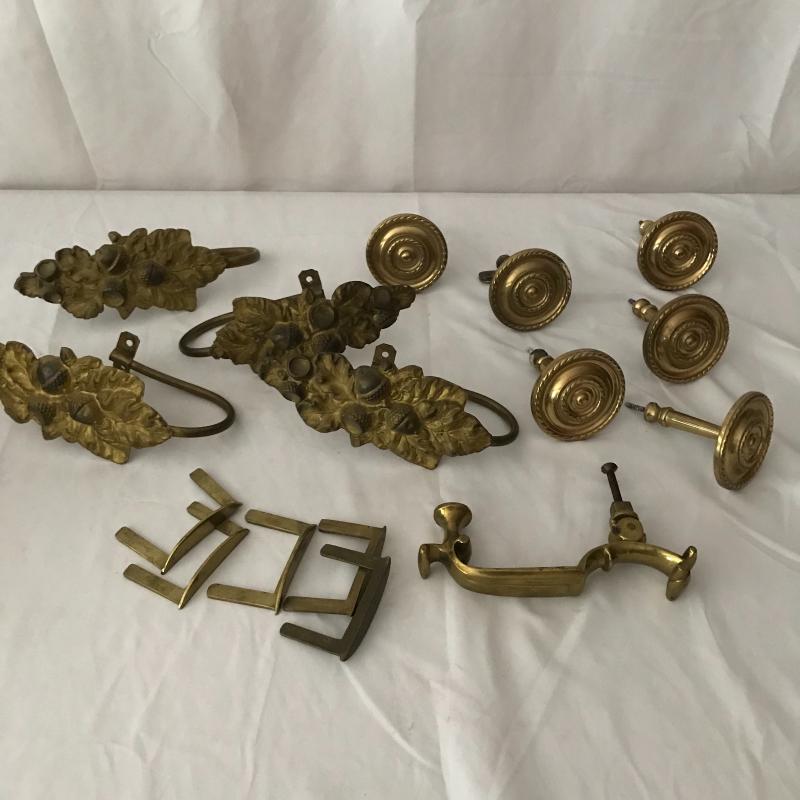 Lot includes four acorn motif curtain holdbacks, four knob-like holdbacks and two matching hooks, 6 brass table leaf yokes and a door knocker. No shipping available. Local pickup only in Asheville, NC.