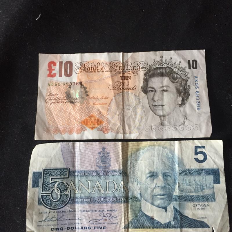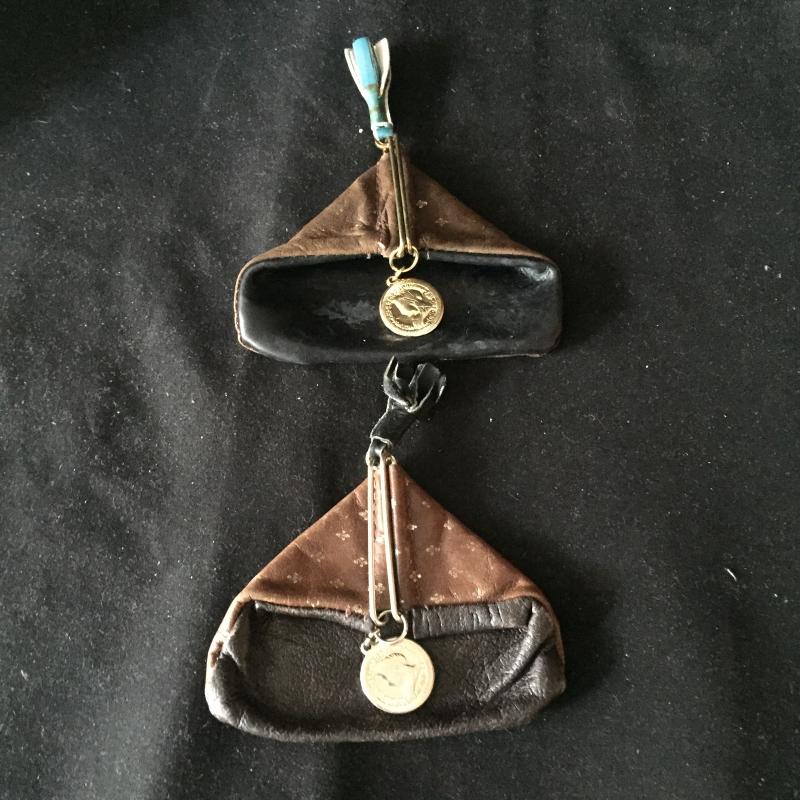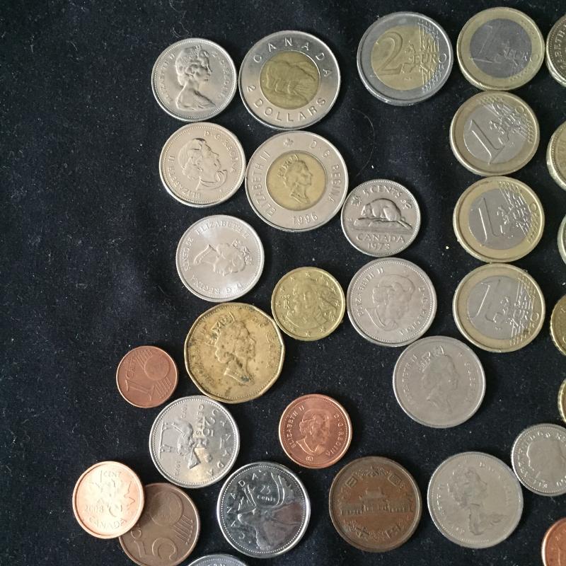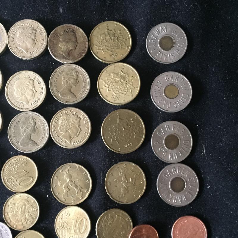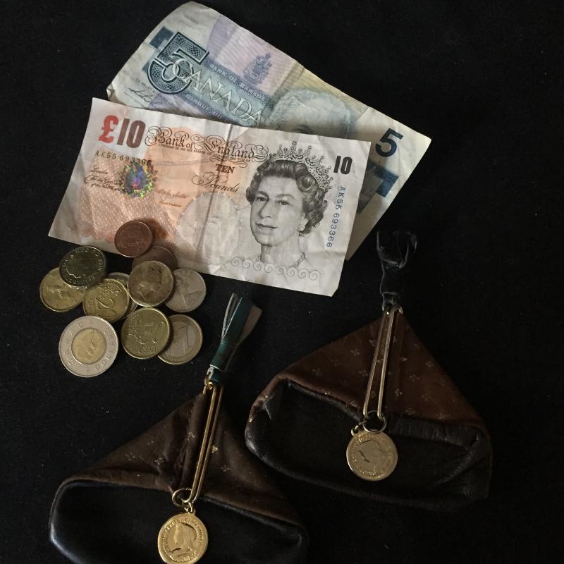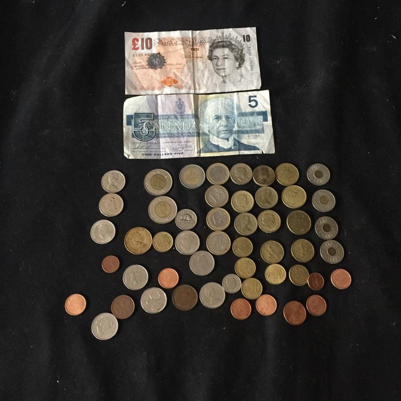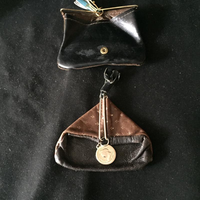 British Pounds, Euros, Canadian dollars and Garden state parkway tokens in this lot. You'll also find a unique pair of leather change purses that fold and snap closed.