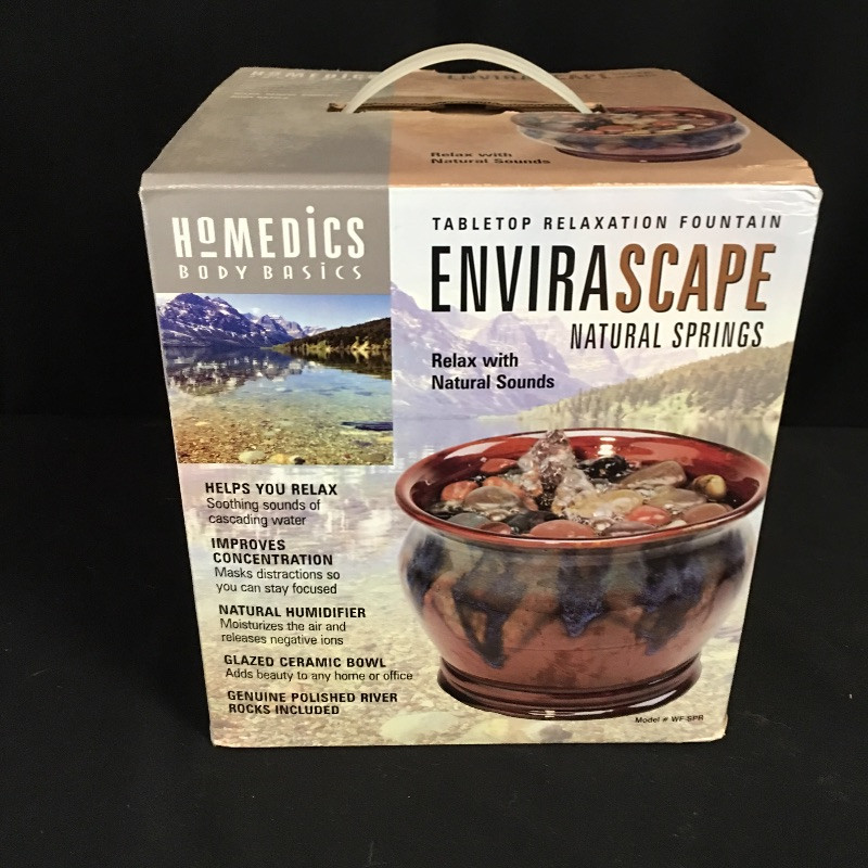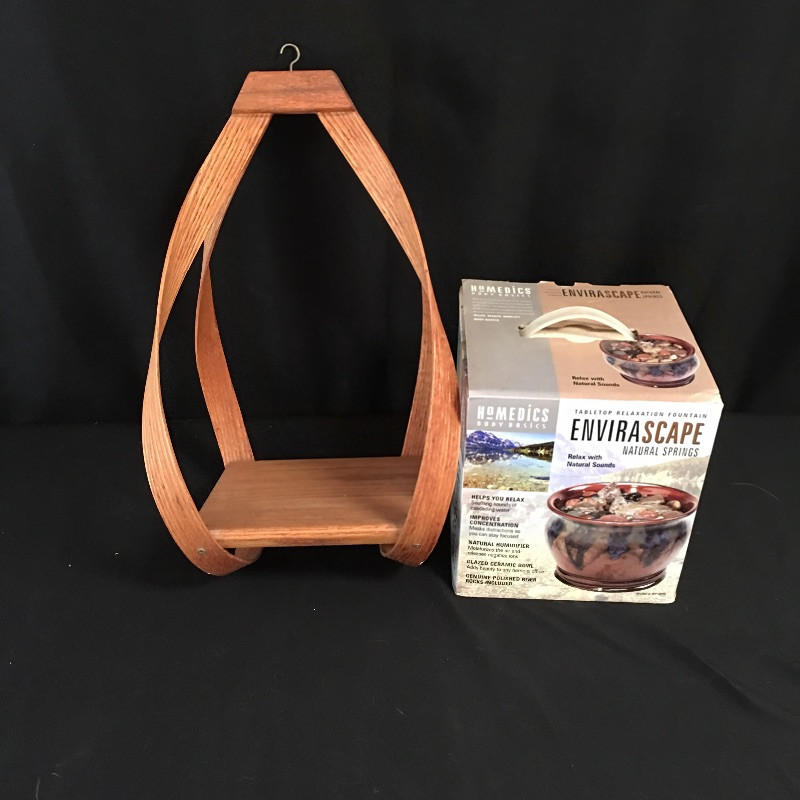 Add some serenity and relaxation to your space with this Homedics fountain and wooden hanging shelf. Fountain appears to be unused and comes with original packaging. The lightweight shelf will display your ornaments or plants nicely. Shelf measures 9.5” x 9.25” x 19.5”.