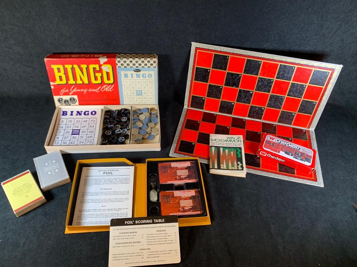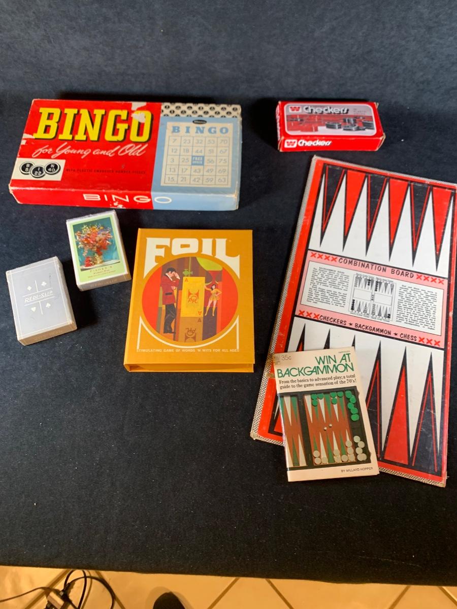 Lot includes 2 decks of cards, "Win at Backgammon" booklet, Checkers and reversible Checker/Backgammon board, Foil game with instructions and pieces, and Bingo game.