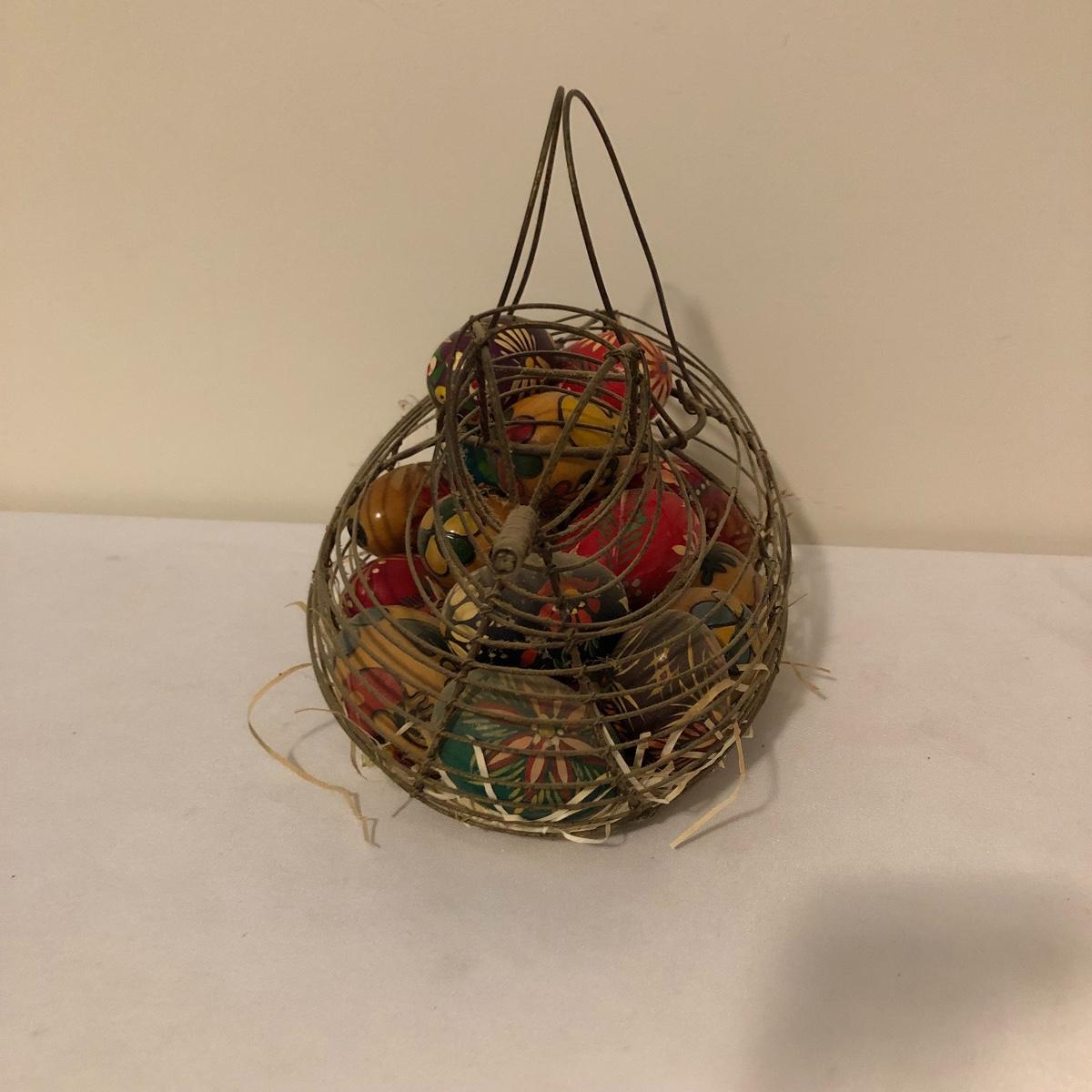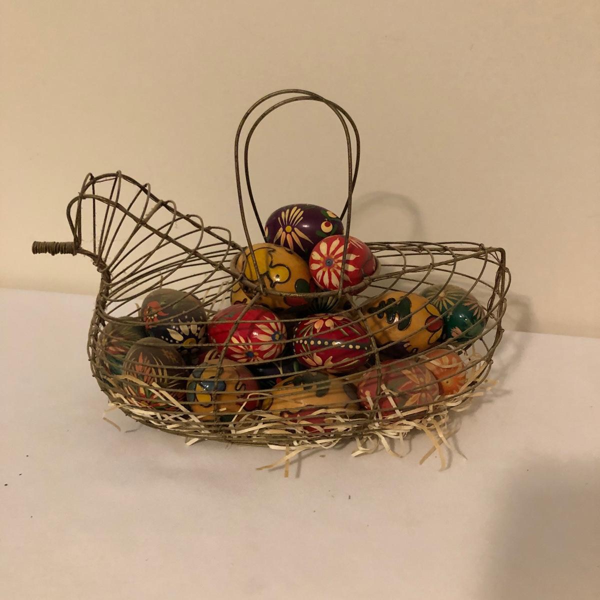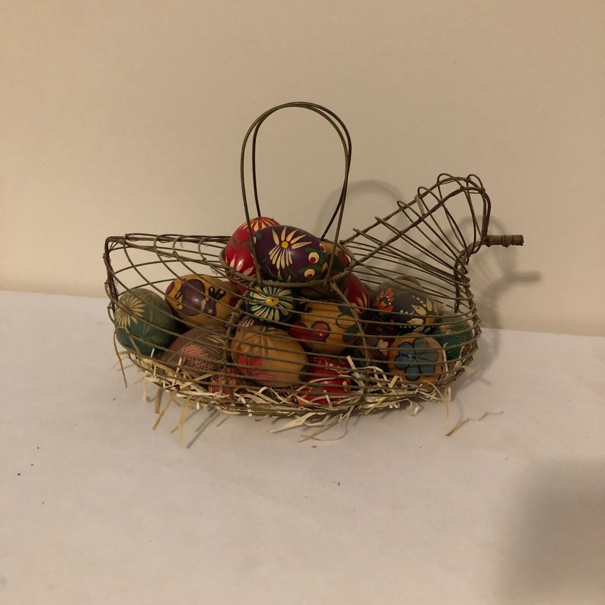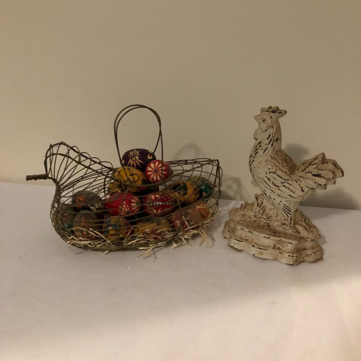 Country chic for you here with this unique metal bird shaped egg basket that has twenty five hand painted wooden eggs in it currently. Also included is a handsome iron rooster door stop. Bird shaped carrying basket measures 7” x 12” x 6.5”.