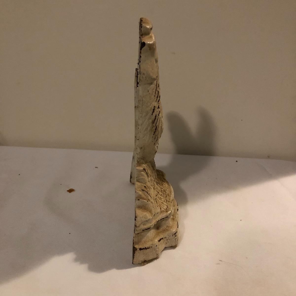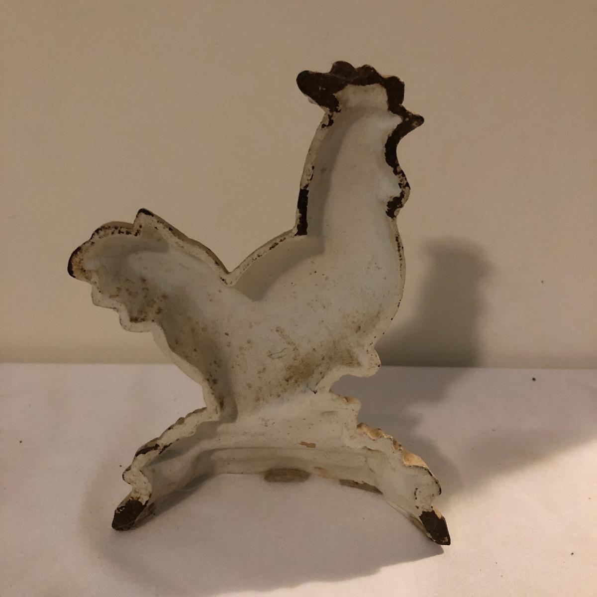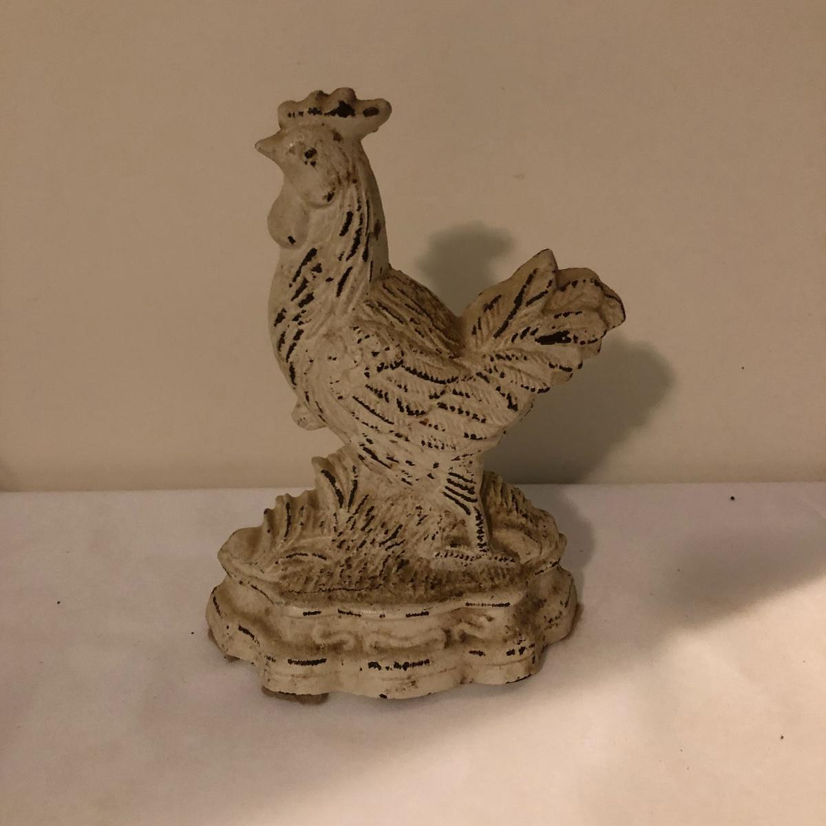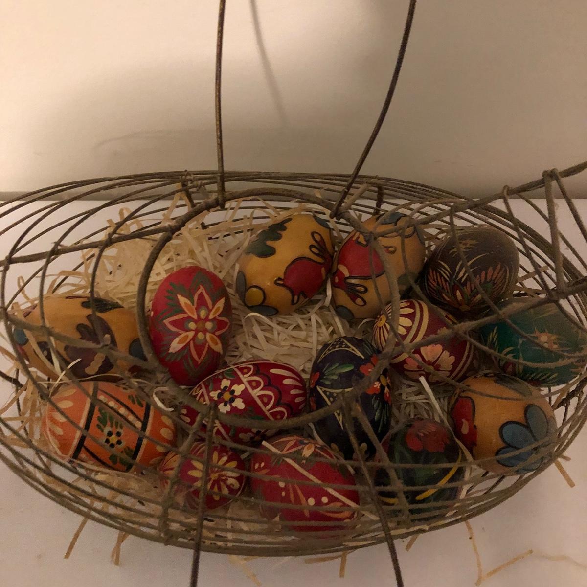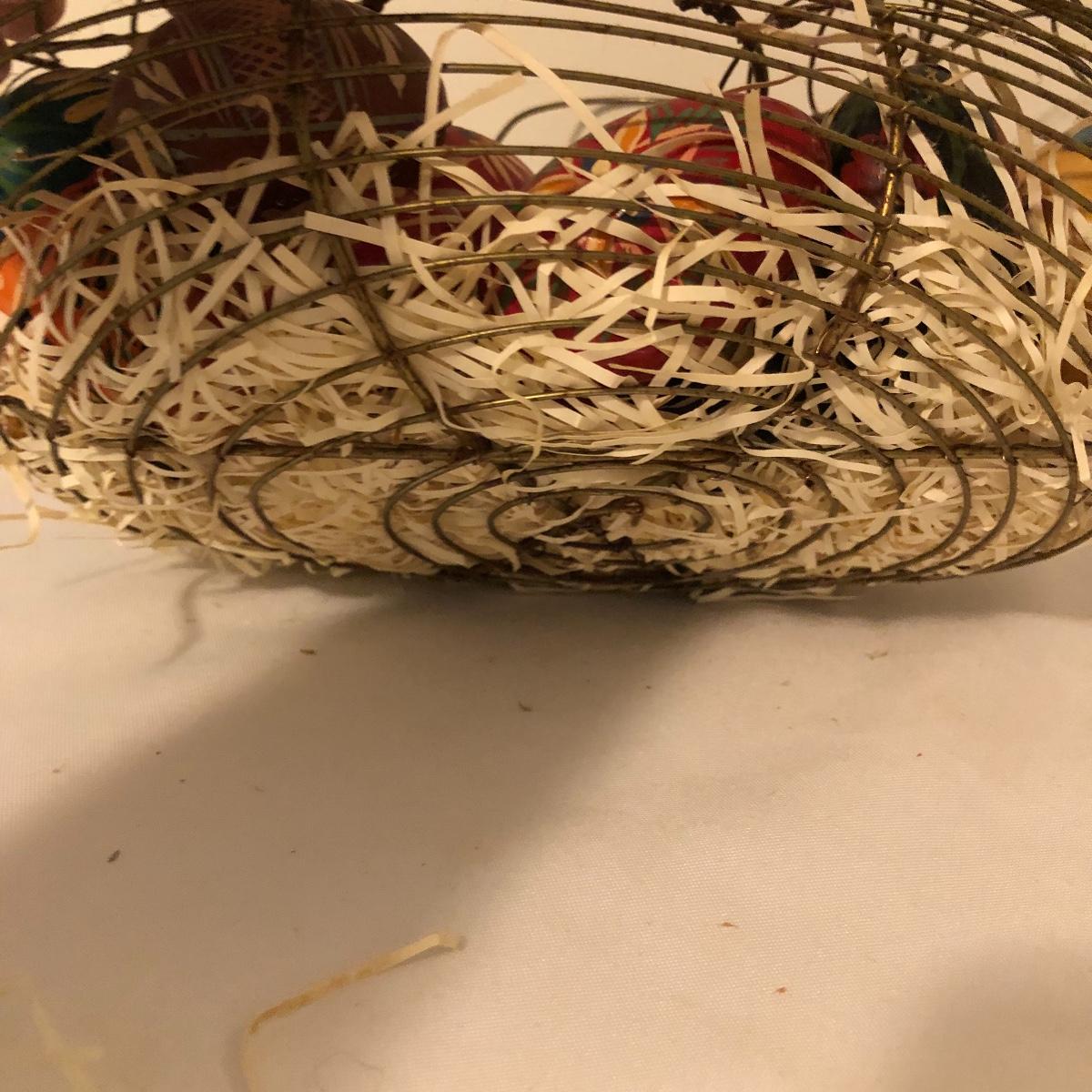 Country chic for you here with this unique metal bird shaped egg basket that has twenty five hand painted wooden eggs in it currently. Also included is a handsome iron rooster door stop. Bird shaped carrying basket measures 7” x 12” x 6.5”.