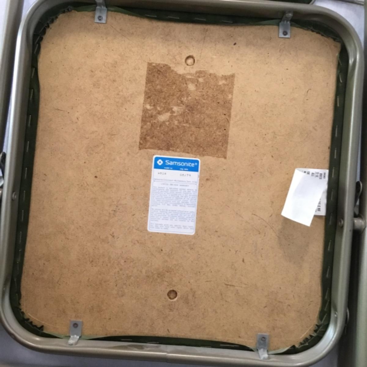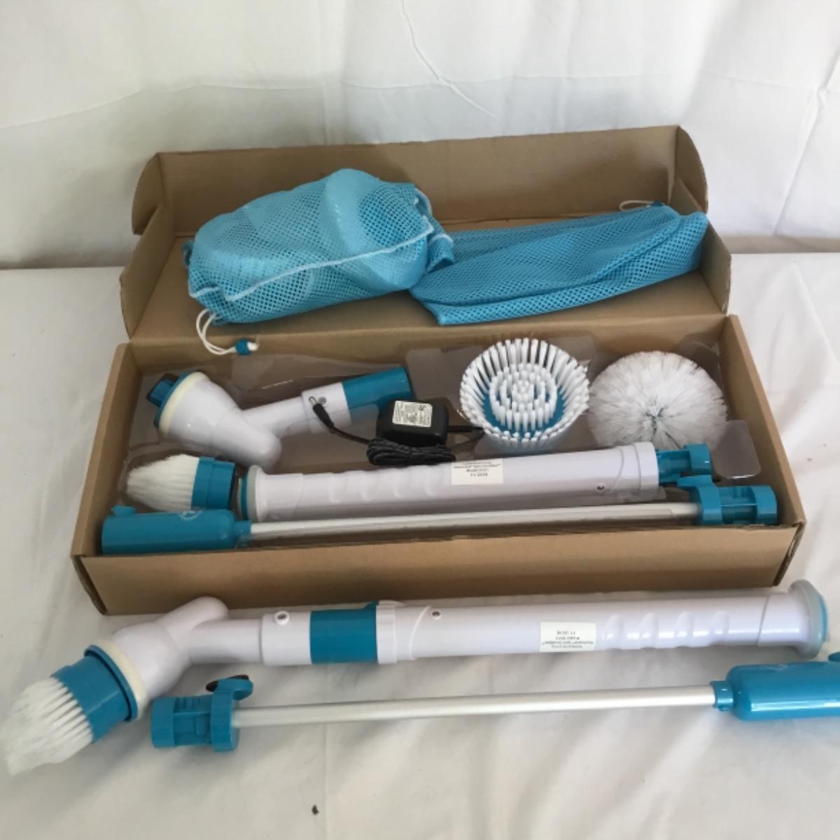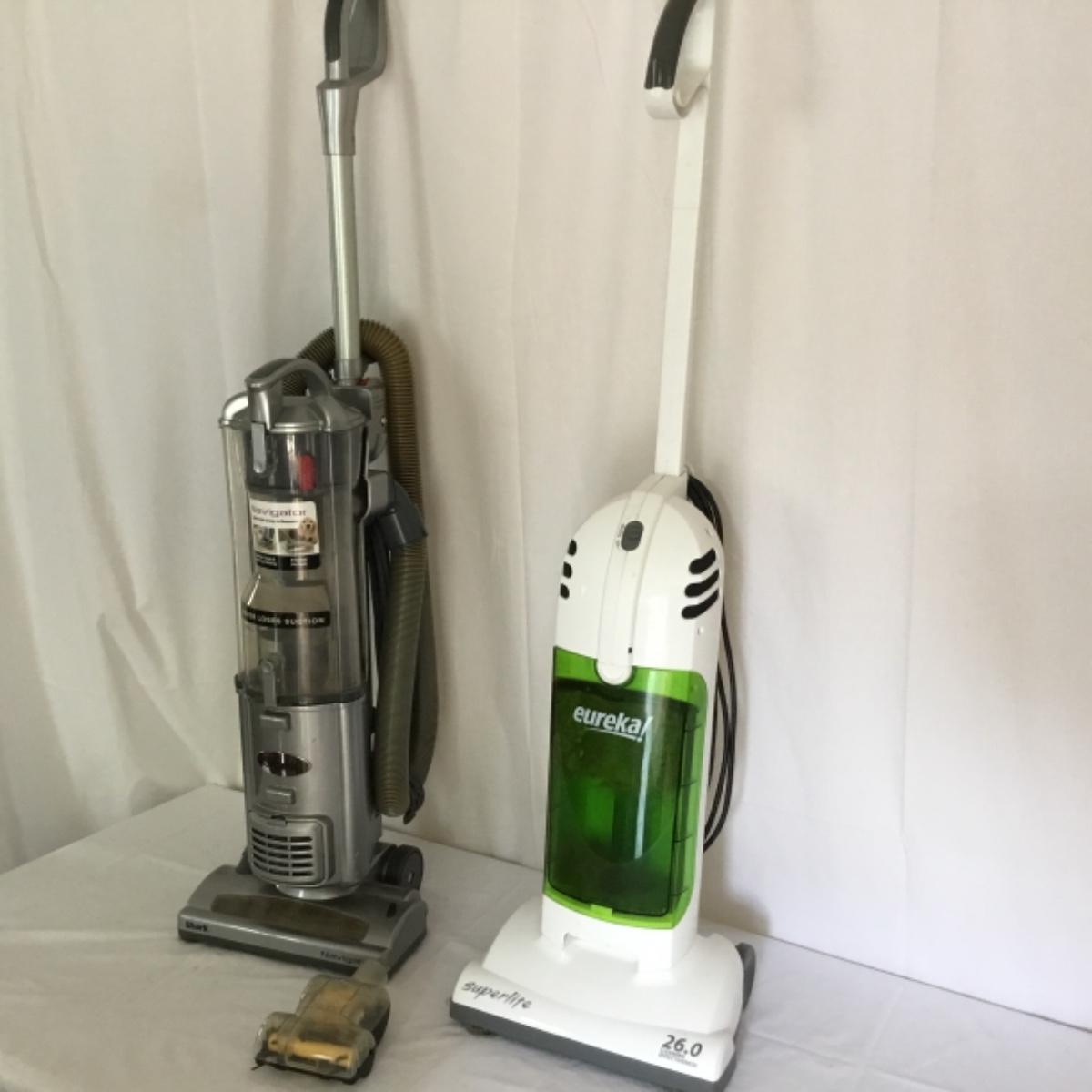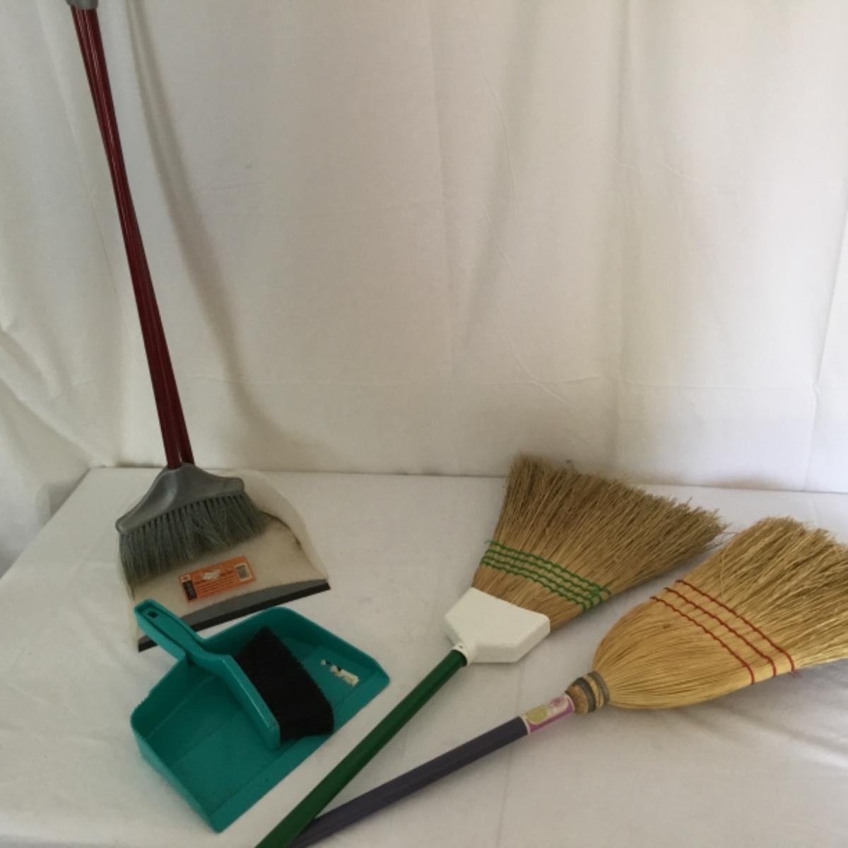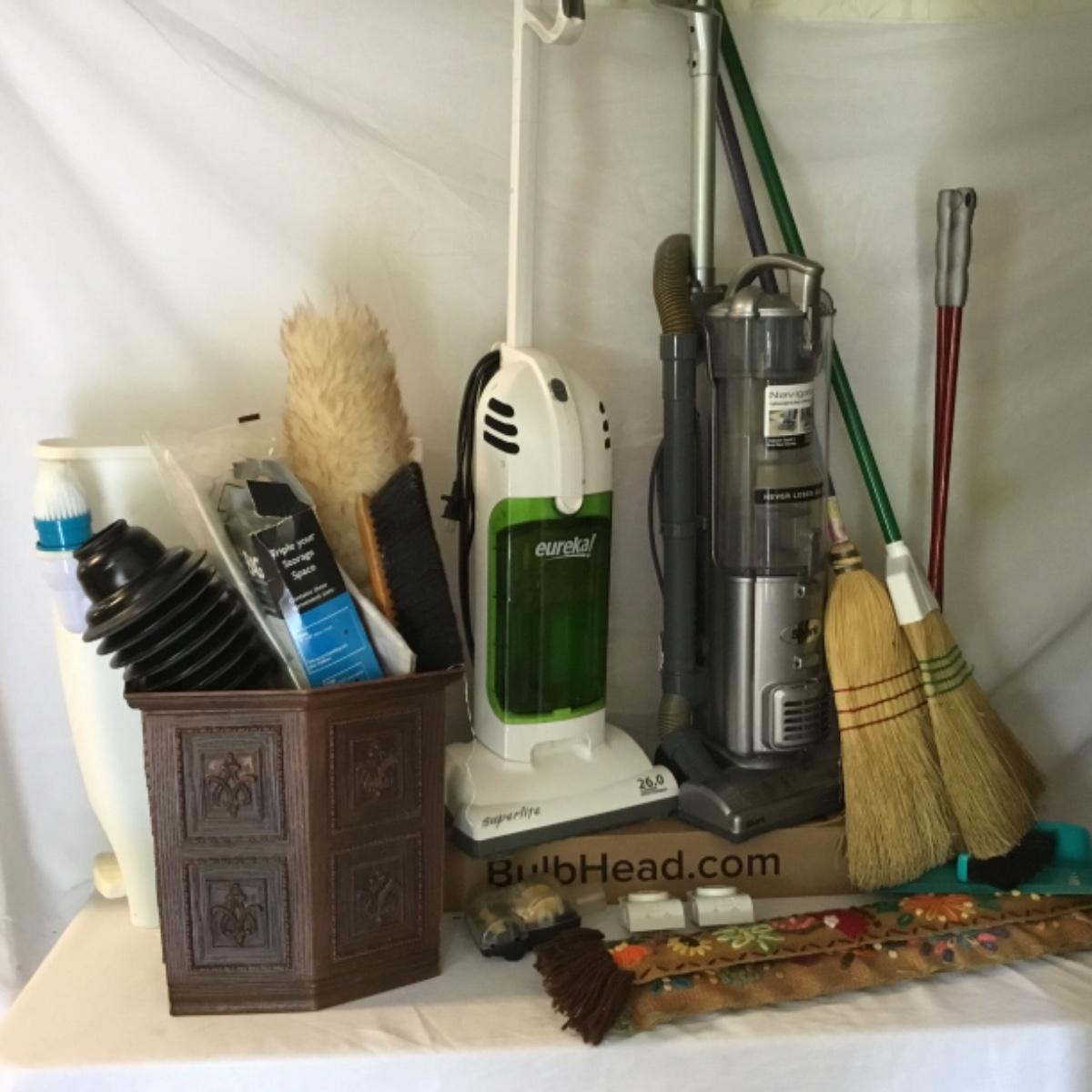 Fabulous lot with needed home essentials! Notice two vacuum cleaners, Eureka and Shark brand electric vacuums that powered on when tested. An electric scrubber with attachments, brooms, trash bins, and more. See photos for details. Notice many handmade embroidered yard-stick holders or find a new function for those beautiful wall hangings. Sewing kit included as well. Lot also includes a folding table and two matching folding chairs. Table measures 35"x35"x28". Pictured is collapsable wooden clothes drying rack that can stand up to 62.5" tall. Continue viewing pictures for further details and inventory on the lot. Local pickup only.