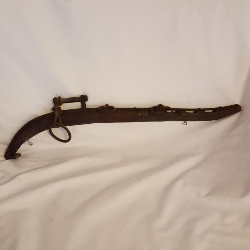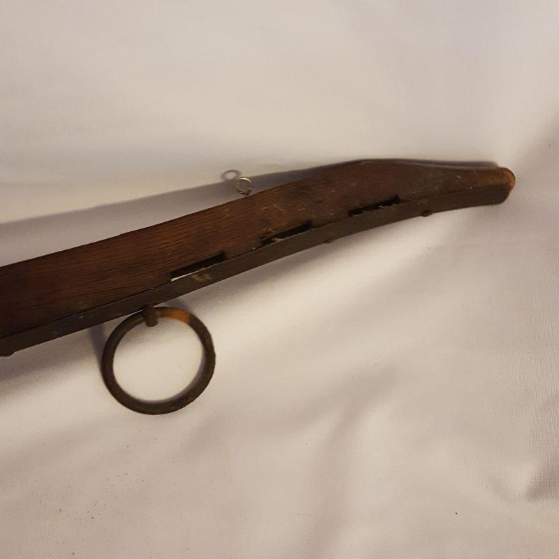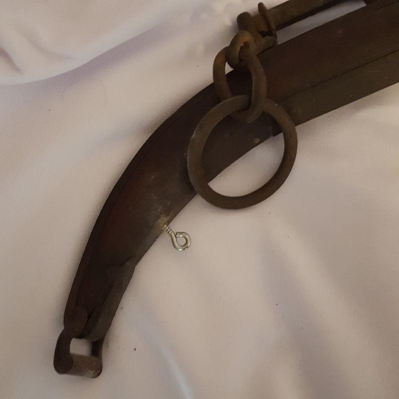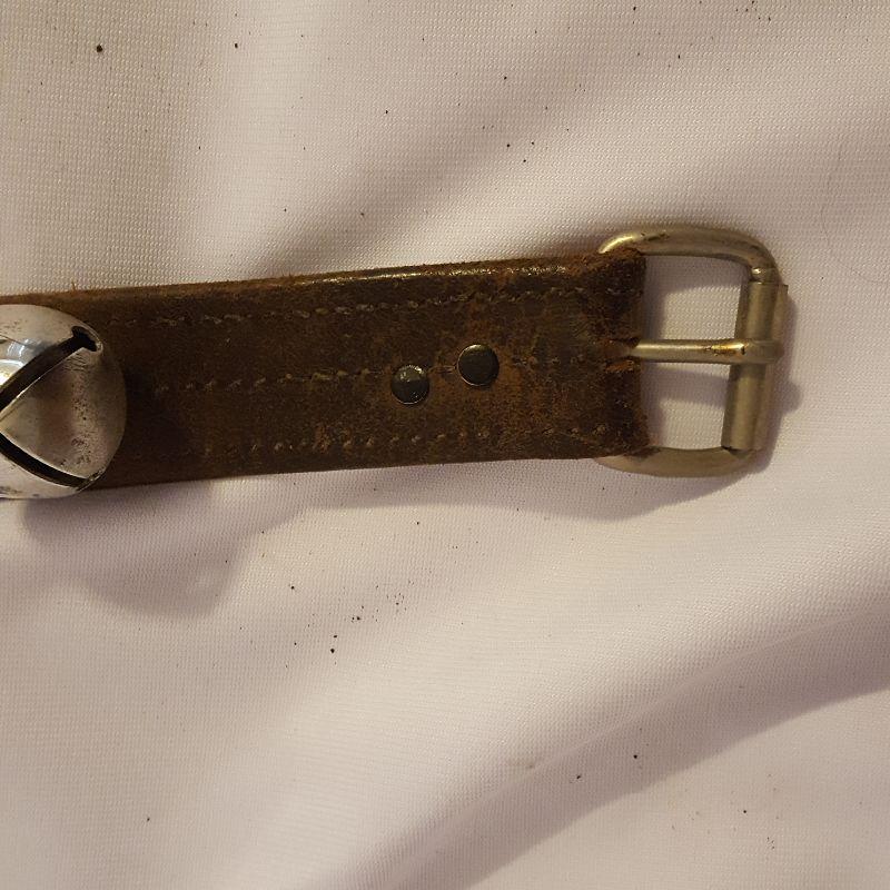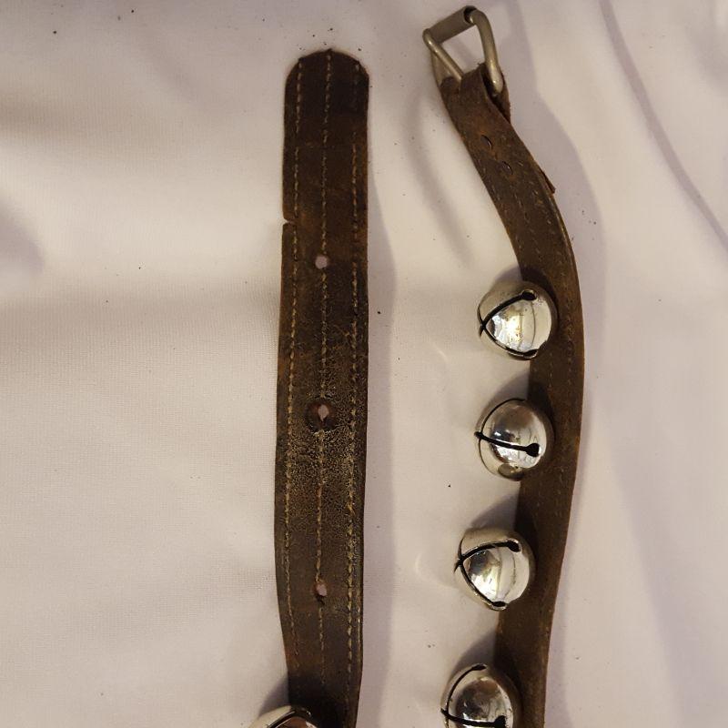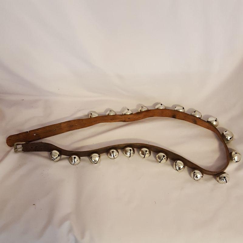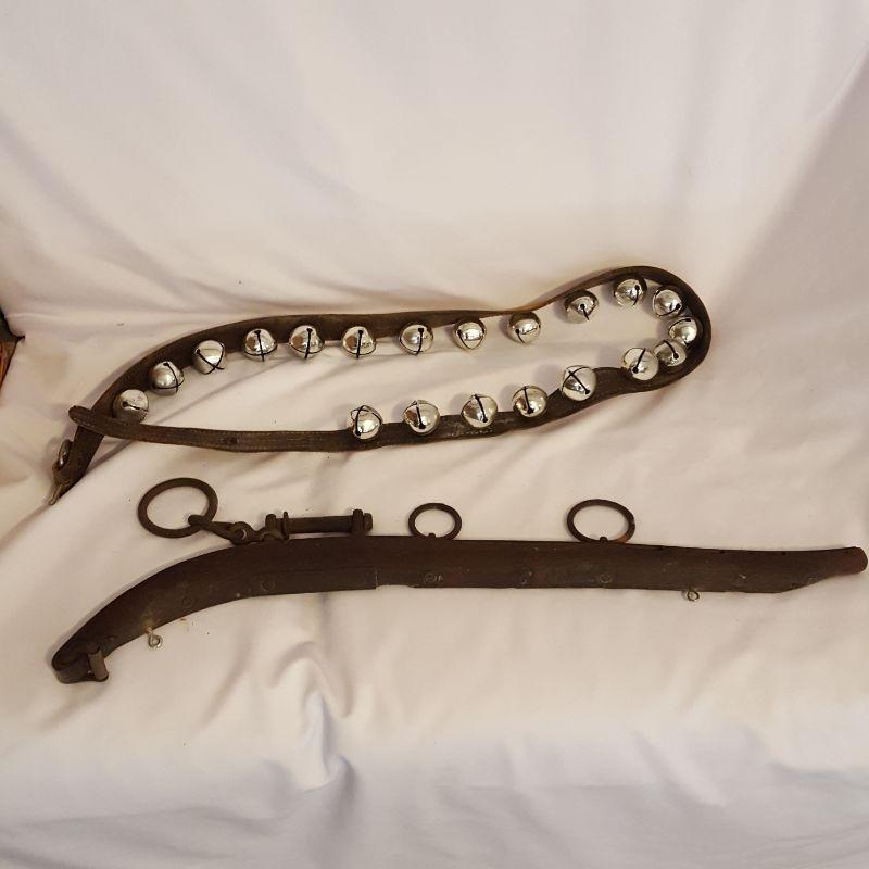 This is just the jingle you need in your life.! The sound this belt makes is awesome! The bell belt is approximately 60 inches of noise making! This lot also includes a decorative plow piece (28 inches). The plow has two round hook eyes attached to it for mounting on a wall for a decoration. The metal pieces on the plow have rust on them, but otherwise the piece appears to be in good condition. Shipping available.