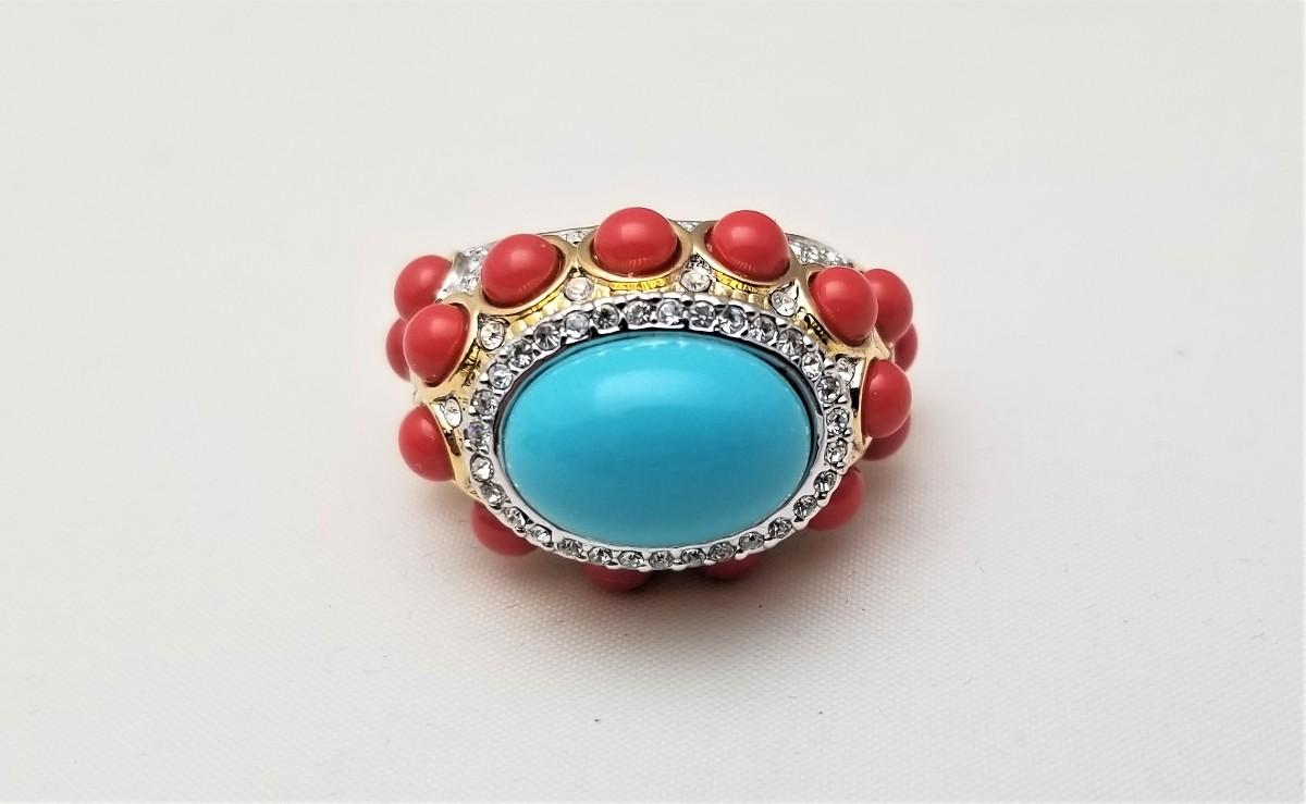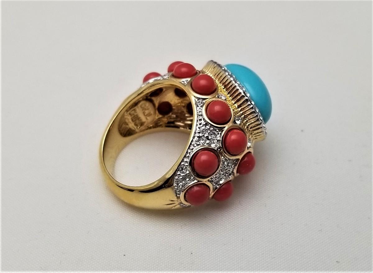 Very showy Kenneth Jay Lane ring - faux turquoise and cinnabar cabochons. Size 7. Good condition.