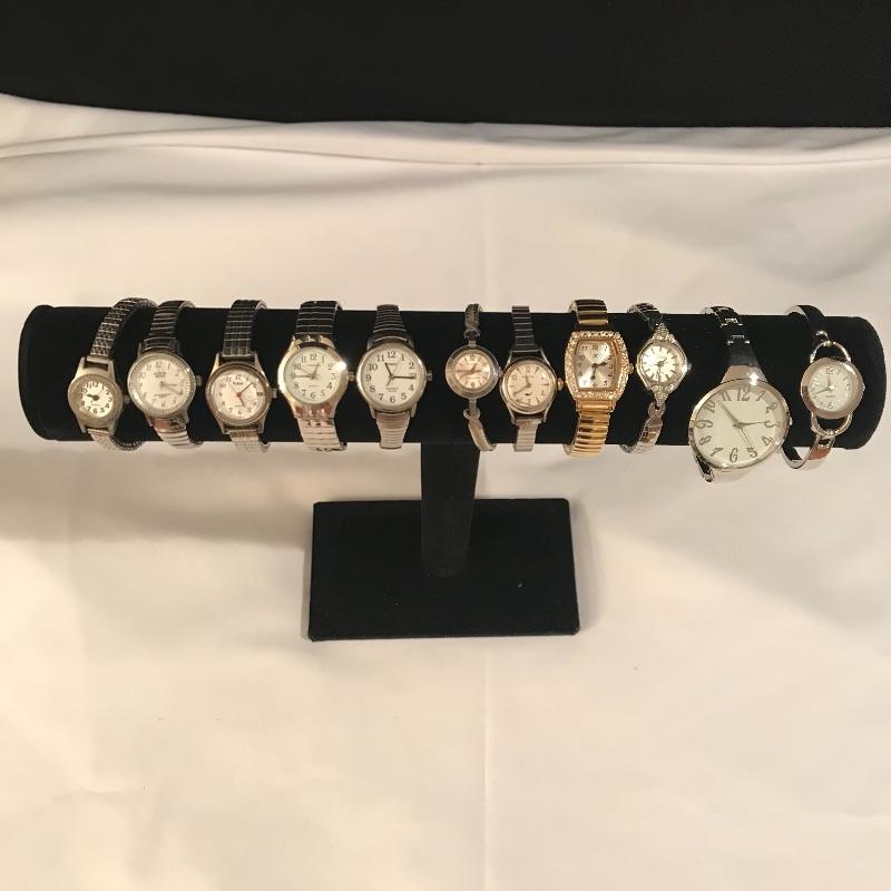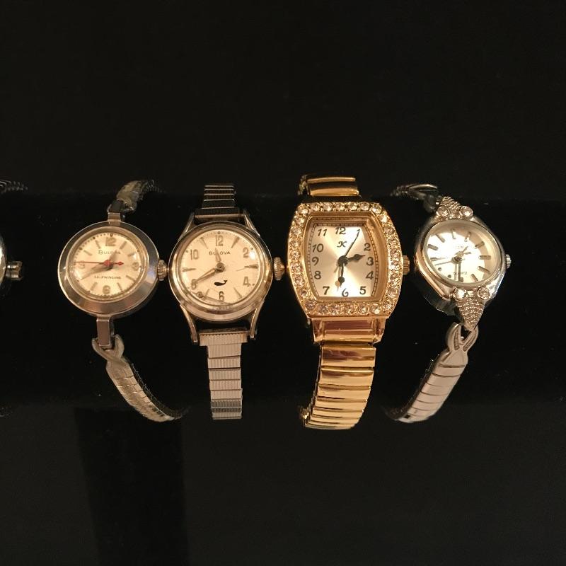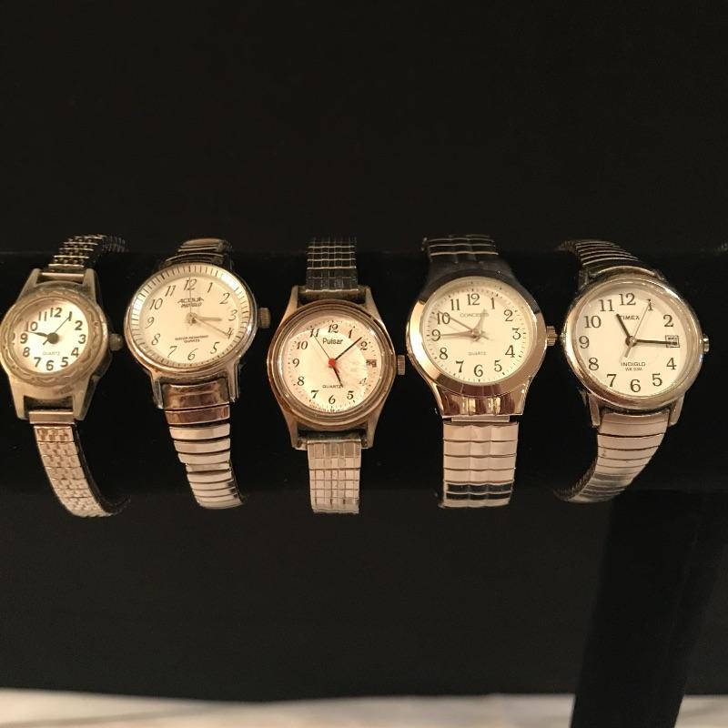 Eleven total watches with most being stretchy bands. Brand like Quartz, Timex, Bulova, Kareena and Pulsar. None were operating they likely need new batteries and the second hand on one Bulova was off the winder, see pix. Shipping available.