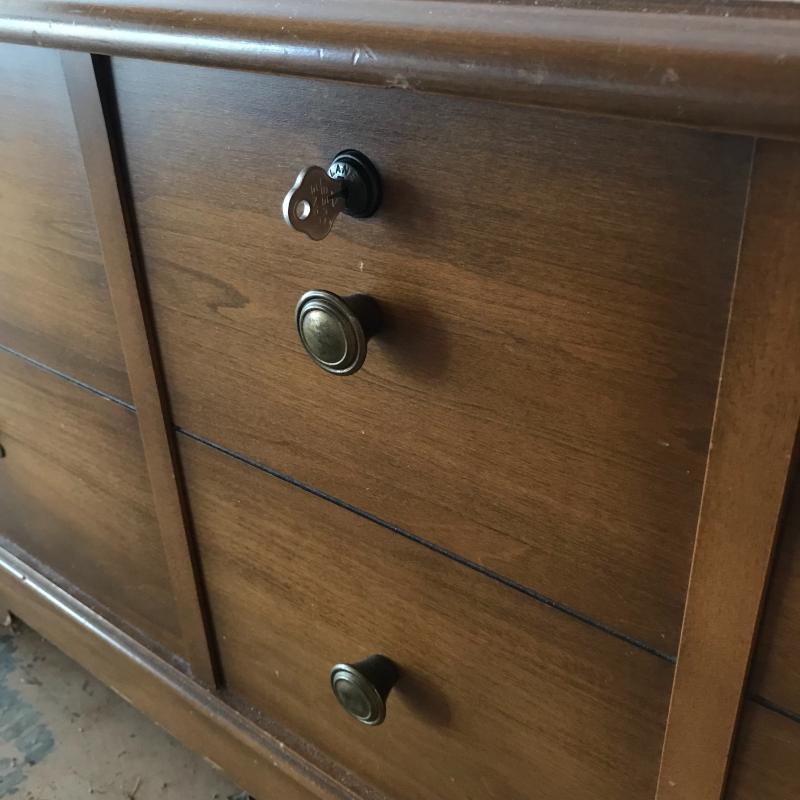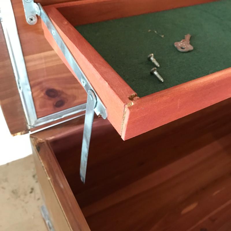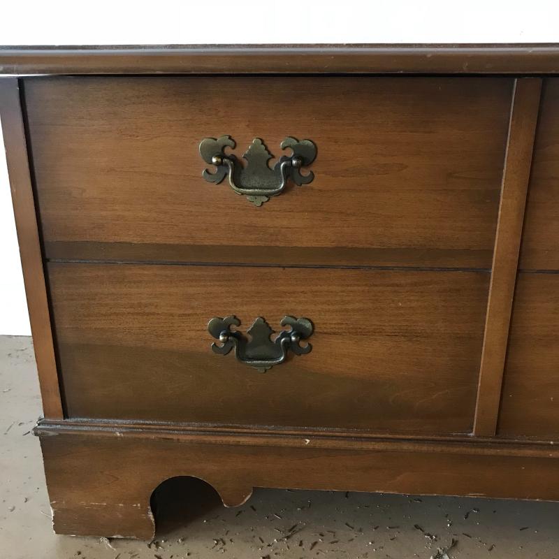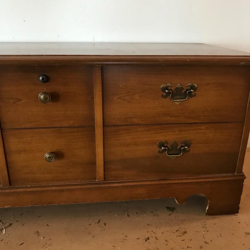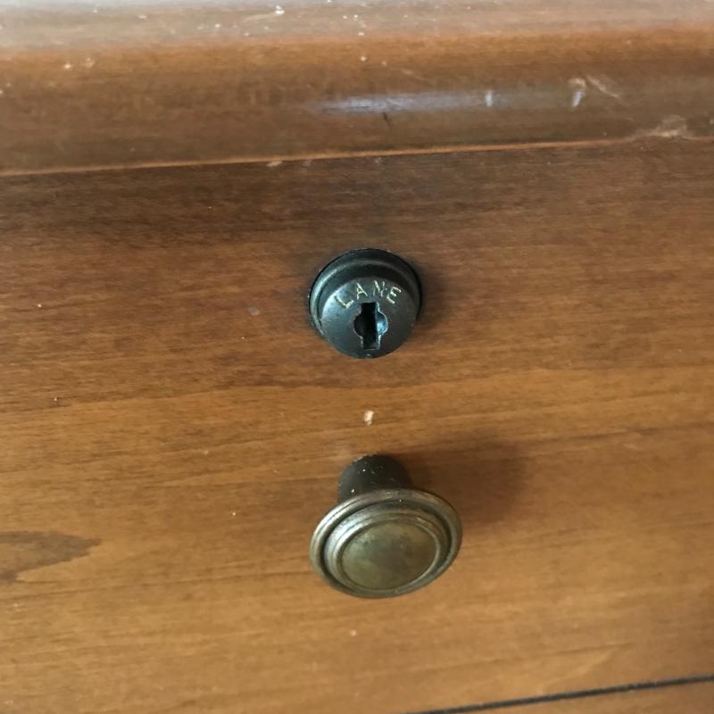 Gorgeous Lane chest with faux drawer front panel and key included. The inside is very clean, almost looks unused. The top tray was probably removed at some point, but all the hardware is included to secure it. Chest measures 44” x 17” x 19”. No shipping.