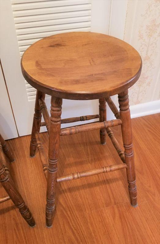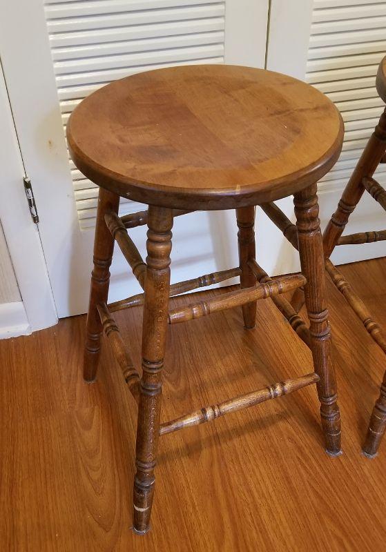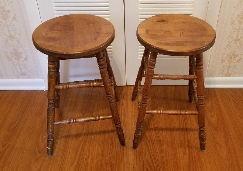 Nice traditional matched pair of stools - solid wood. Sturdy. Each is 14" across and 2 feet tall.