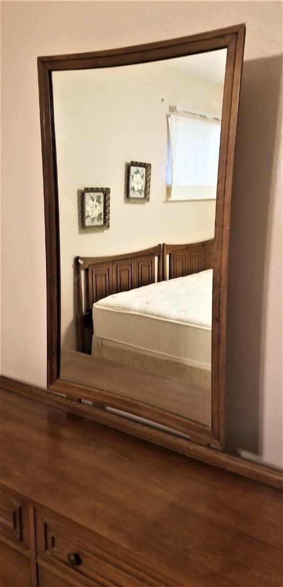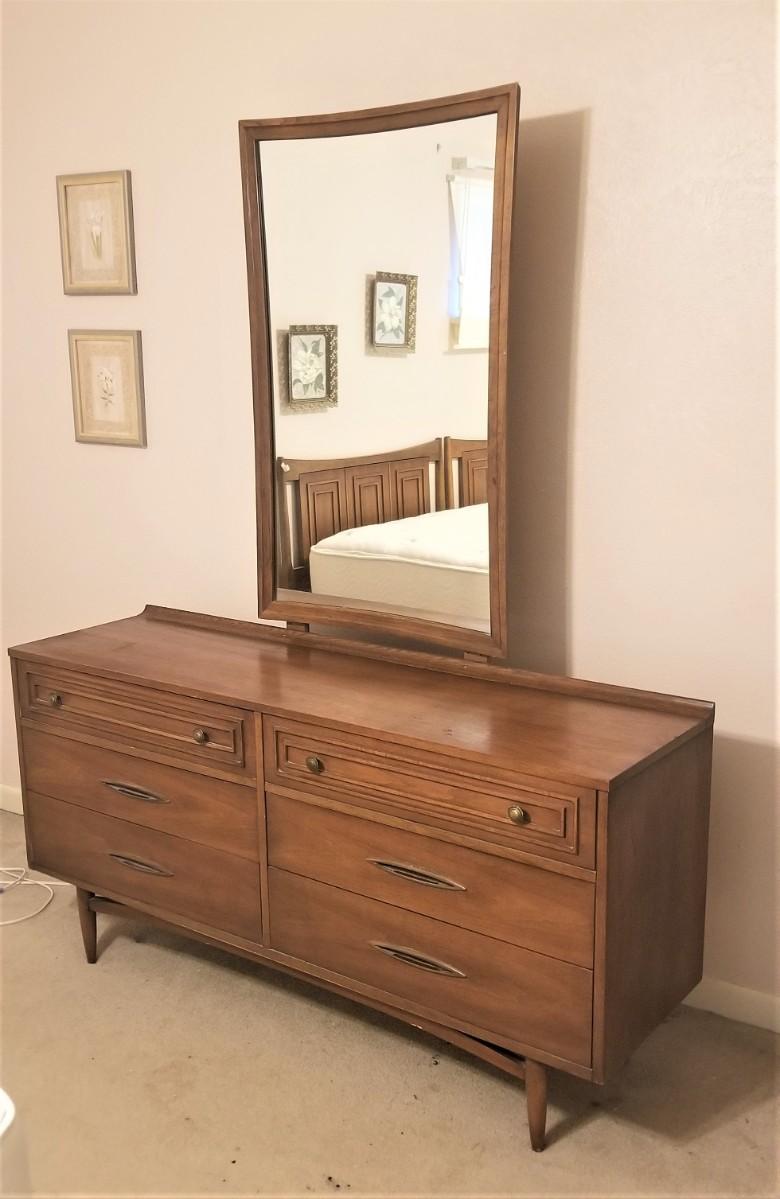 Cool MId Century Modern dresser by Broyhill Furniture Company - 1960's Sculptra design. 17" deep, 5 feet long, 30" tall. The Mirror is detachable and is 42.5" tall and 26" across. Good vintage condition - all original.