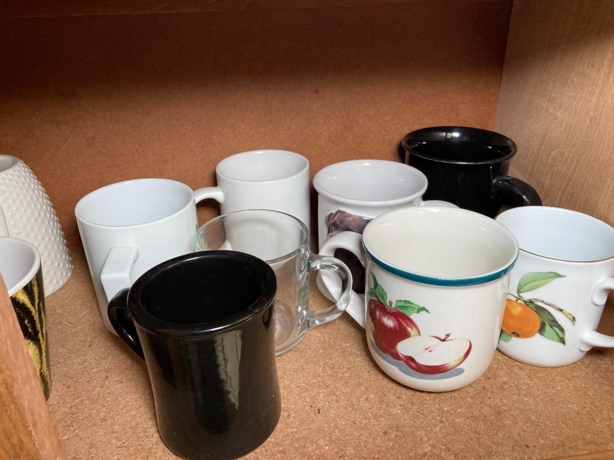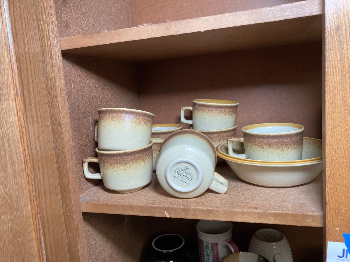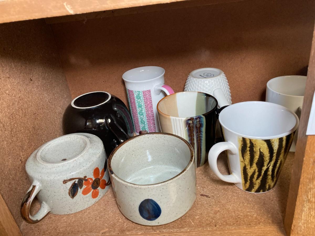 6 Mikasa Stylecraft mugs and 2 matching bowls. Assorted other mugs as shown.