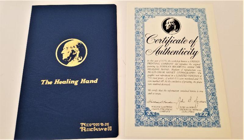Numbered 83/750 - made in 1979. Norman Rockwell's "Healing Hands" lithograph. All original inserts included. Great gift for a doctor. Measures 20 3/4" x 16".