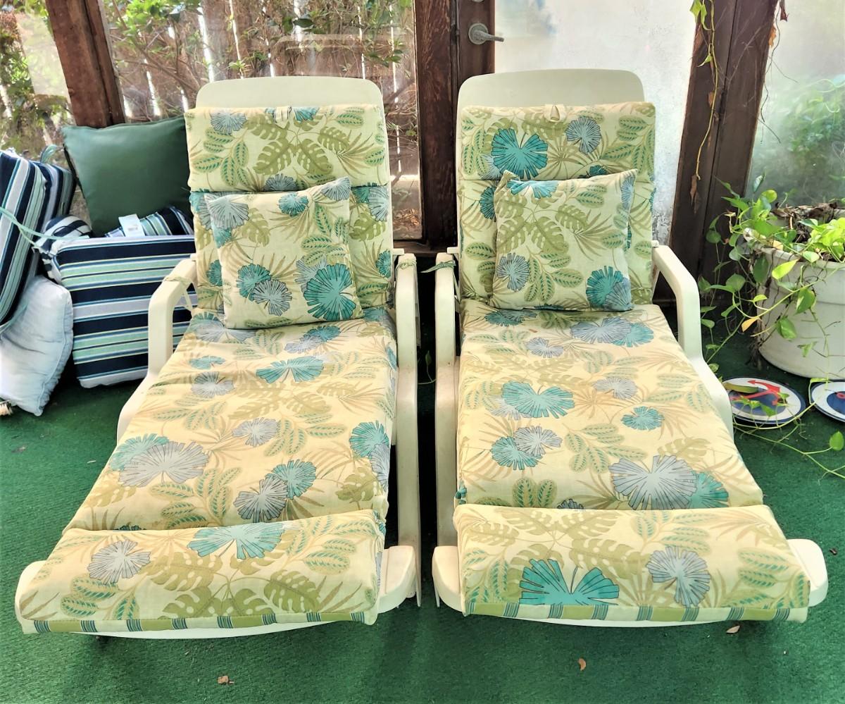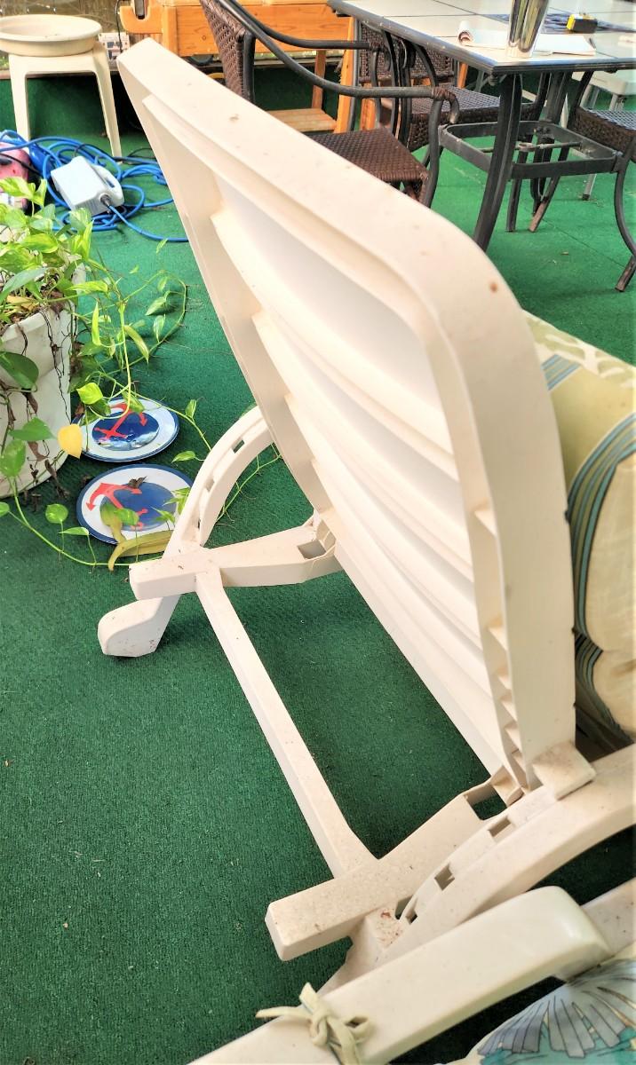 Pair of heavy white vinyl/plastic patio or poolside chaise lounges, covers/pillows included. These are adjustable to several positions. 74" long when fully extended, 27" across. Good used condition - give them a good hosing off and they will be ready to go.