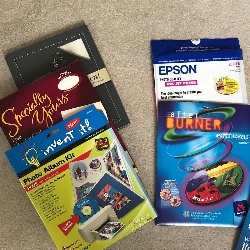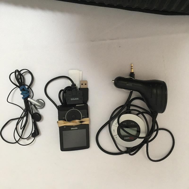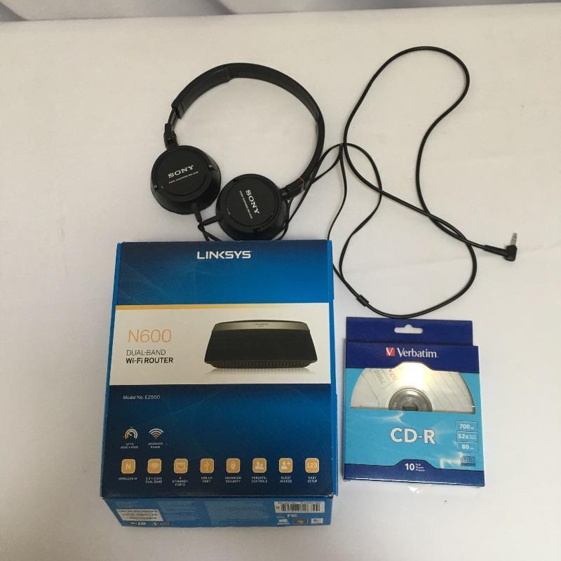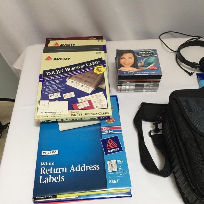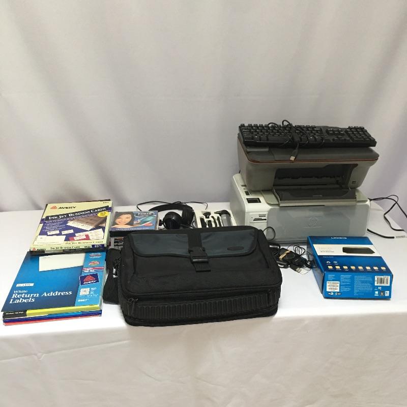 This lot has two HP printers - a HP Deskjet 3050A Printer and a HP C4280 printer(Both turned on when plugged in). It also includes Sansa Fuze media player, FM transmitter, WiFi router, Sony headphones, Targus laptop case, labels and blank discs. The Media player, router and fm transmitter were not tested.