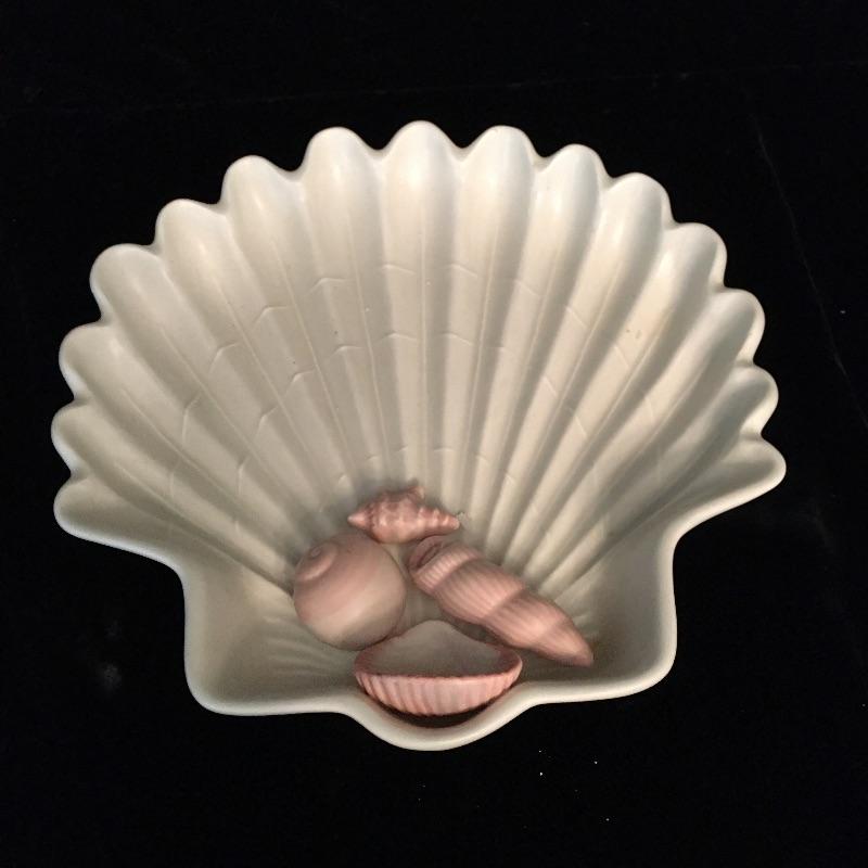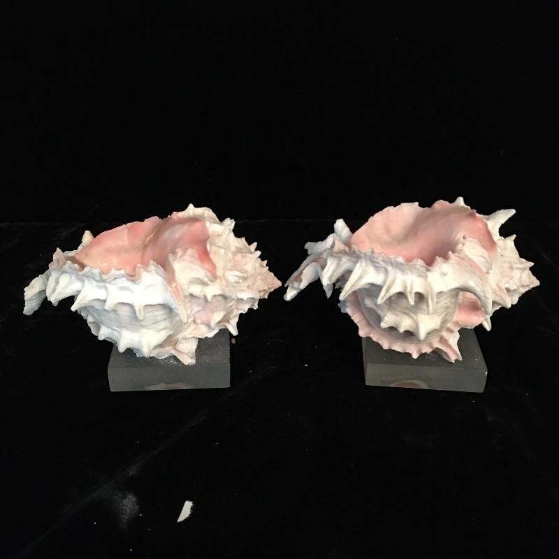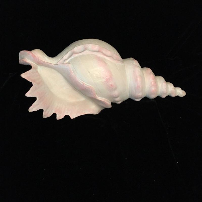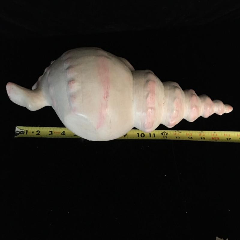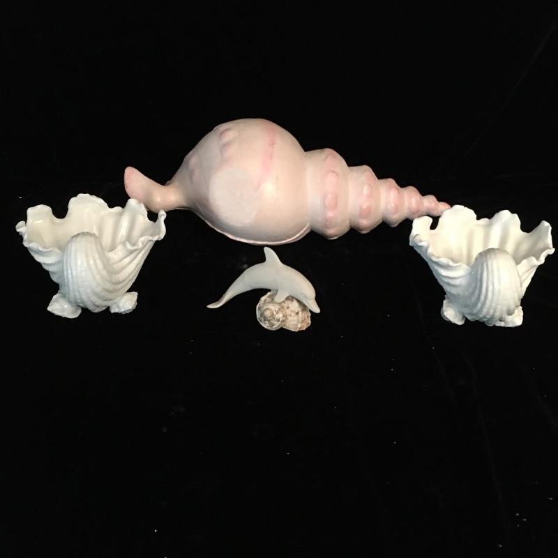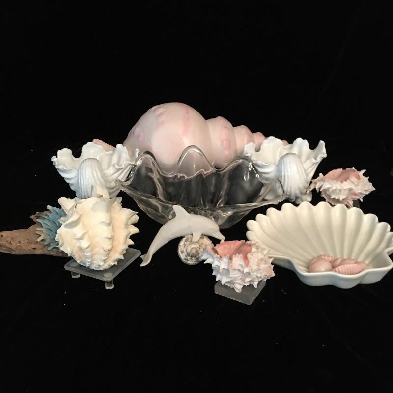 Shell decor includes three shells mounted on plexiglass stands, Dolphin figurine mounted on a shell and the rest are faux shells in what appears to be be ceramic, plexiglass and plaster. Largest faux shell measures approximately 17” long with a 8”D.