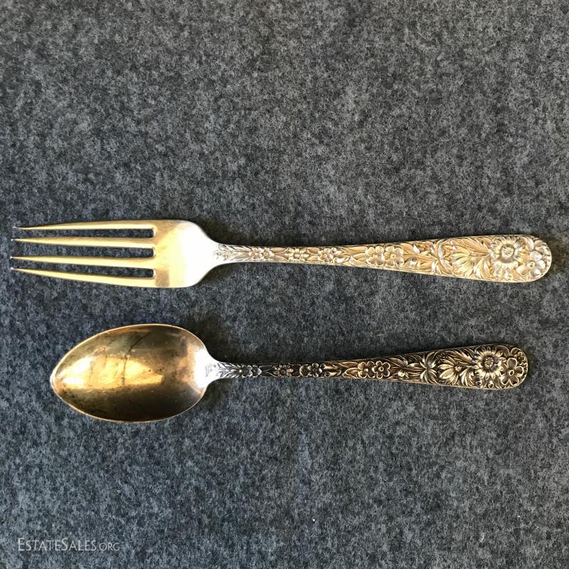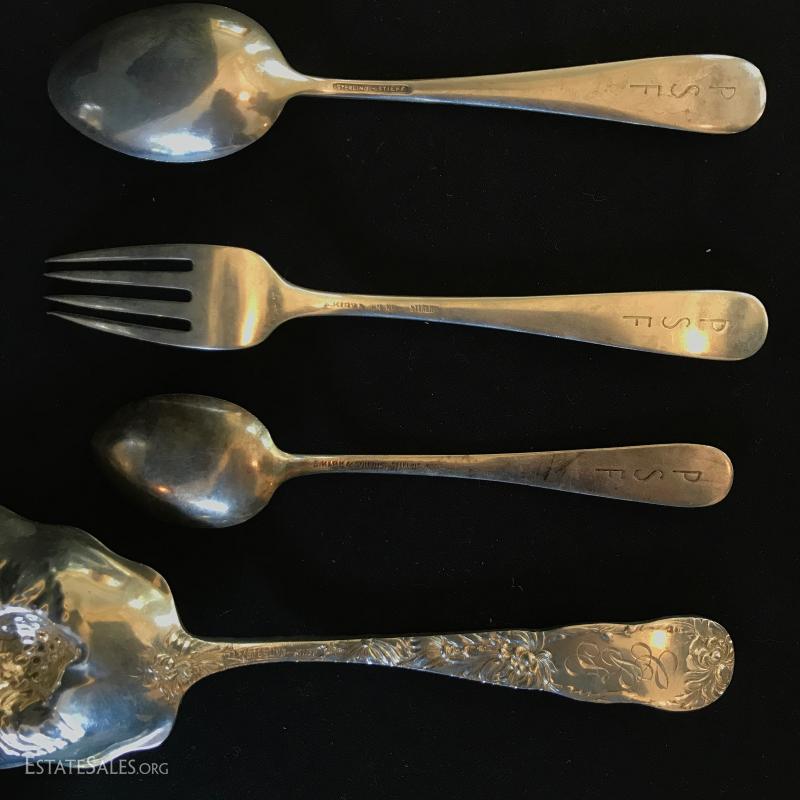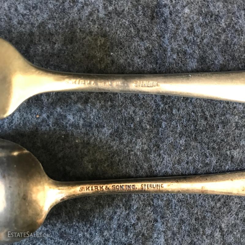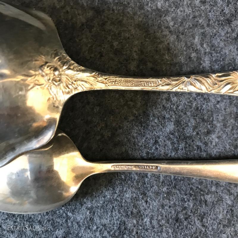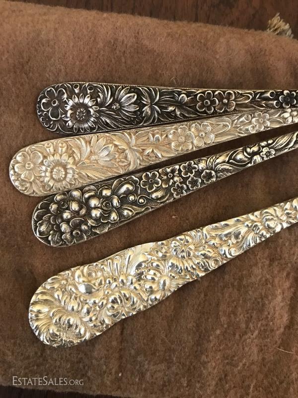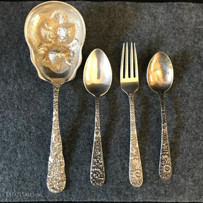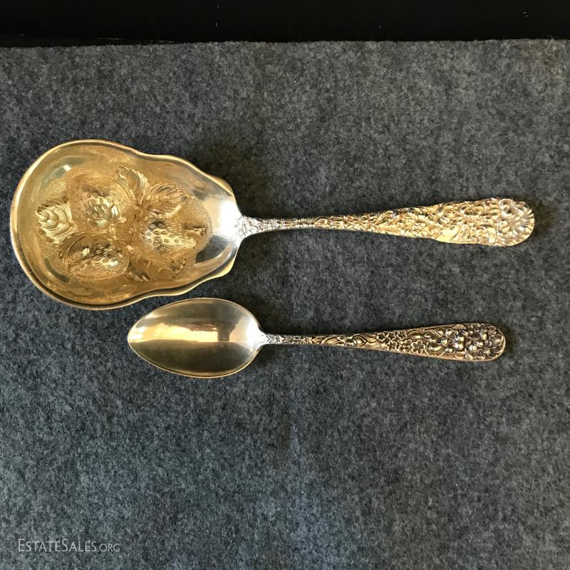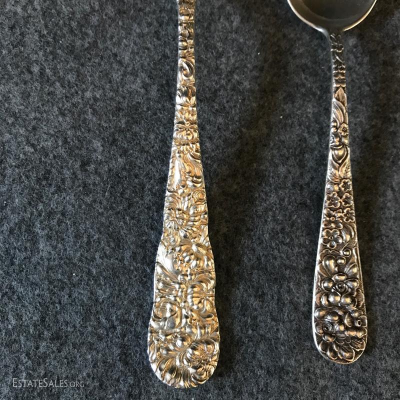 Gorgeous Sterling pieces. Includes two Stieff and two S.Kirk & Son Inc. May be Rose pattern? Includes a Repousse Berry Spoon by Stieff. All have initials engraved on back. See photos for details. Shipping available or local pick up in Flat Rock, NC.