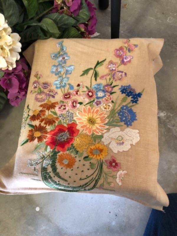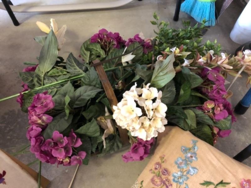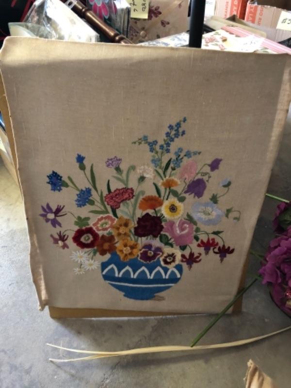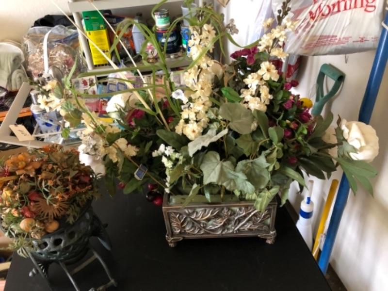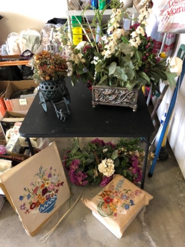 Lot 82. Two floral needlepoint canvases; silk flower arrangements in metal containers; one metal rectangle and one Japanese style planter--WAS $75““NOW $56.25