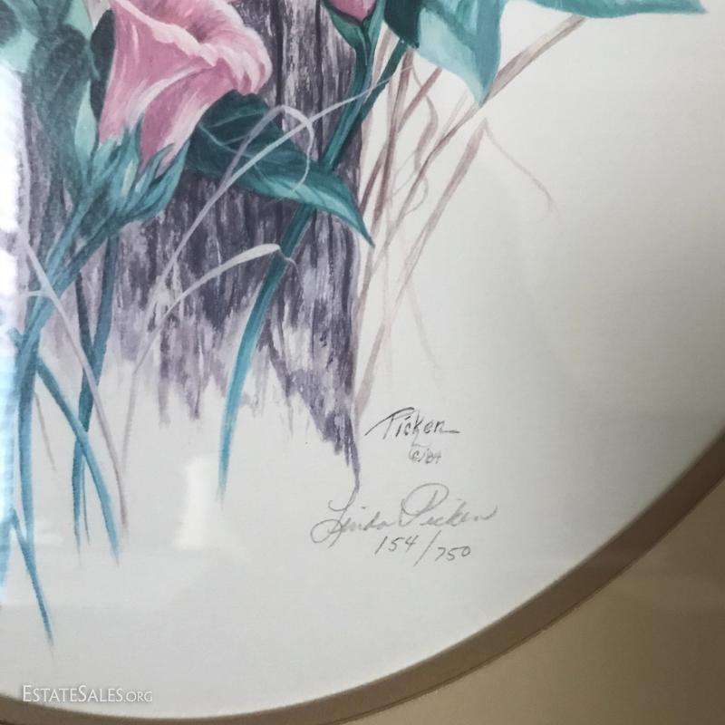 Two framed limited edition prints. Largest is 26.5"l x 20"w. Artist Linda Picken. Autographed and numbered. 154/750. Smallest is 12.5"l x 9.5"w. Artist is Joan Heflin Rankin. Autographed and numbered. 251/300. Shipping available or local pick up in Asheville, NC.