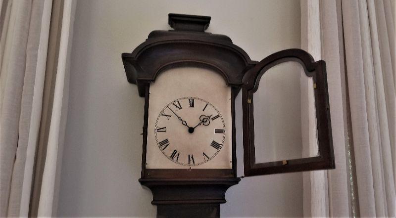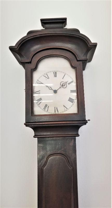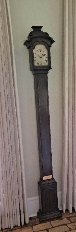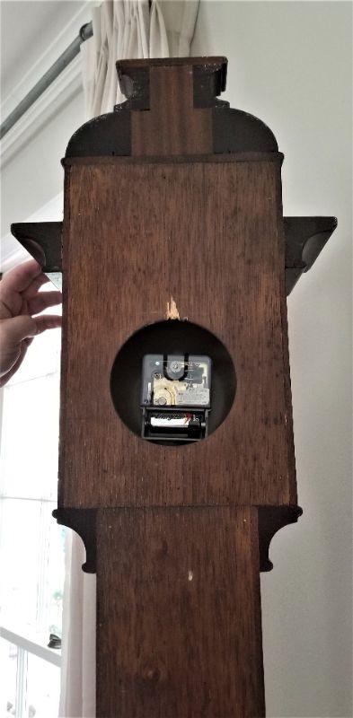 Slim and tall contemporary battery-operated case clock. Working - keeps time. Hinged front. Made in Spain. 78" tall, 10.5" wide