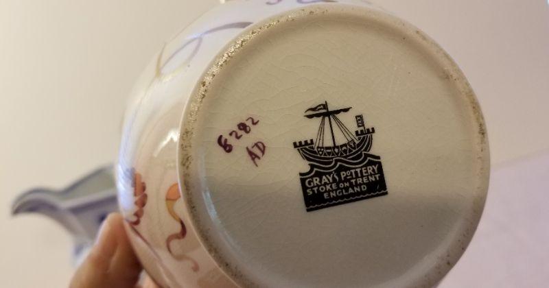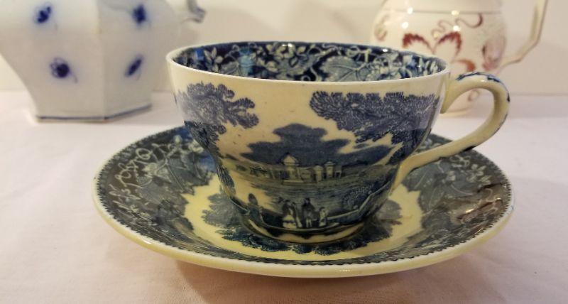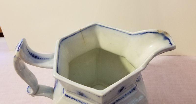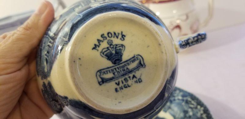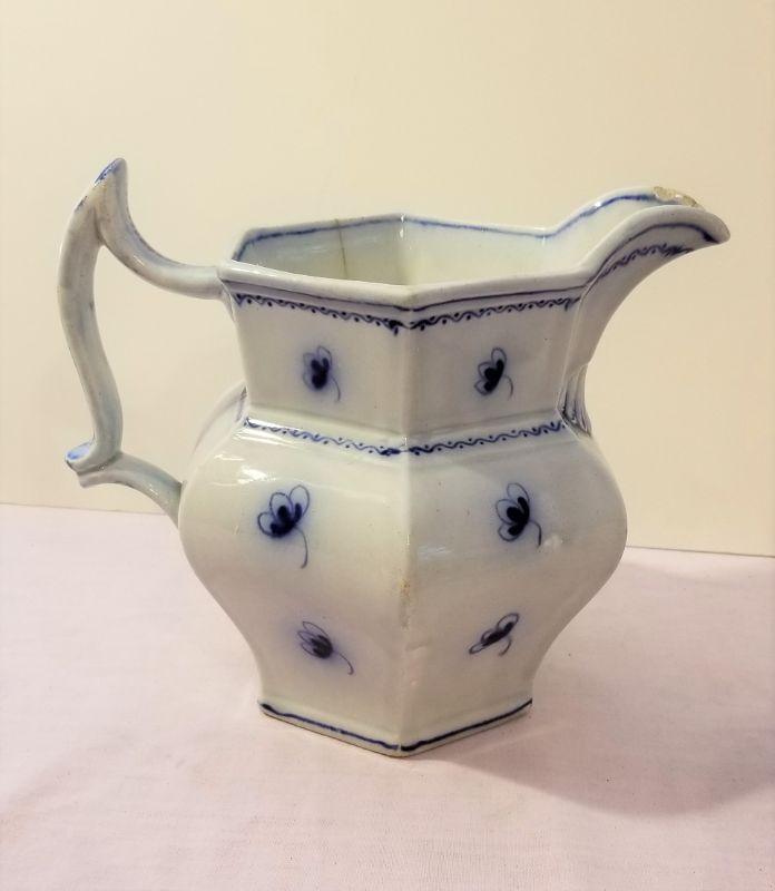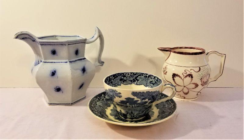 Three piece lot of Victorian/Edwardian era china - Ironstone blue/white pitcher, 7" tall, hairline crack inside (does not go through), and a couple of small old "chiggers" to spout - good display piece; English Mason's Ironstone "mush" cup with saucer - classic blue/white, 4.5" across, saucer 7" across, and nice Gray's Potter (England) Lustre Pitcher, 5" tall - great condition.