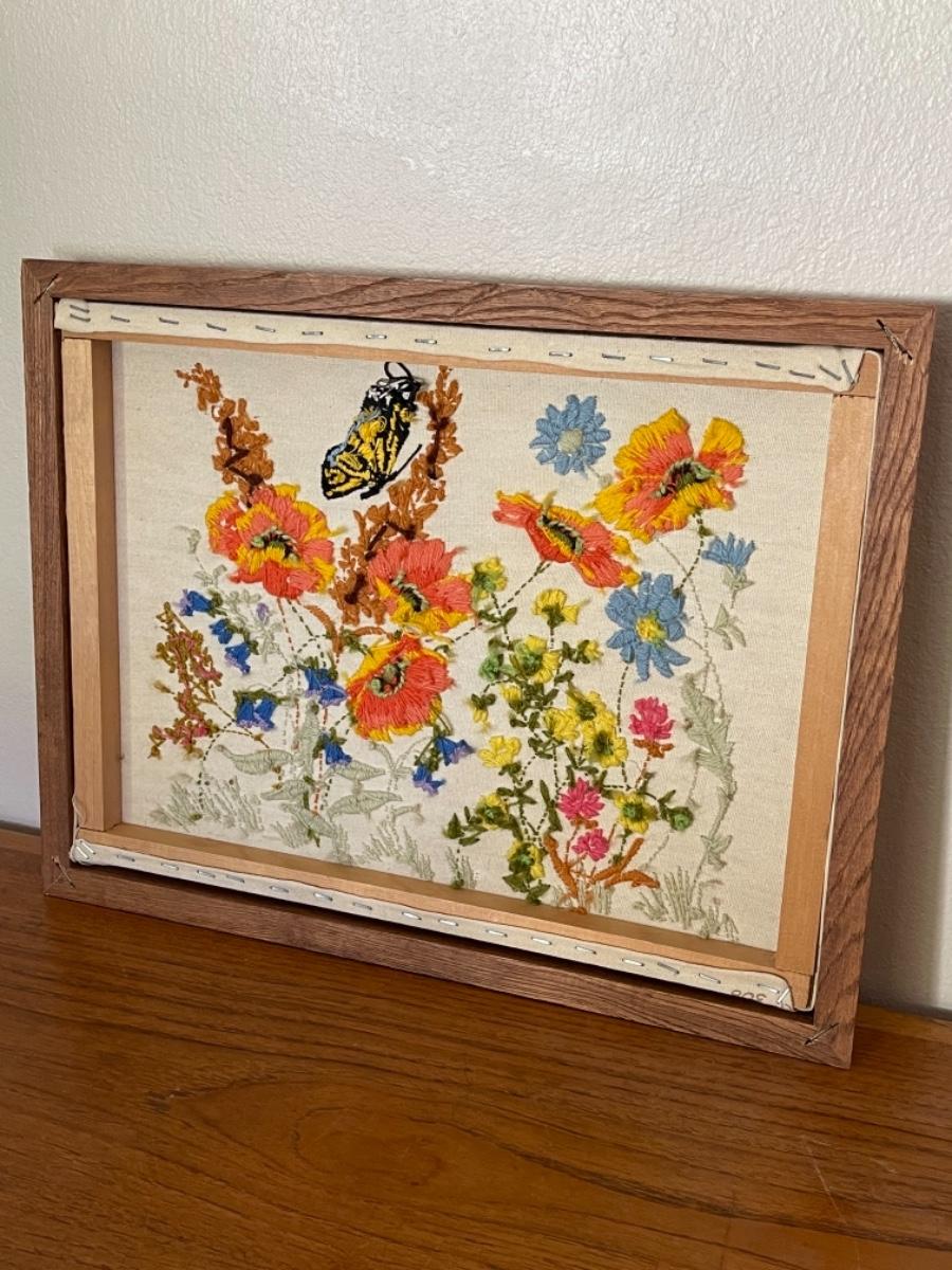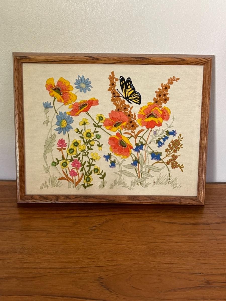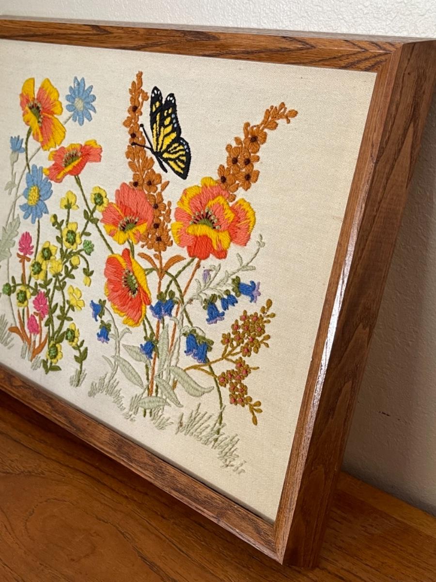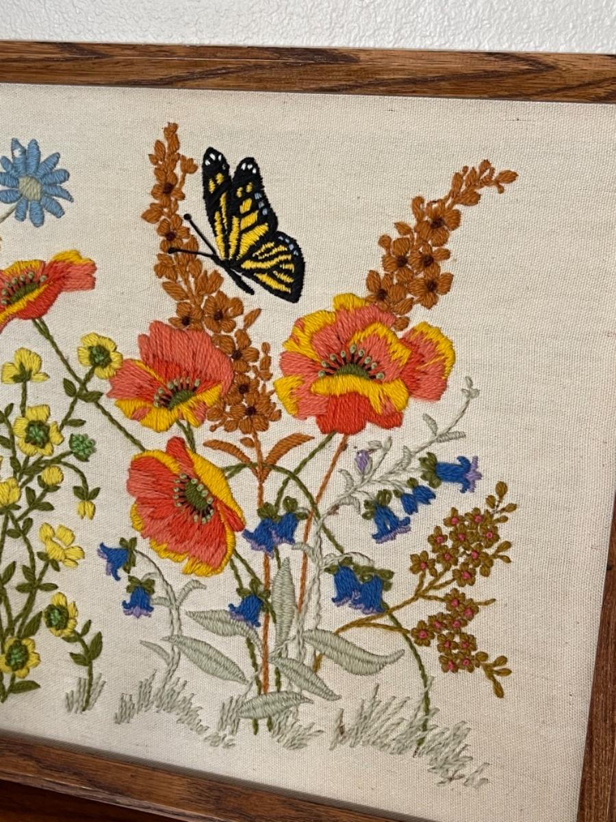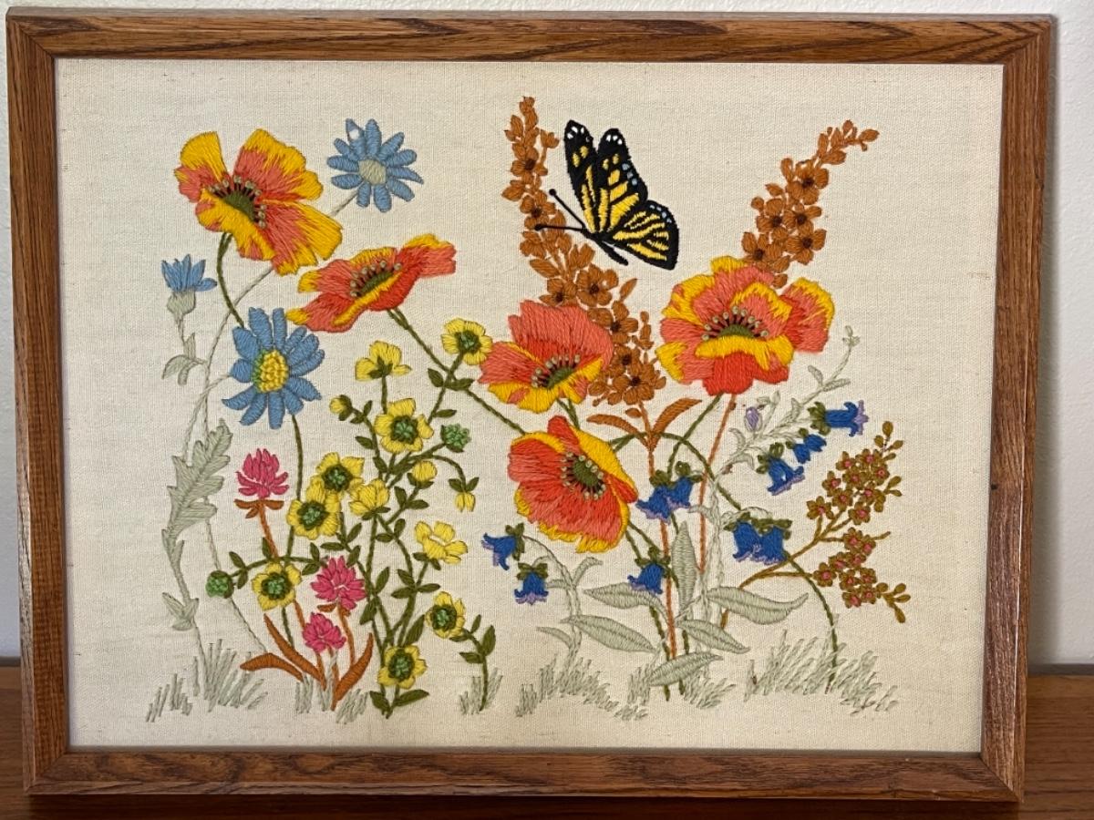 Beautiful, bright and bold 1979s, hand made creel embroidery in oak frame. Measures 17 1/2@ x 13 1/2.” Excellent condition. Shipping available.
