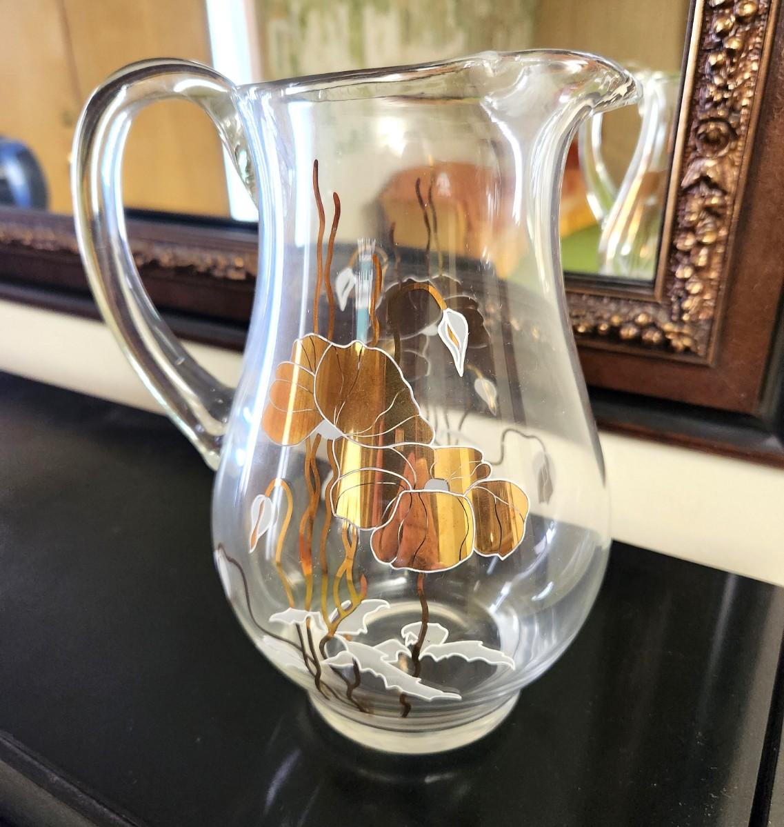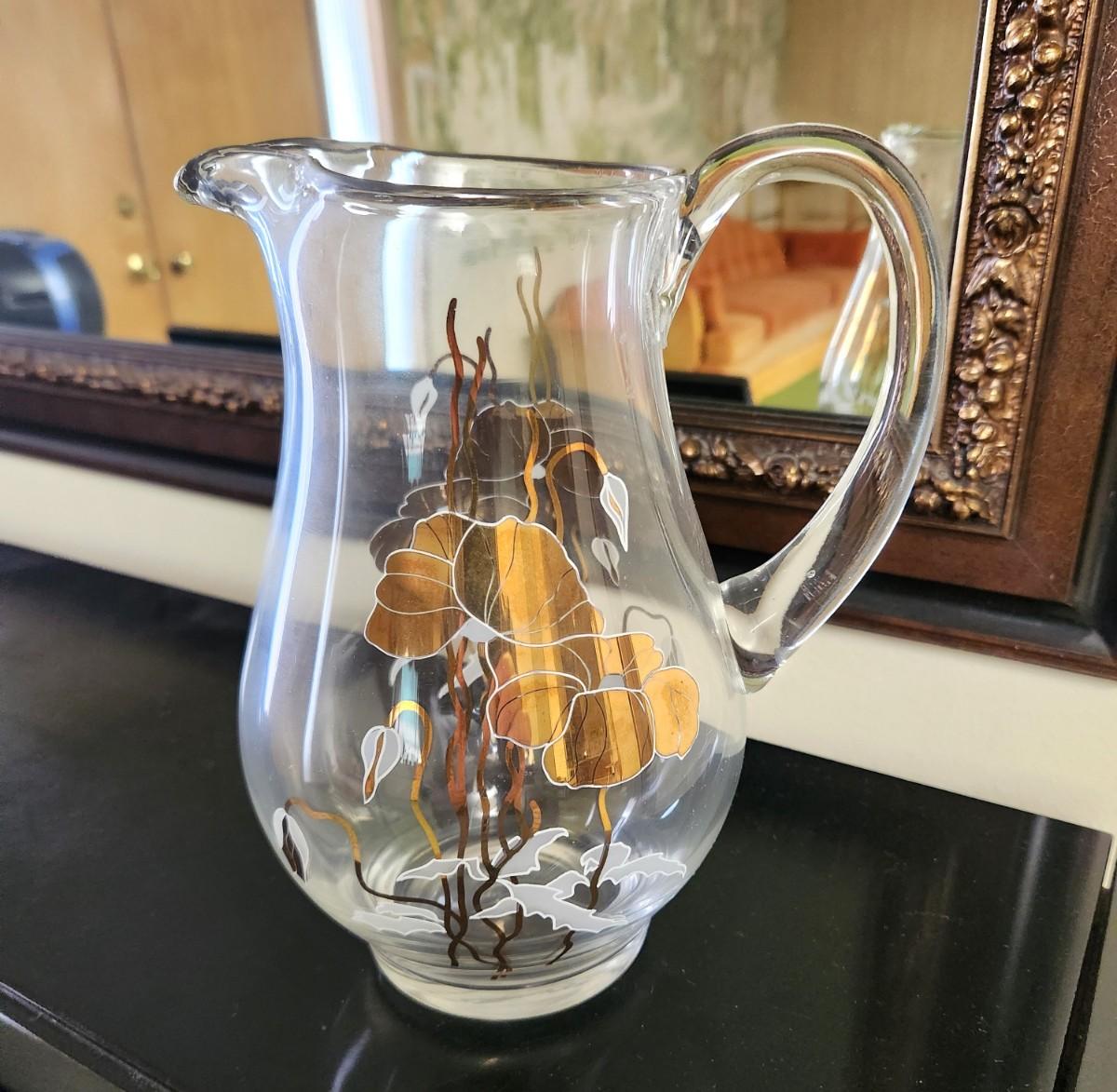 Vintage Mid Century Glass Bar pitcher - 9.75" tall - Gold Water Lillies. Good condition.
