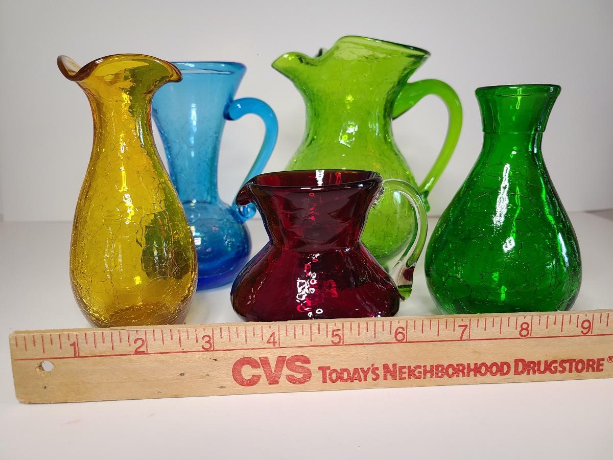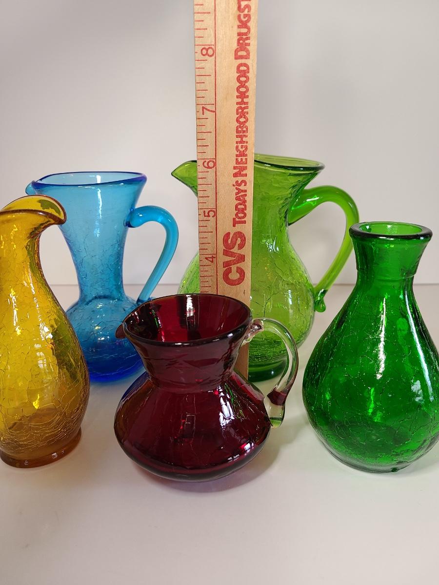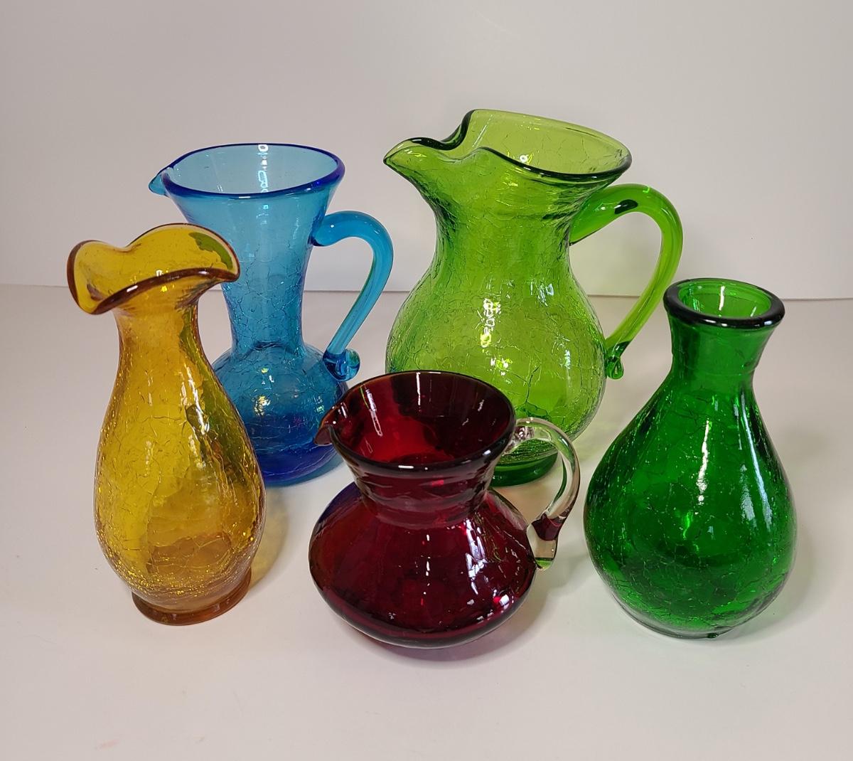Lot 82: Vintage MCM Colorful Lot of Small Crackle Glass Pitchers and Vases