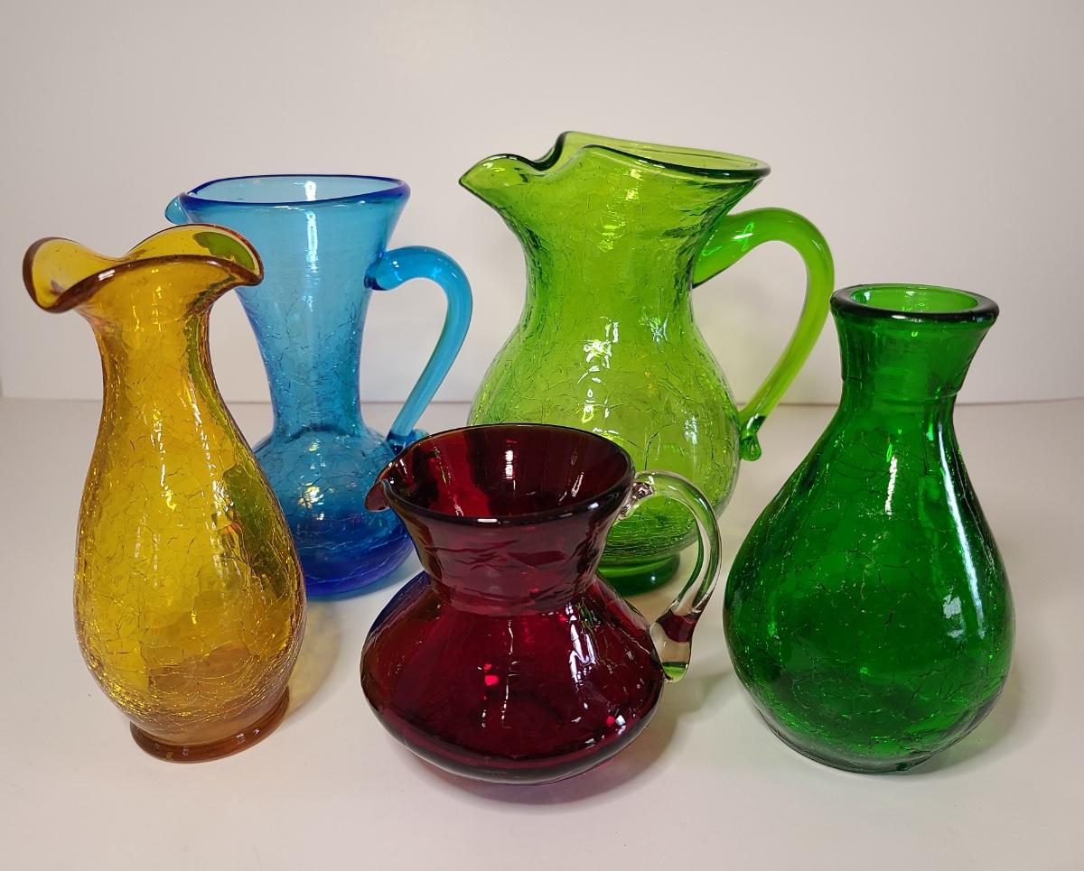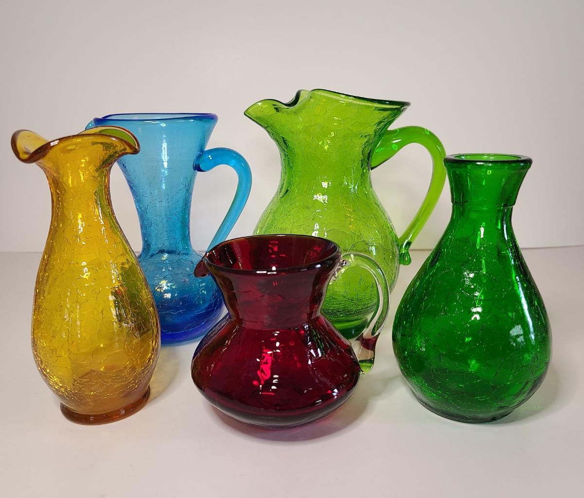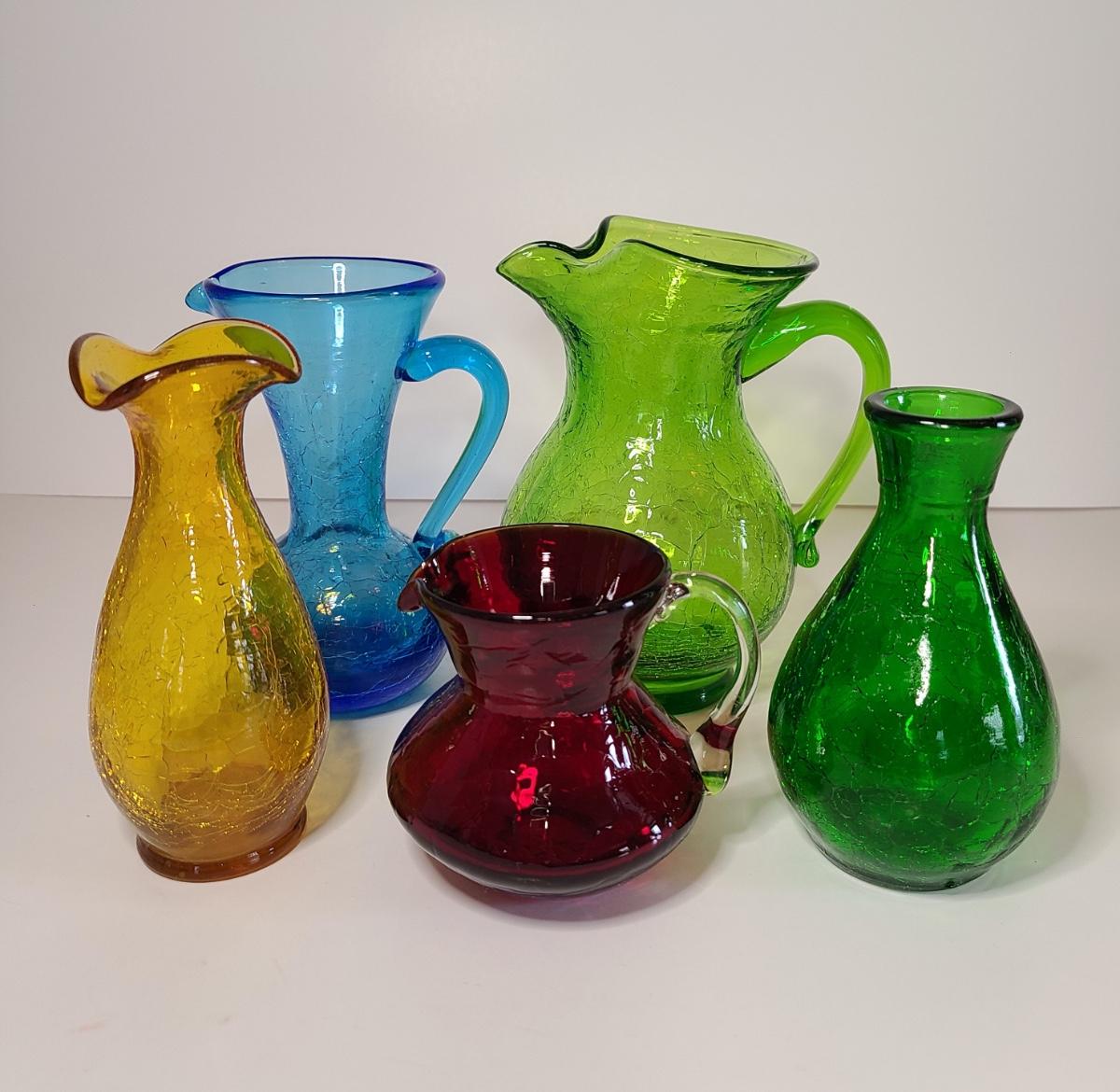 Lot 82: Vintage MCM Colorful Lot of Small Crackle Glass Pitchers and Vases