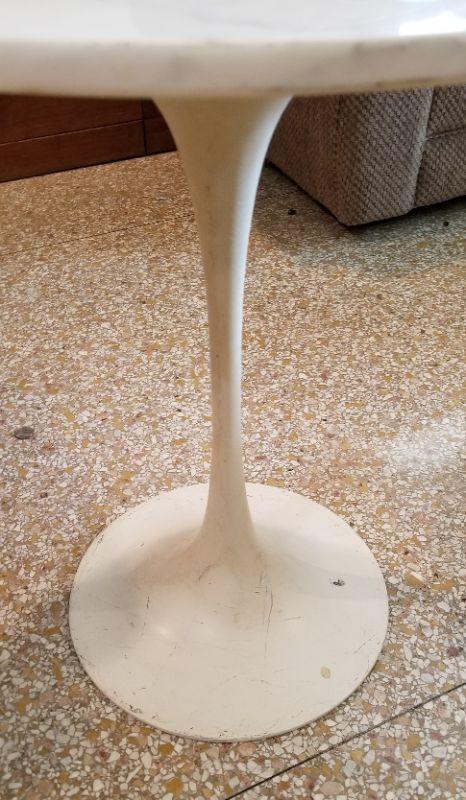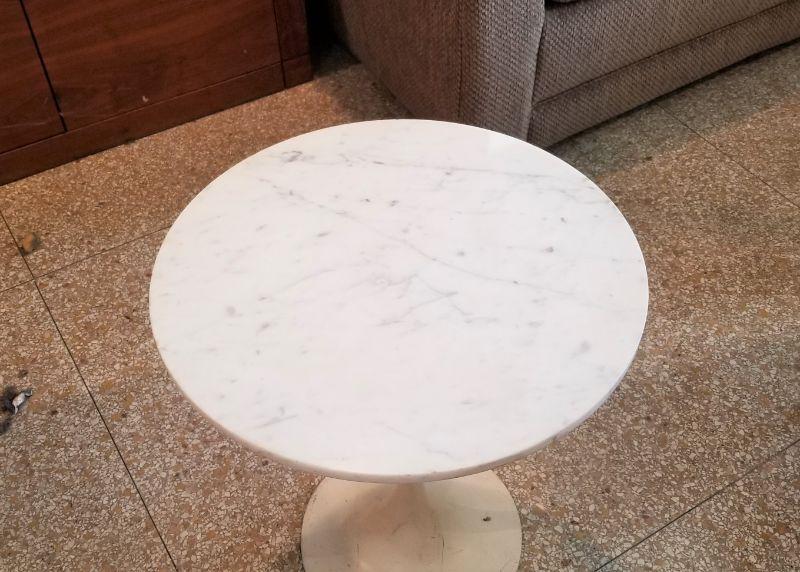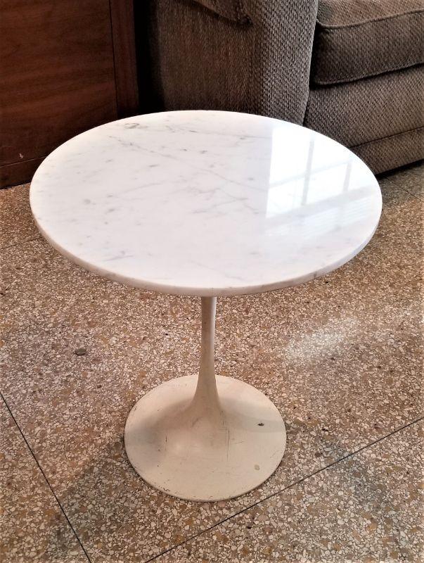 Unusual mix of old/new styling - vintage modernist table with white marble top - metal base. 18" across, 20" tall. Minor chipping around the edge (you can feel it with your fingers). Some scratches to base.