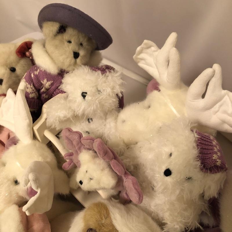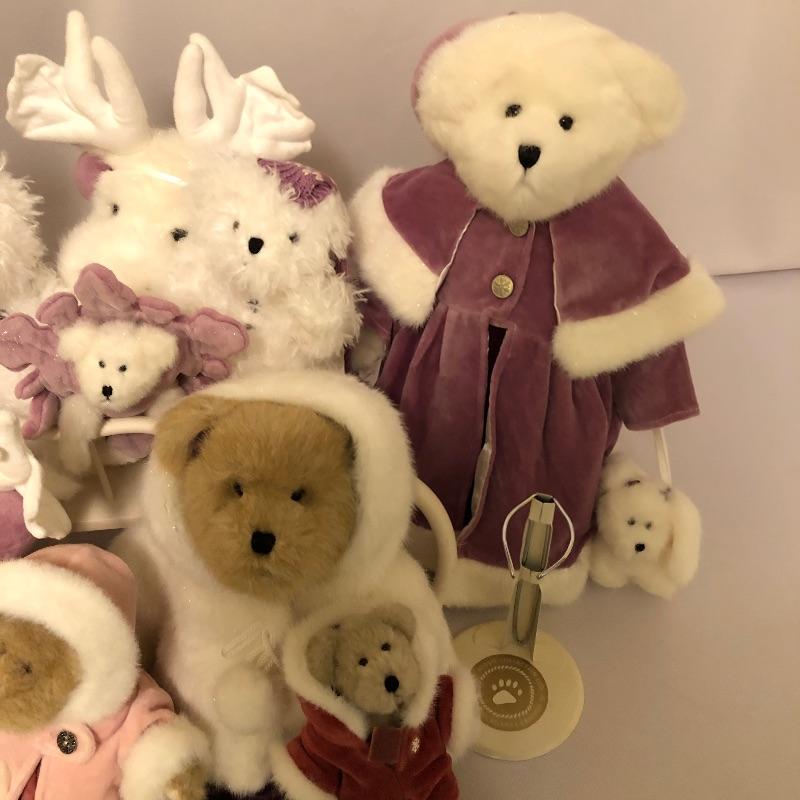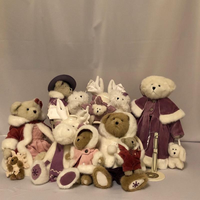This adorable collection of winter bears, winter moose, and of course little bears and a puppy is in good condition and comes with a Boyd’s bear sled and stand.